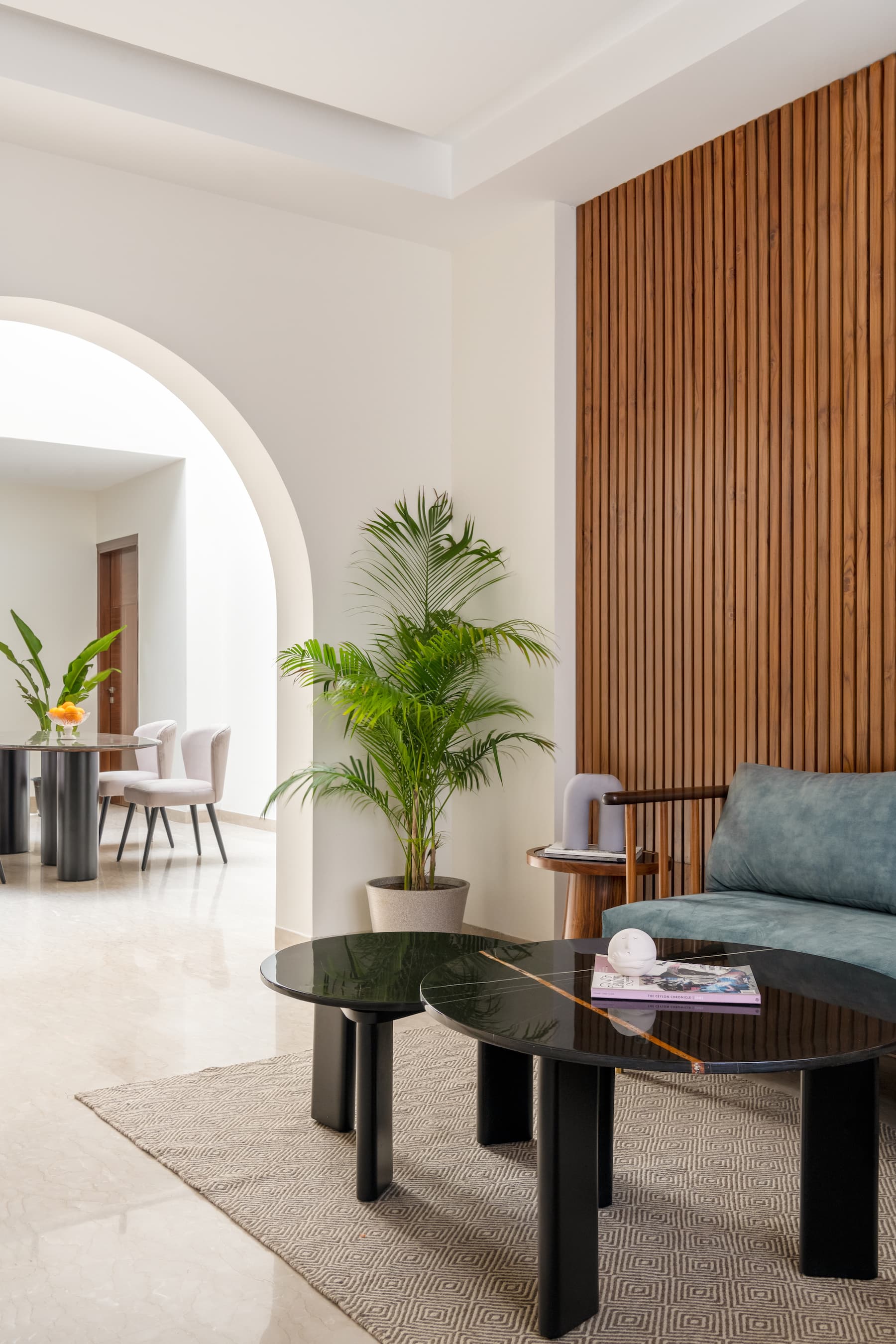 Staying true to Studio Dot’s authentic design ethos across various genres, the design upholds by mirroring the ambiance of the outside, and inside as well. The material palette of the design is minimalistic, allowing materials to revel in their truest form, straying from masking their effect through colored coats. The clean, white space is periodically punctured with a multitude of wooden finishes, the shades, and textures complementing each other’s form. Each room is provided with a subtle hint of varying definition through fluting styles, a careful selection of dark, well-stained stones; and hints of brass and coated mild steel elements. To further complement the effortless marriage of these materials, one can witness a light sprinkling of a bright selection of fabrics in each space. The essence of the residence shines through its details and integrities spread throughout the design. They start from the main gate itself, created as a semi-permeable casing following gentle curves, reducing the overpowering nature of the edifice. Inside the house, the details are sprinkled around, in the form of furniture elements. Through statement legs and a meticulous blend of materials, we introduce playfulness into the design.