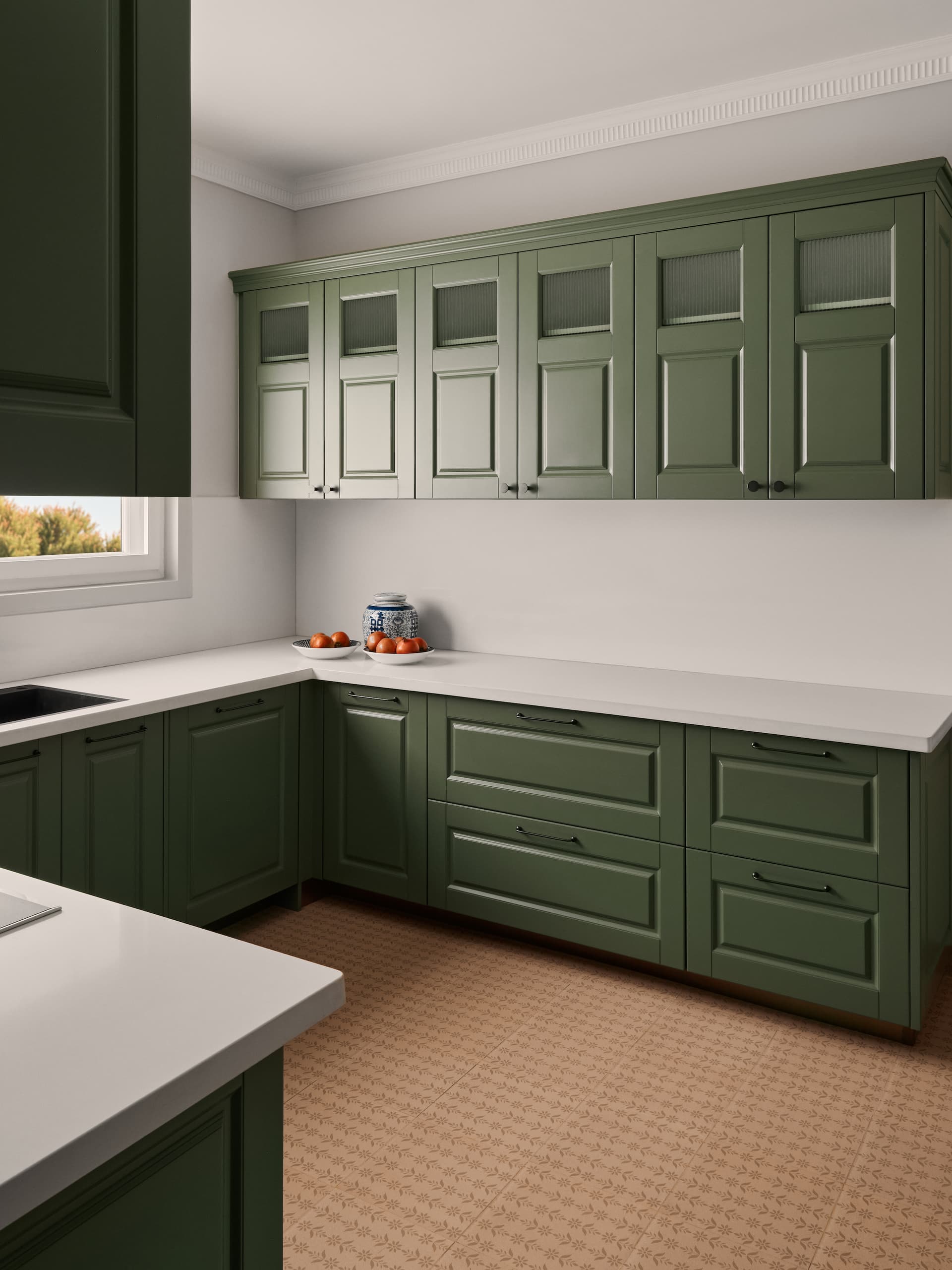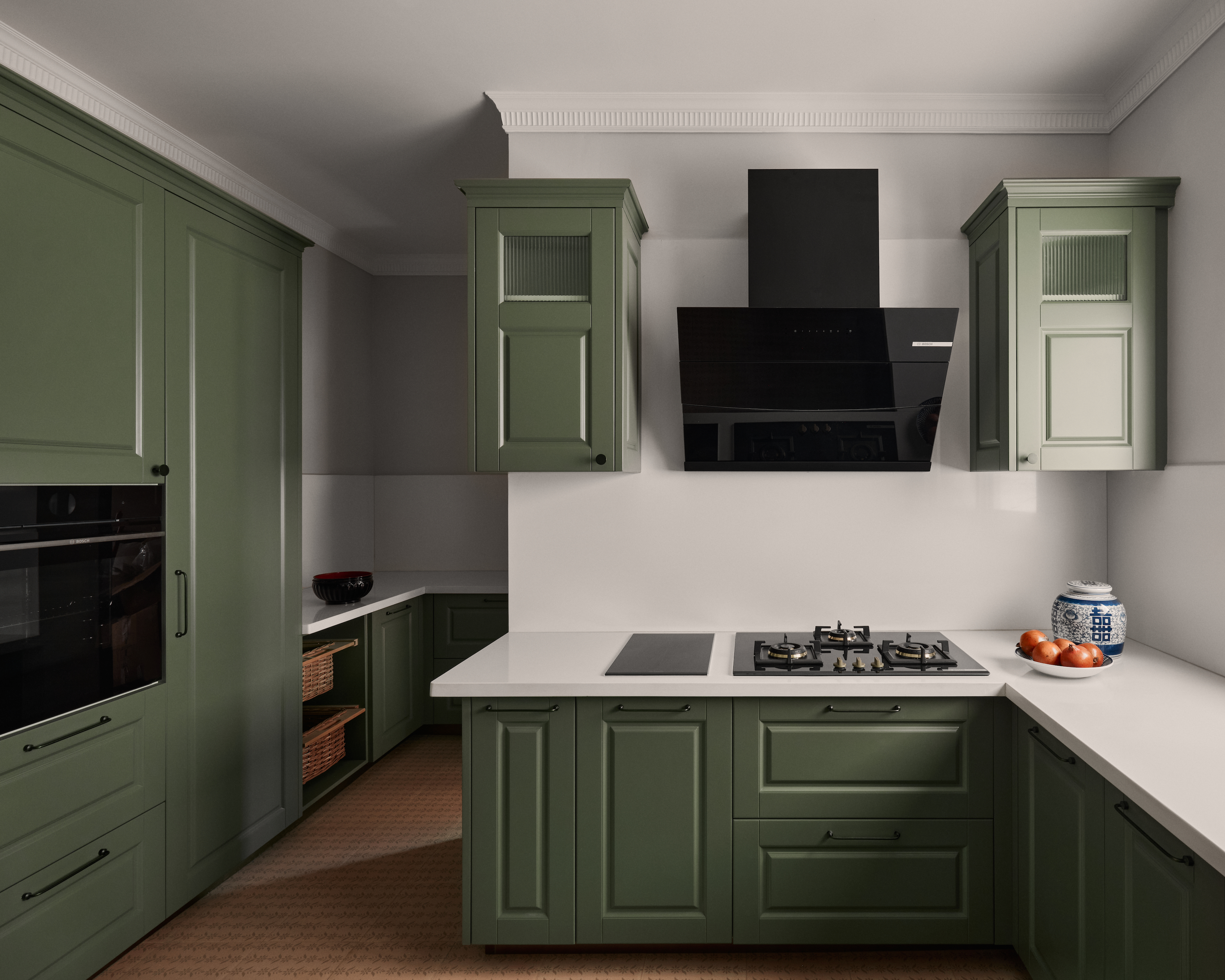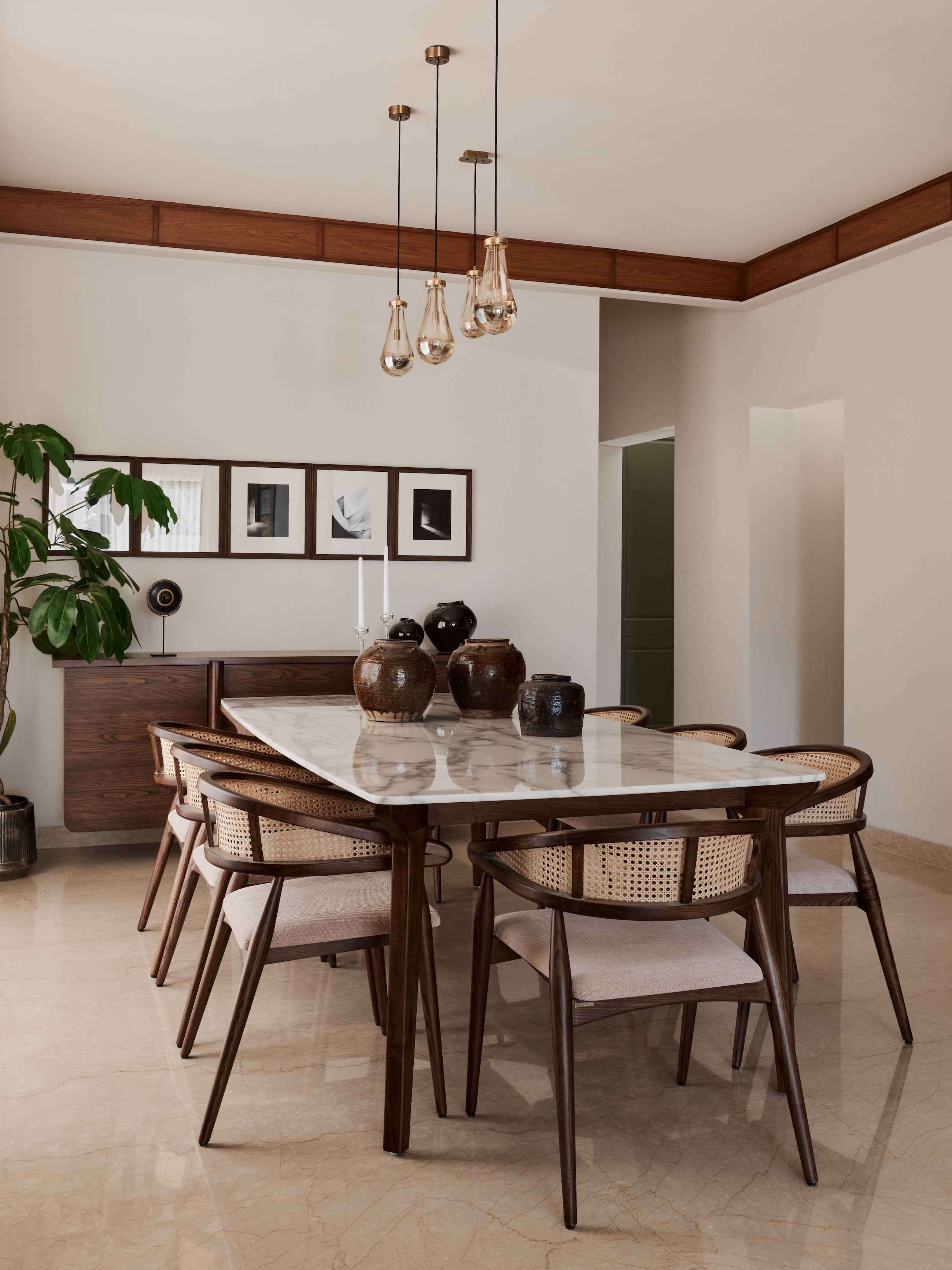 Dressed in green and white, the kitchen makes a comforting nod to the nature outside. The dining, on the other hand, brings together the traditional palette of woven cane and wood chair, with a modern marble tabletop. It is anchored together by sleek suspended lights.