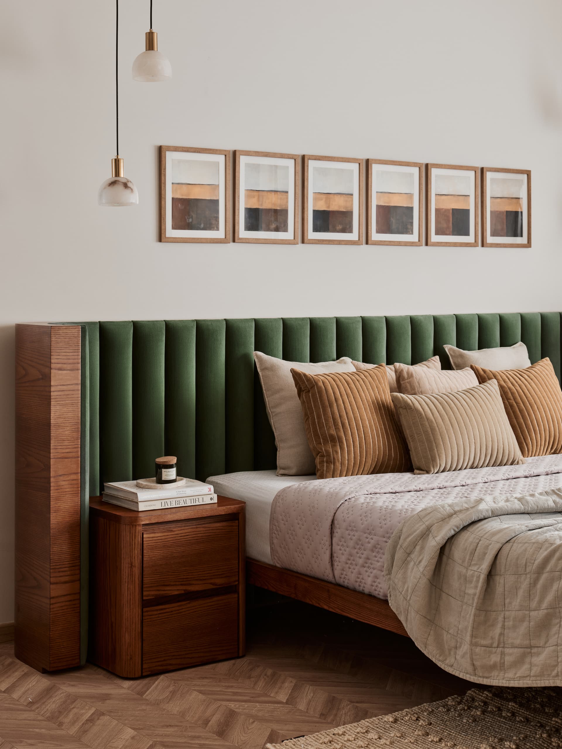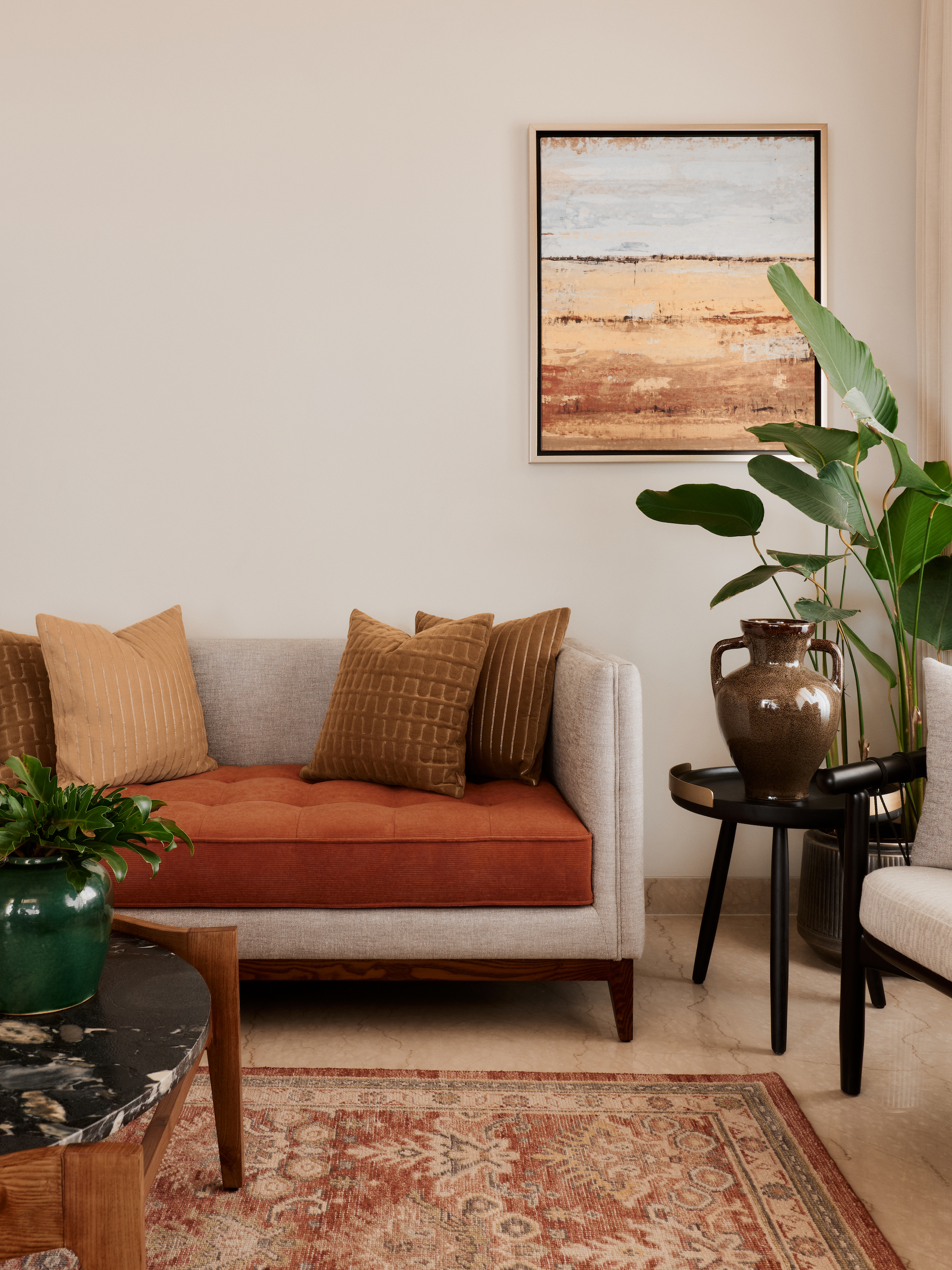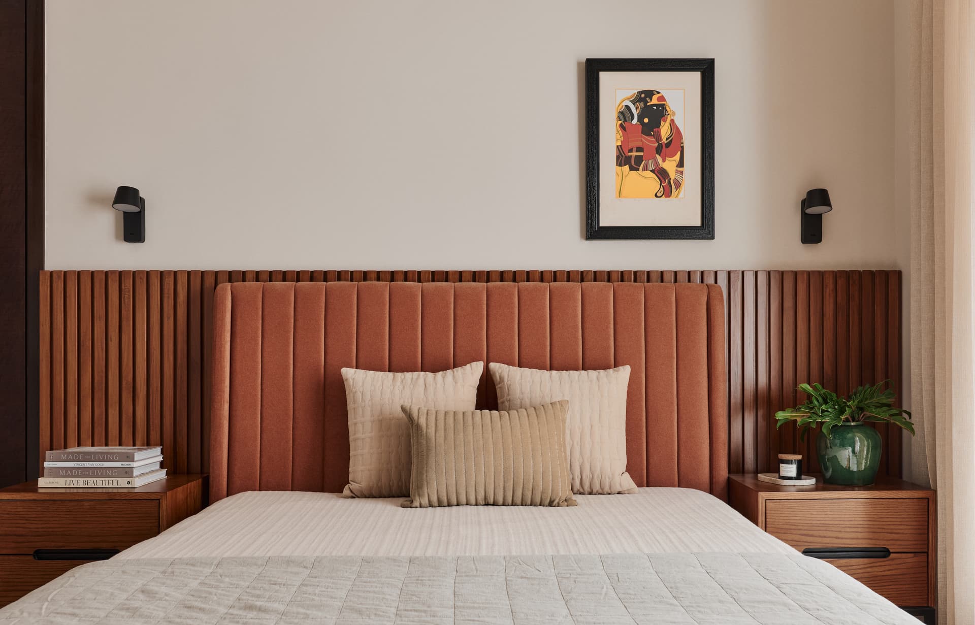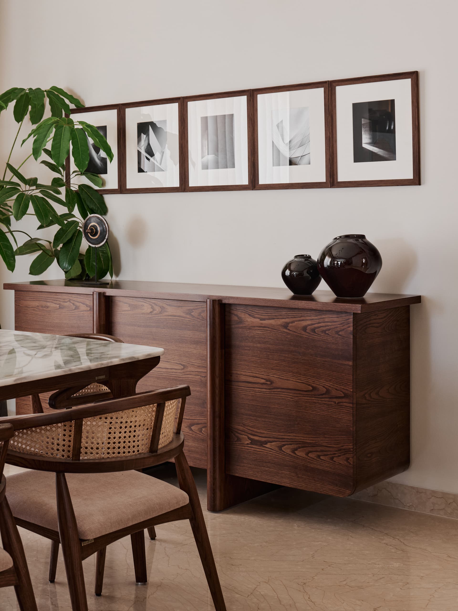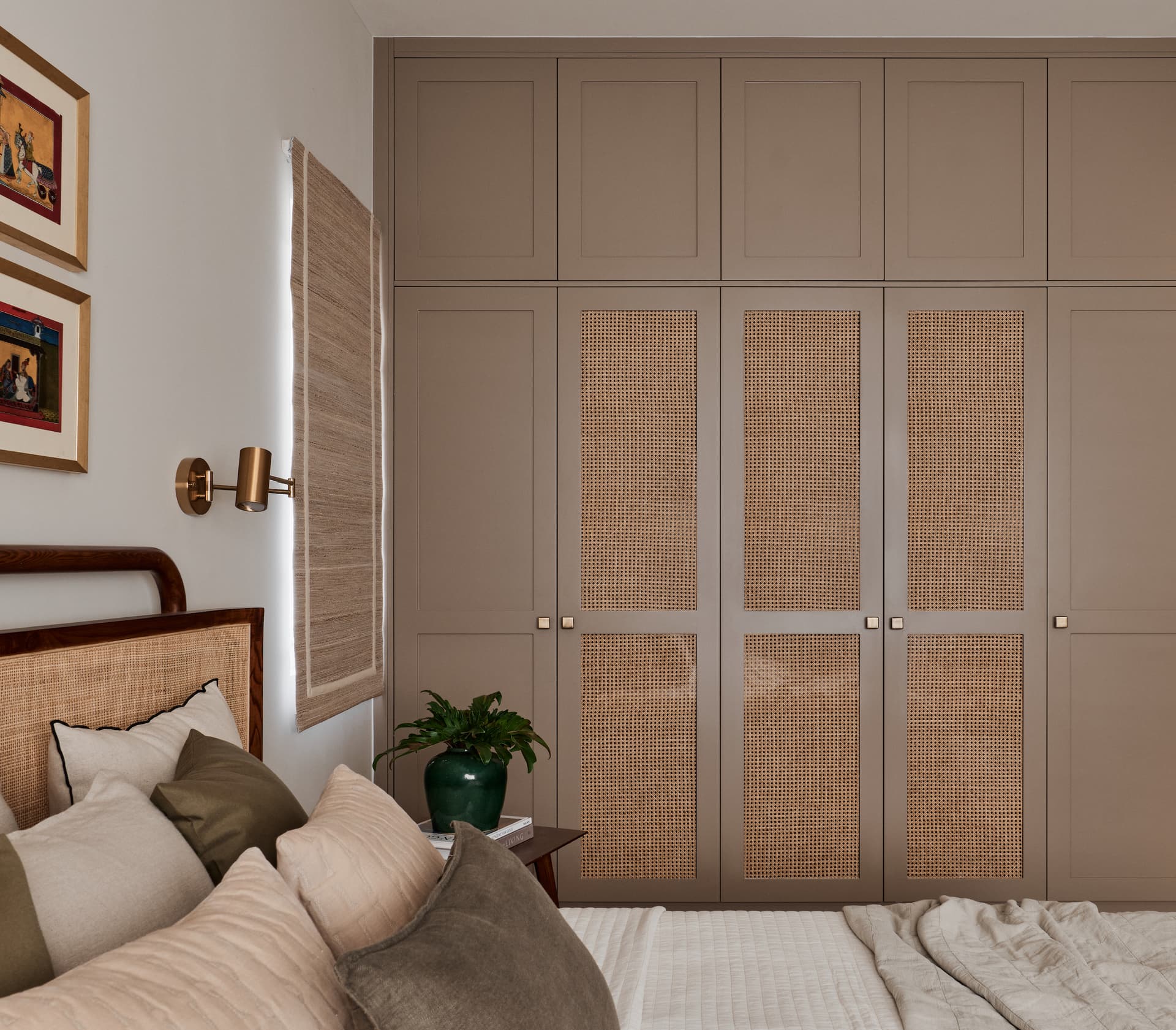 The bedrooms continued the theme, with muted tones and clean silhouettes. Wooden and cane detailing carried through, like a soft refrain in a familiar song, provides textural interest and visual continuity. In the master ensuite, a cane-woven headboard, wardrobe shutters and blinds attain a cohesive look, while in the second bedroom, the upholstered backrest extends on either side, wrapping the side tables in an embrace, just like a tree hugging you back. The guest bedroom, by contrast, achieves a minimal look with dark brown hues timber and white plastered walls. “Every design decision, from colours, furnishings to details were made with both intention and empathy,” says Manisha. “How would this feel to live in, day after day? How would this wear, age, and evolve with the people inhabiting it?” she adds.