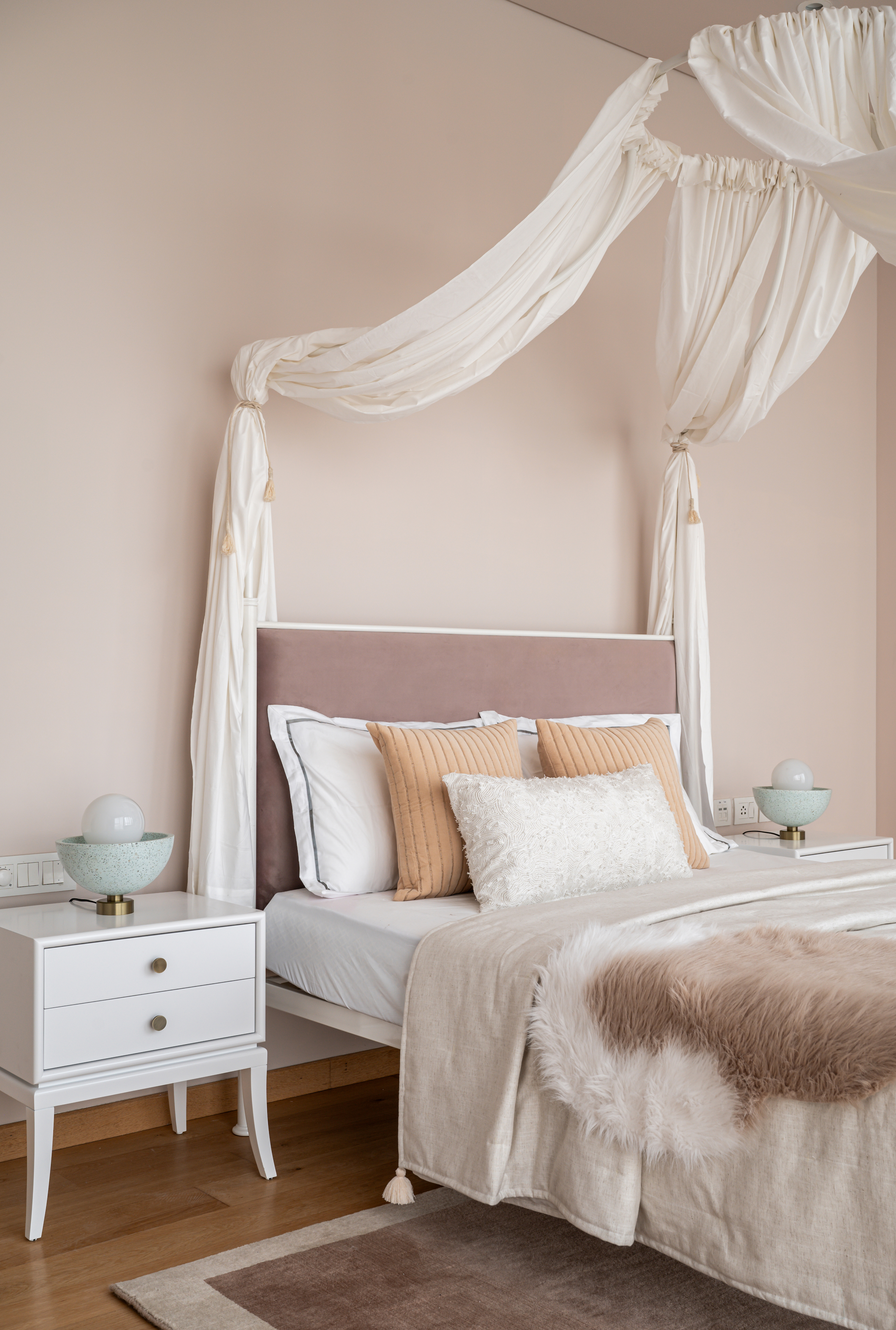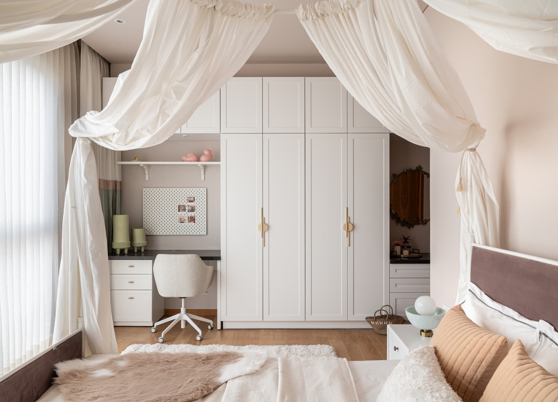 In contrast, the daughter’s bedroom is a whimsical sanctuary where imagination meets functionality. A canopy bed, draped in soft cotton curtains, introduces a dreamy aesthetic, tempered by a pragmatic approach to spatial planning. Designed to evolve with its young occupant, the space integrates a study nook, wardrobe, and dresser along a single wall, ensuring adaptability through the years. Sage green accents provide a playful contrast to the pristine white PU-finished surroundings, capturing a youthful yet sophisticated charm.