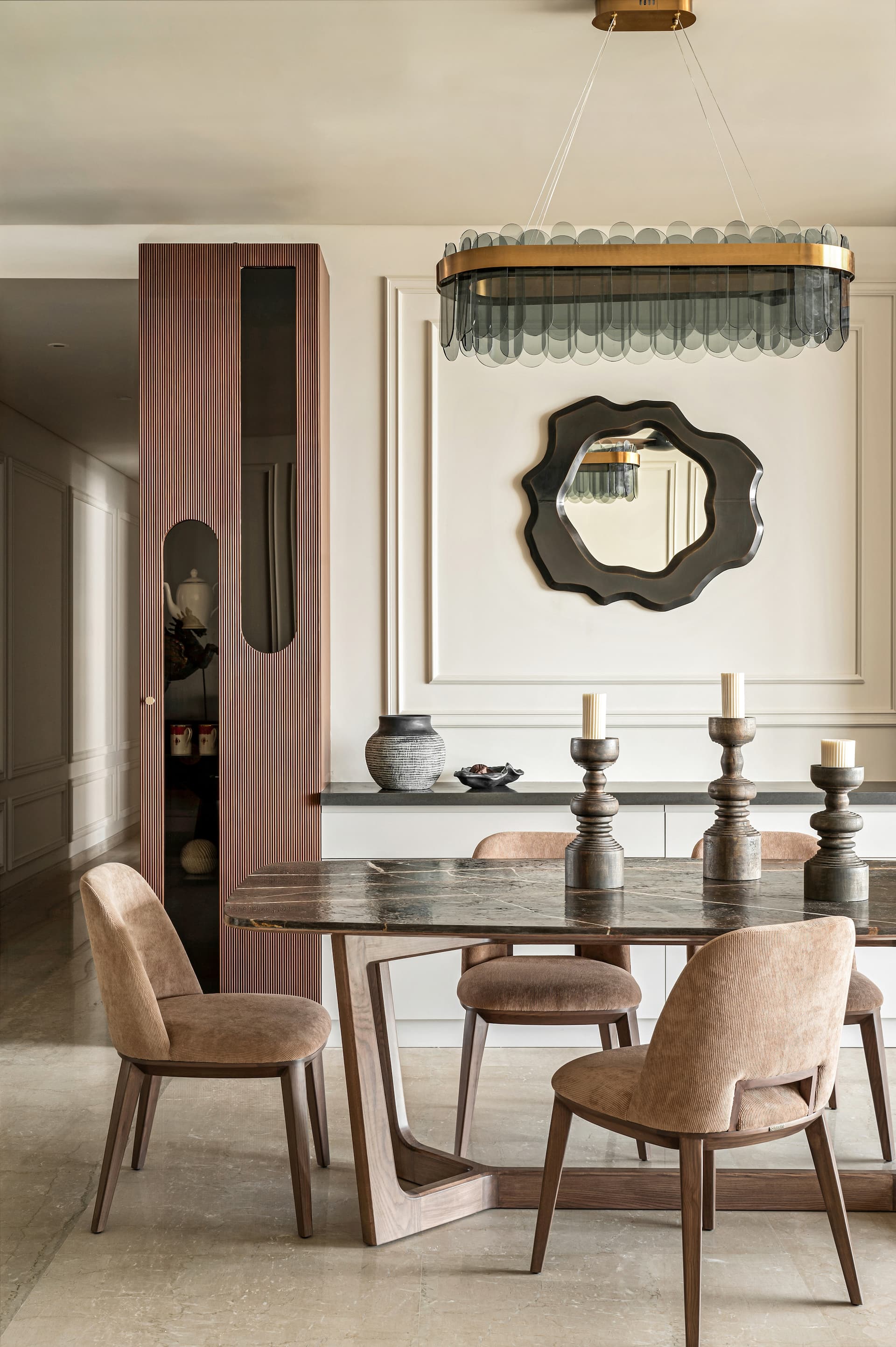 Seamlessly extending from the living room, the dining area embraces an open-plan ethos. A marble-topped dining table from Magari commands attention at its center, surrounded by plush suede chairs that exude both comfort and refinement. A suspended pendant light casts a warm, ambient glow, enriching the sensory experience of every gathering. Adjacent, a multifunctional storage unit—wrapped in a sophisticated medley of wood, grey, and gold—houses crockery, a buffet counter, and a Vastu-compliant pooja corner, seamlessly integrating practicality with cultural reverence. At its heart, an organic mirror from Sage Living disrupts the rigidity of structured lines, introducing an element of whimsical intrigue.
