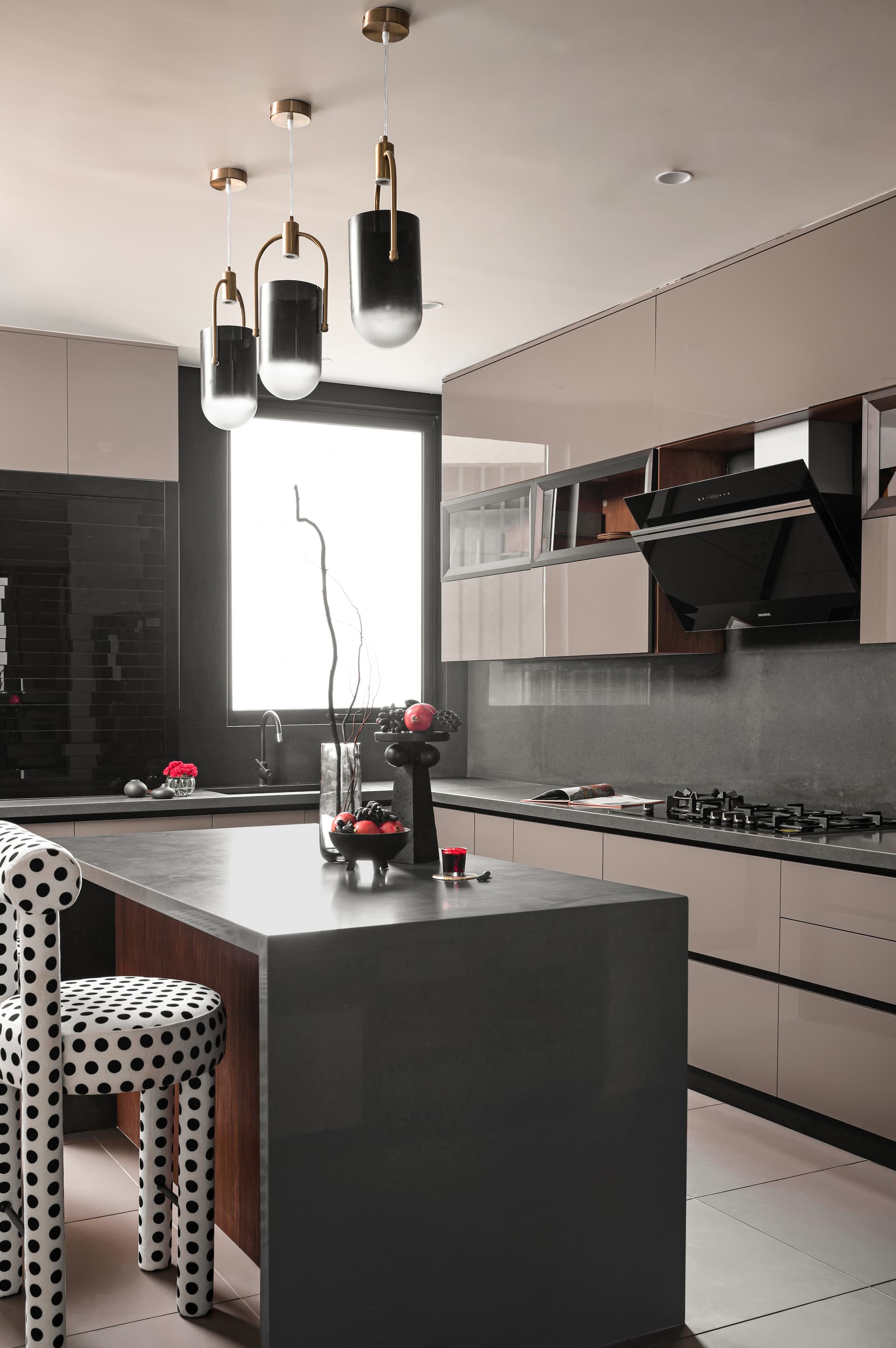 Reimagined as an island configuration, Ananta’s kitchen optimises space while fostering effortless interaction. Warm taupe handleless cabinetry reinforces the sleek, clutter-free aesthetic, complemented by grey quartz countertops that inject a note of contemporary finesse. Intelligent profile mechanisms ensure seamless functionality, making this a space where efficiency and elegance coexist harmoniously—whether for quick weekday breakfasts or leisurely weekend brunches.