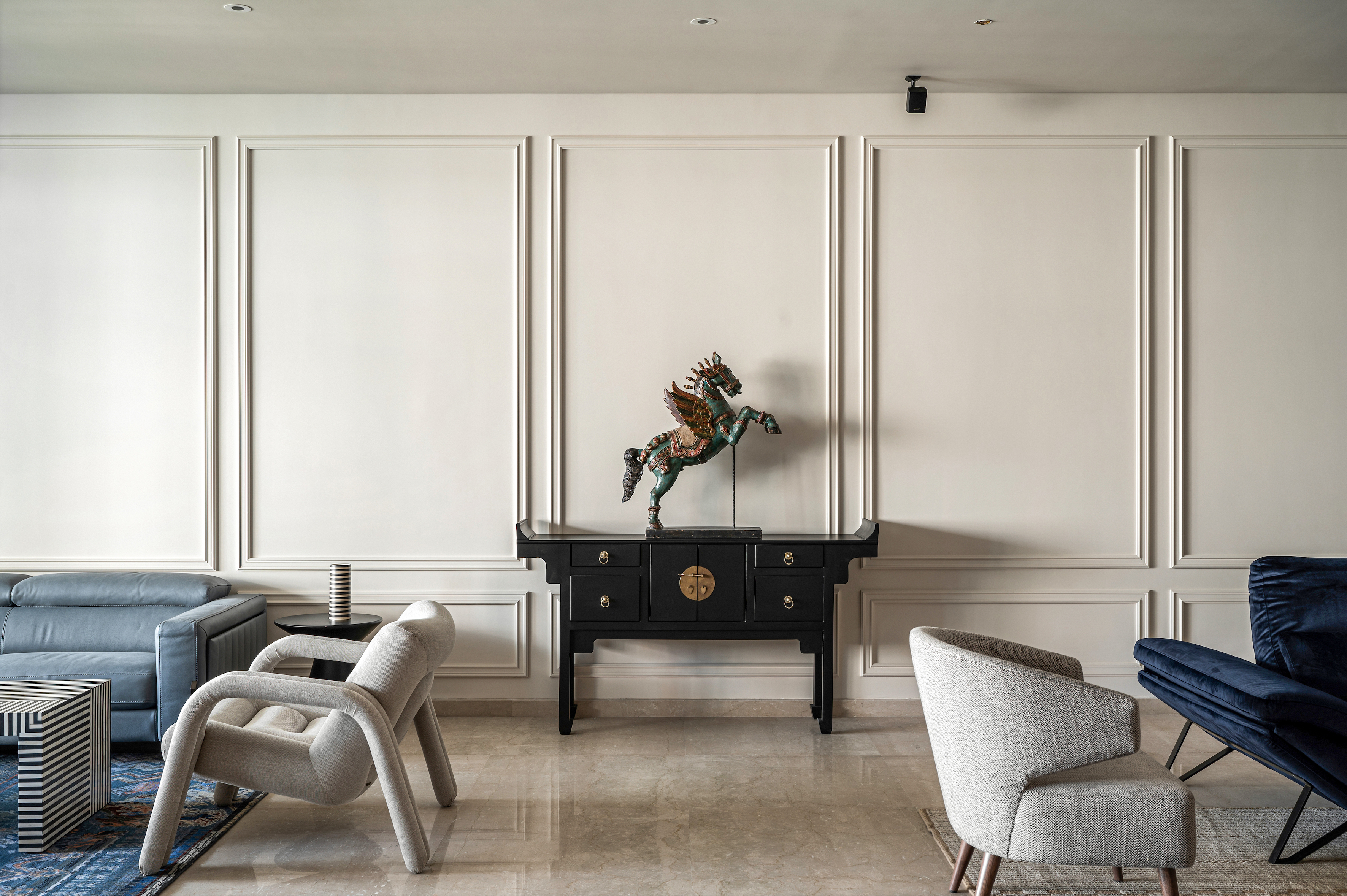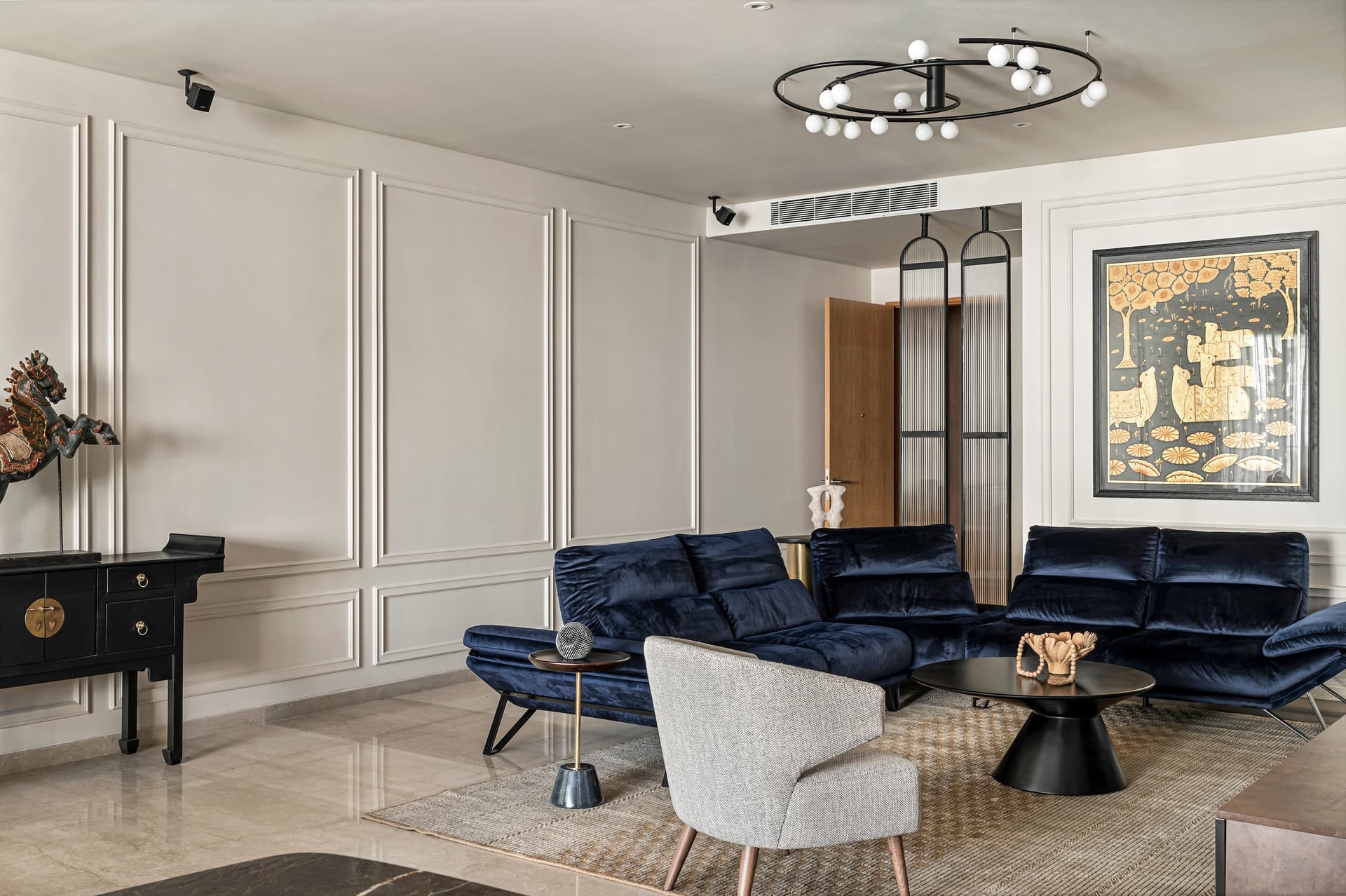 The lounge area champions both form and function, where sinuous, custom-made seating configurations balance understated luxury with tactile comfort. Anchored by a neutral palette, bold accents of deep blues and soft pinks punctuate the composition, further elevated by sophisticated black detailing. A striking pink onyx marble laminate forms the backdrop of the TV unit, its ethereal glow offset by the rich, hand-painted allure of a Pichwai artwork—a reverent nod to India’s artistic heritage. Wainscoted walls provide continuity, acting as a subtle bridge between past and present.