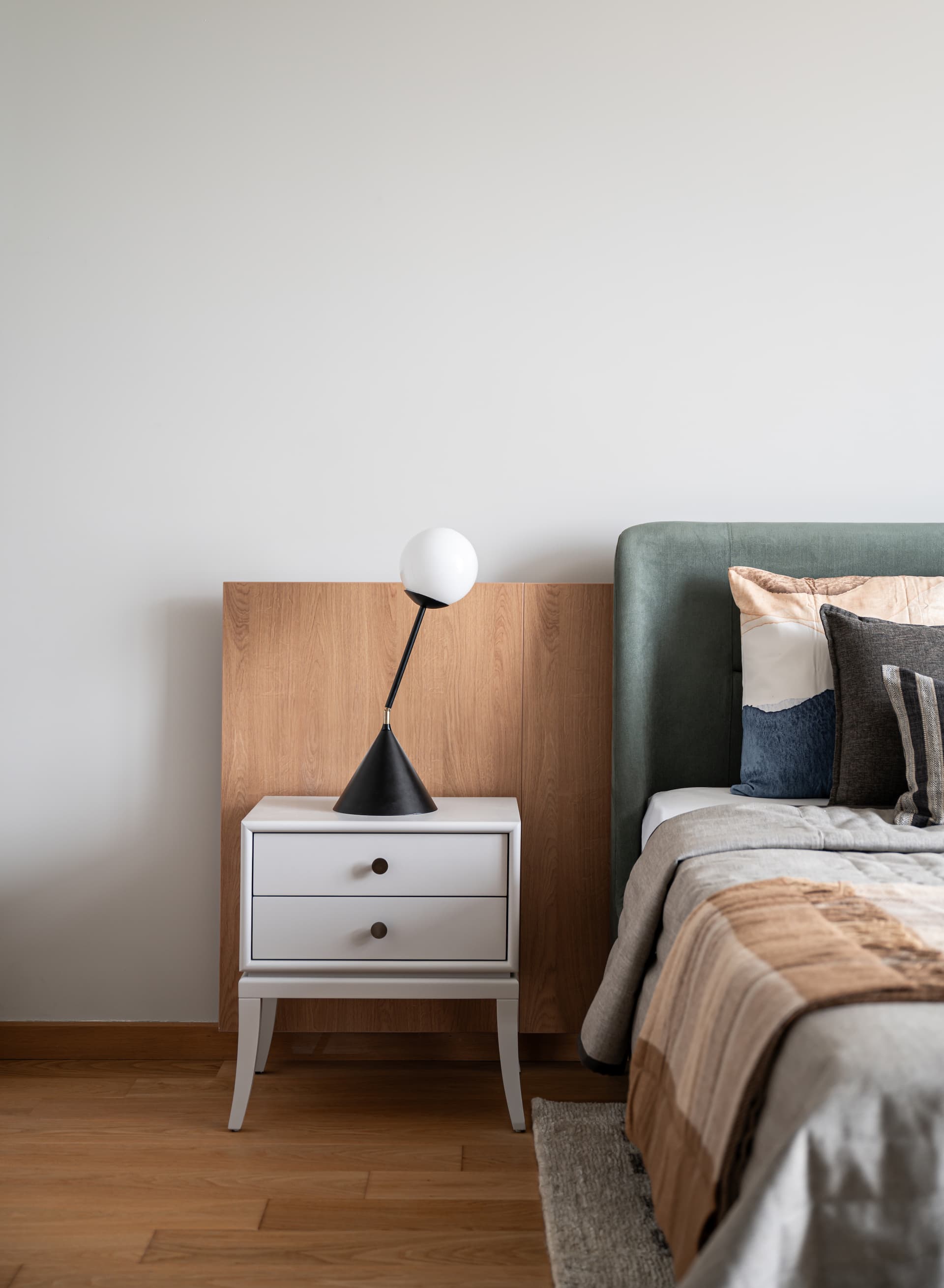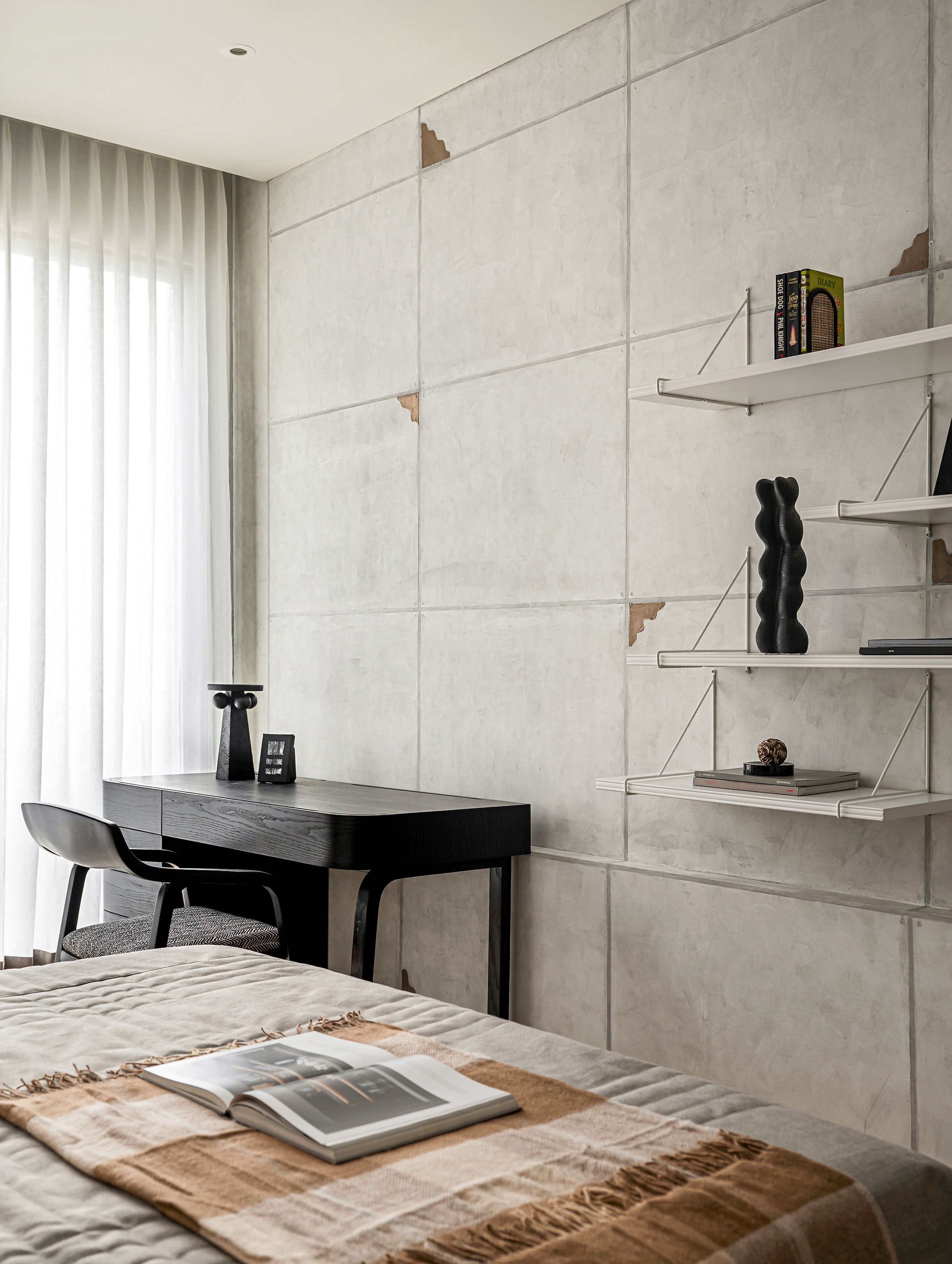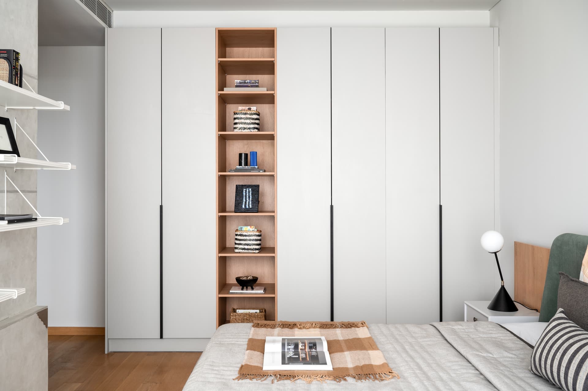 The son’s bedroom presents a fresh interpretation of grey, proving that the hue need not be synonymous with monotony. A bold green bed acts as a focal point, juxtaposing the otherwise neutral palette to create a balance between vibrancy and serenity. A streamlined study area, featuring floating shelves and a minimalist aesthetic, maintains an uncluttered atmosphere conducive to focus and creativity. The wardrobe, punctuated by centrally embedded oblong shelving, disrupts the monotony of solid blocks, infusing the space with lightness and dynamism.