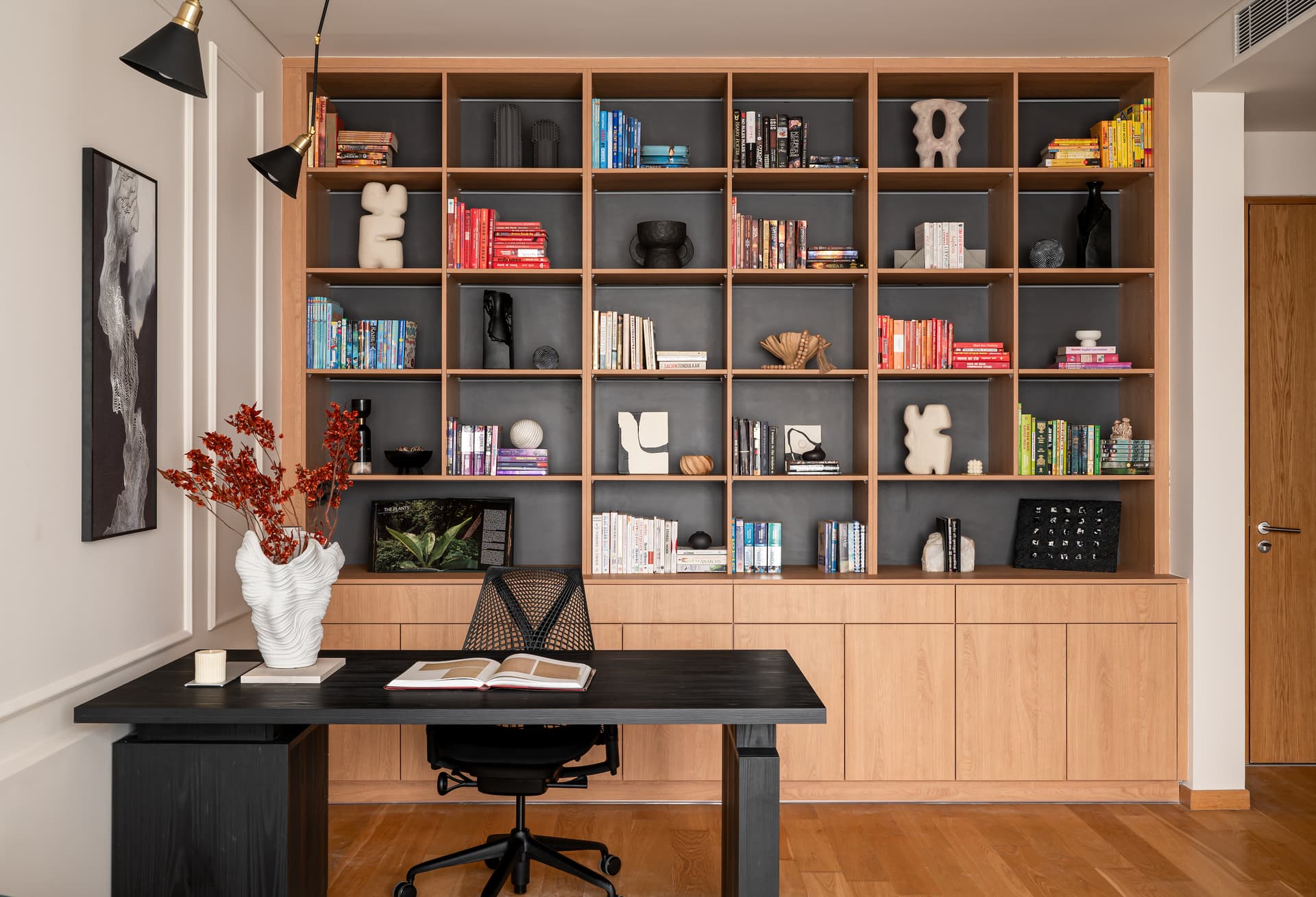 More than just a workspace, Ananta’s home office is designed as a sanctuary of thought and creativity. A full-length oakwood bookshelf anchors one side, imparting warmth and gravitas, while the opposing wall, clad in classic wainscoting, exudes understated grandeur. A black-stained wood desk, paired with a Herman Miller chair, forms the functional core, ensuring both comfort and productivity. Yet, the space transcends its utilitarian purpose. An emerald green sofa bed, positioned adjacent to a streamlined media unit, transforms the room into an intimate retreat. Above, a captivating painting of Varanasi by a local artist imbues the space with cultural authenticity, grounding the room in its Indian context.