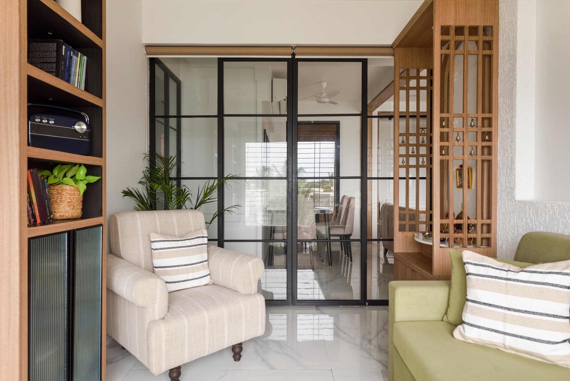 Integral to the den’s design is the inclusion of a mandir, meticulously positioned in accordance with the family’s Vastu consultant’s guidelines. This careful placement not only adheres to traditional principles but also infuses the space with a profound sense of cultural heritage and spiritual tranquility. The mandir serves as a focal point within the den, harmoniously integrating spiritual elements into the contemporary design, thus enriching the space with a serene and reflective quality. The den’s composition, with its blend of modern comfort and traditional reverence, ultimately creates a sophisticated environment that caters to both intellectual and spiritual pursuits.