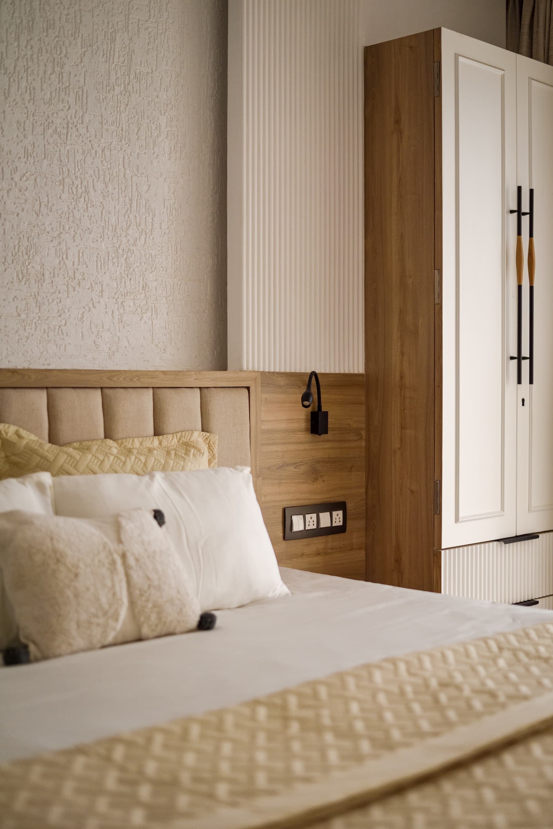The bedrooms are thoughtfully designed to provide a serene and personalised retreat for each occupant. Embracing the Japandi style’s emphasis on tranquility and understated elegance, each room features a harmonious blend of soft, neutral tones and natural textures. The master bedroom showcases a minimalist aesthetic with a streamlined platform bed and carefully chosen bedding in muted shades, complemented by wooden accents that add warmth and depth. The guest bedroom continues the theme with a refined palette , punctuated by a subtle pop of colour in the bedding to create a welcoming atmosphere.