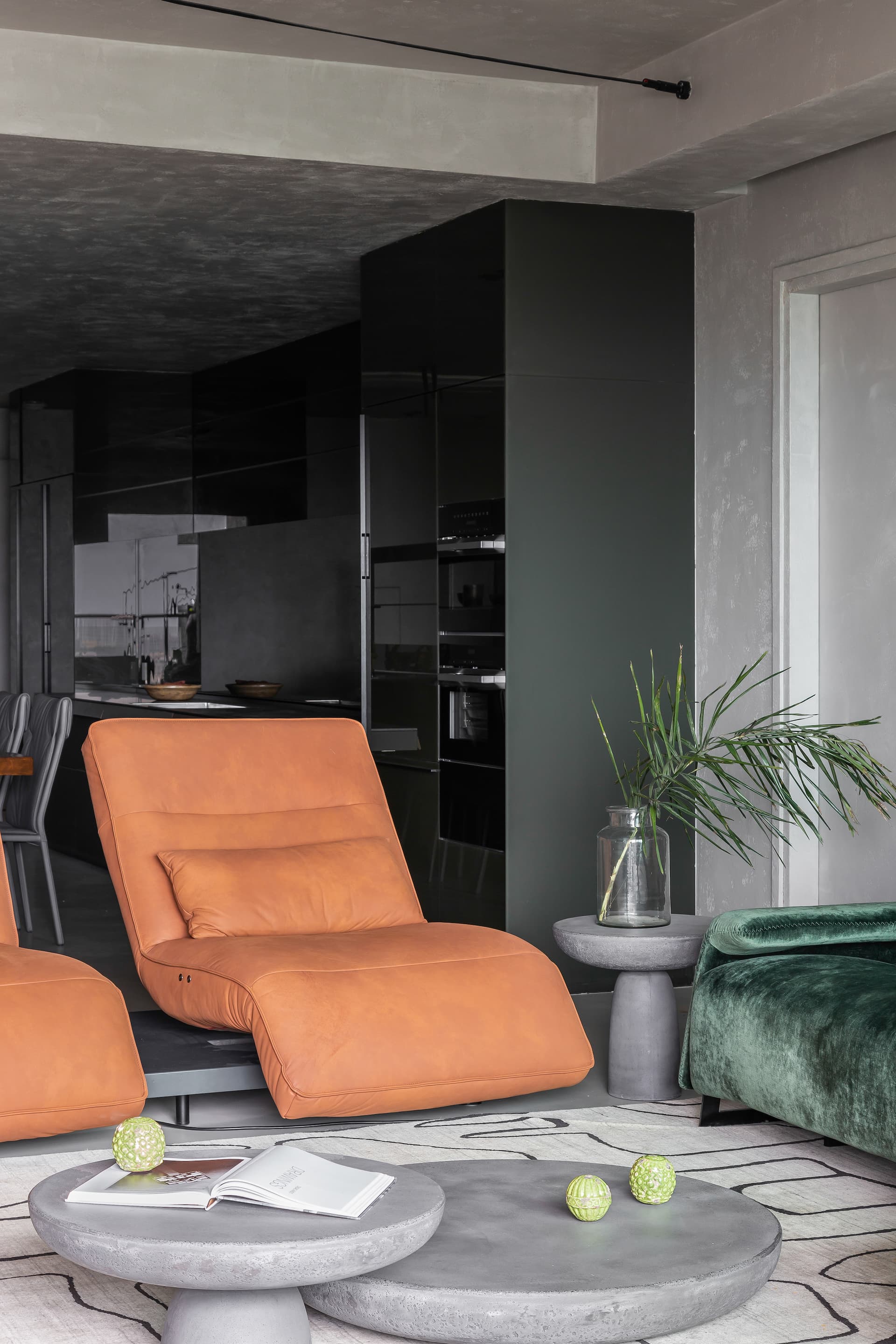 The foyer immediately sets the tone: a clean, monolithic bench—crafted in microtopping—appears to emerge from the wall, blurring boundaries between furniture and architecture. A small, contemplative seating corner with darker tones mirrors the hues of the cladded walls, creating a monochromatic stillness that encourages one to pause and breathe.