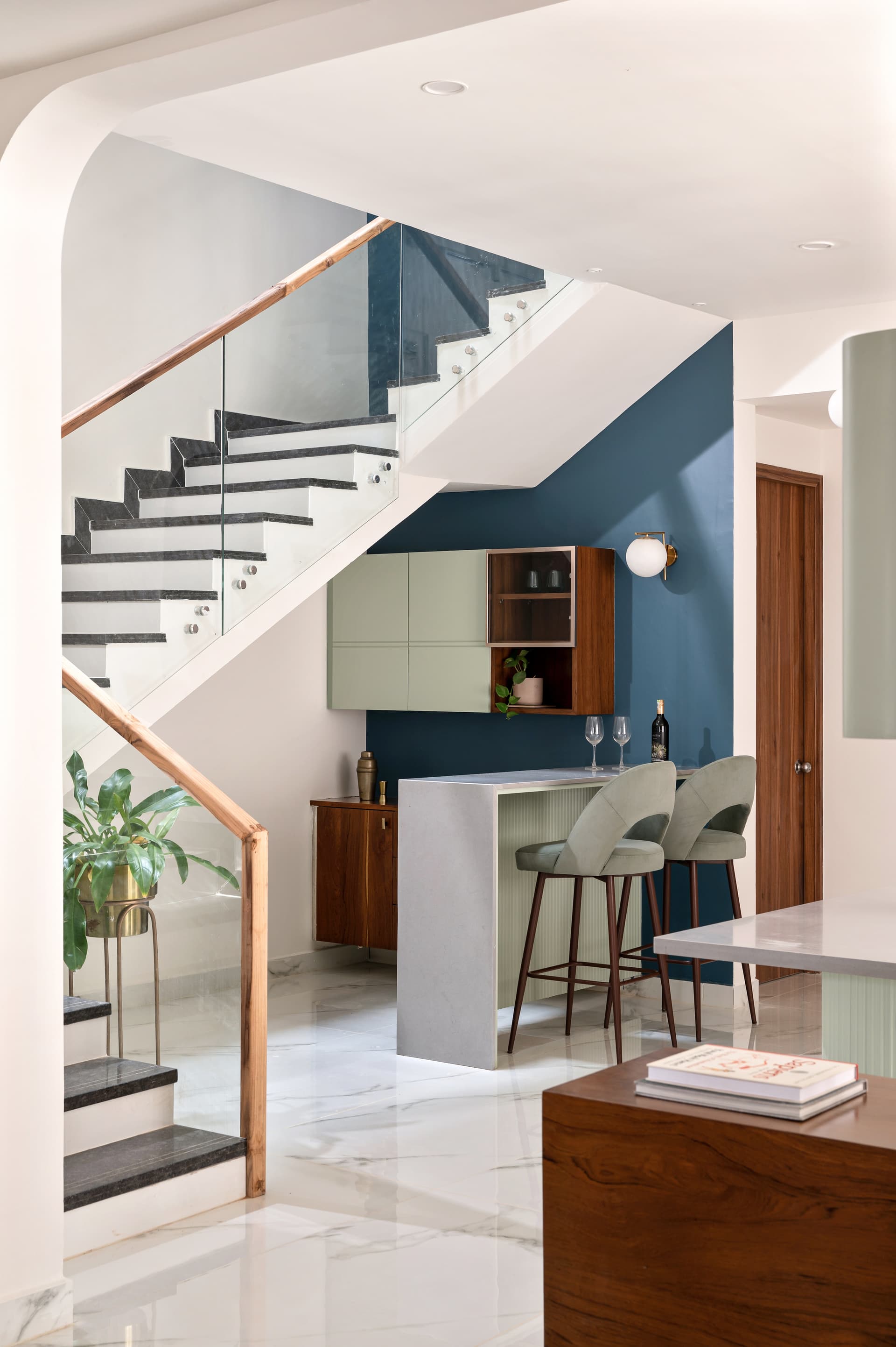 Nestled ingeniously beneath the staircase, the Bar Area exemplifies ingenious space utilization and a seamless design continuum within this remarkable home. This corner not only optimizes the available space but also maintains a stunning aesthetic cohesion with the rest of the interior. The carefully orchestrated design allows the Bar Area to effortlessly merge functionality and elegance. It serves as a captivating testament to how even the most unconventional spaces can be transformed into captivating focal points.