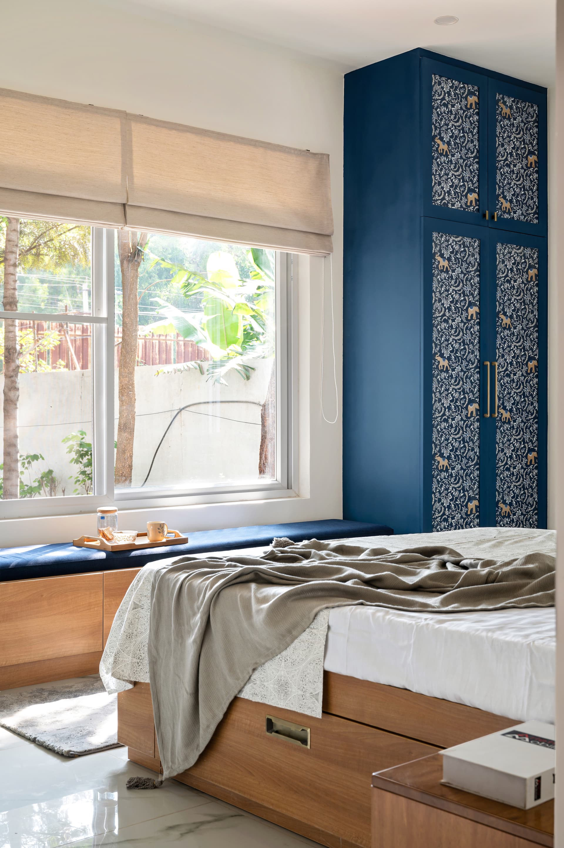 A harmonious color palette of whites and rich browns is punctuated by delightful pops of calming blue in one of the Bedrooms. The careful selection of colors creates an ambiance that is both inviting and soothing, making this room a true sanctuary. A window seating nook graces the space, providing not just an element of comfort, but a cozy corner for contemplation and relaxation. The functional elements of the room seamlessly integrate style and utility, with the dressing area and study table boasting a sleek and minimalist design that exudes modernity. However, it’s the walk-in wardrobe that truly captures attention—a masterful composition of blue panelled shutters and elegant golden handles. This infusion of sophistication adds a touch of glamour to the practical aspects of the room, demonstrating a meticulous attention to detail that defines the essence of this captivating dwelling.