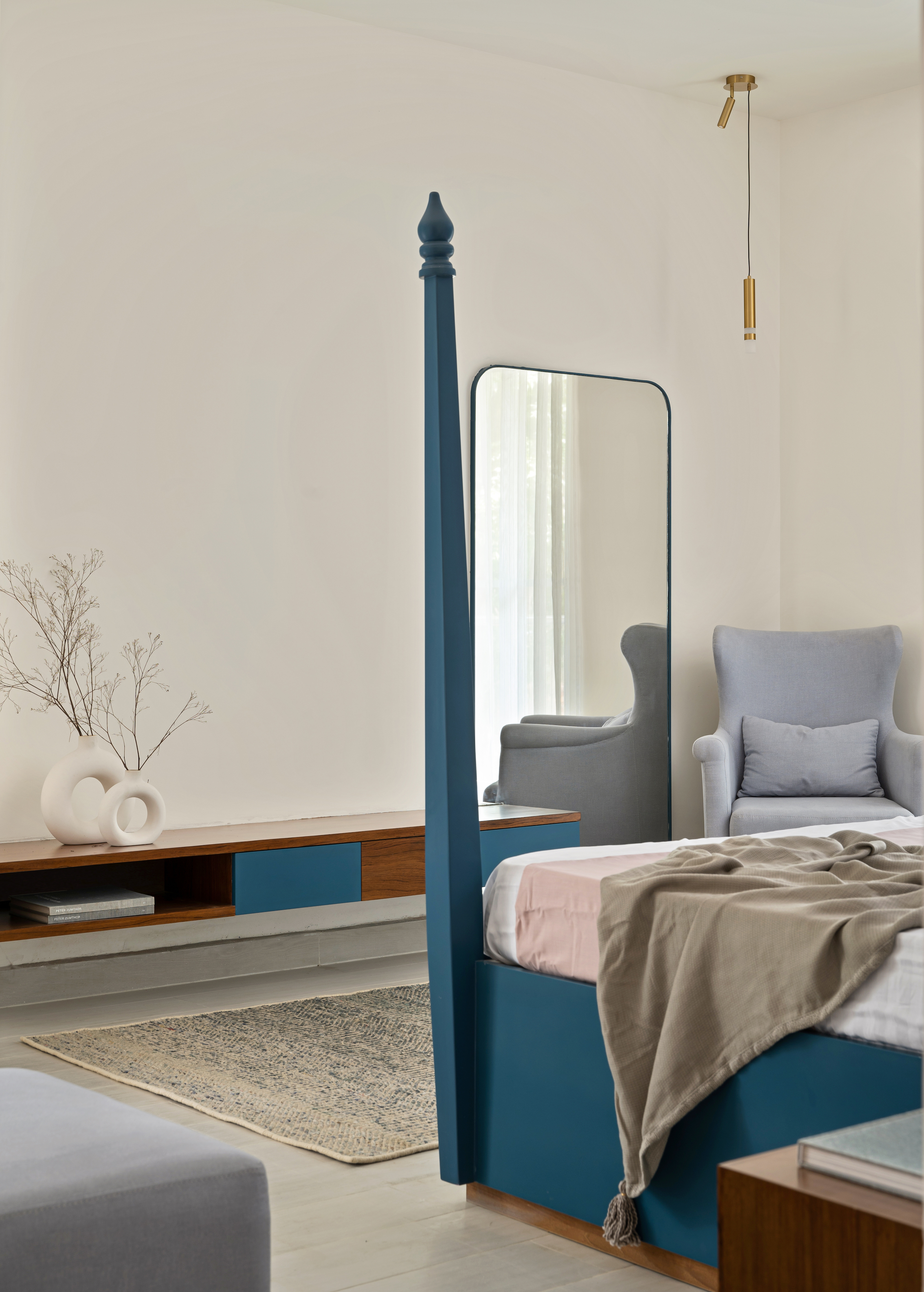 The third bedroom is a haven of tranquility and style. A stunning four-poster bed takes center stage, its elegant blue hue commanding attention and setting the tone for the space. Against this backdrop, a carefully curated color palette unfolds, featuring a delicate interplay of cream and soothing wooden shades, punctuated by occasional pops of the same calming blue. The seating area introduces a subtle touch of grey, seamlessly blending comfort with sophistication. Every detail has been thoughtfully considered, from the accessories adorned with delicate gold accents to the handles that exude a subtle sense of luxury. This room encapsulates a perfect fusion of design elements, where colors, textures, and furnishings come together to create an oasis of elegance, making it a retreat that harmoniously combines relaxation and aesthetics.