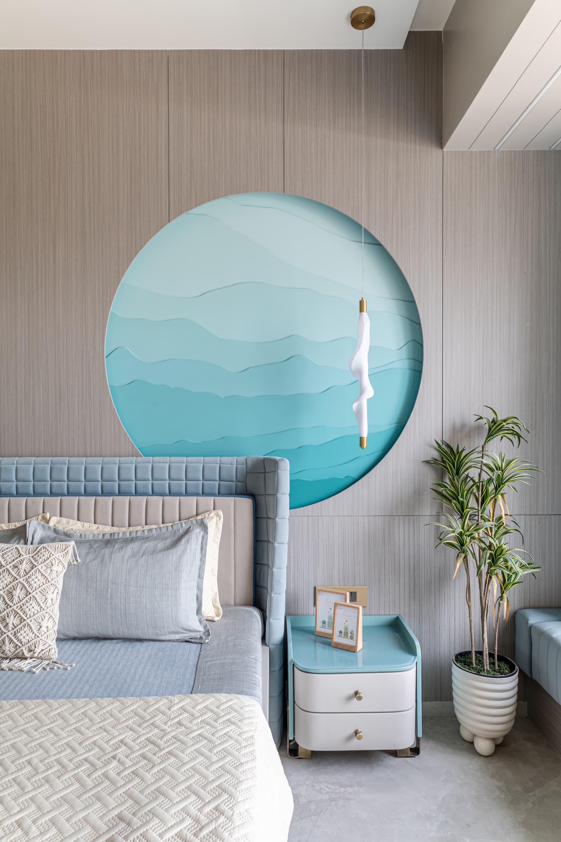 In contrast, the Parents’ Room embraces a Wabi-Sabi theme, featuring a serene white and wooden aesthetic. The space is elegantly grounded by its monochrome colour scheme, where soft white walls and natural wooden accents create a harmonious and balanced atmosphere. The wooden elements, including the intricate bed back paneling and concealed handles on the cabinetry, contribute to the room’s understated elegance. The bed’s curved back panel, with its gentle contours, adds a touch of grace and fluidity, enhancing the room’s overall tranquil vibe.