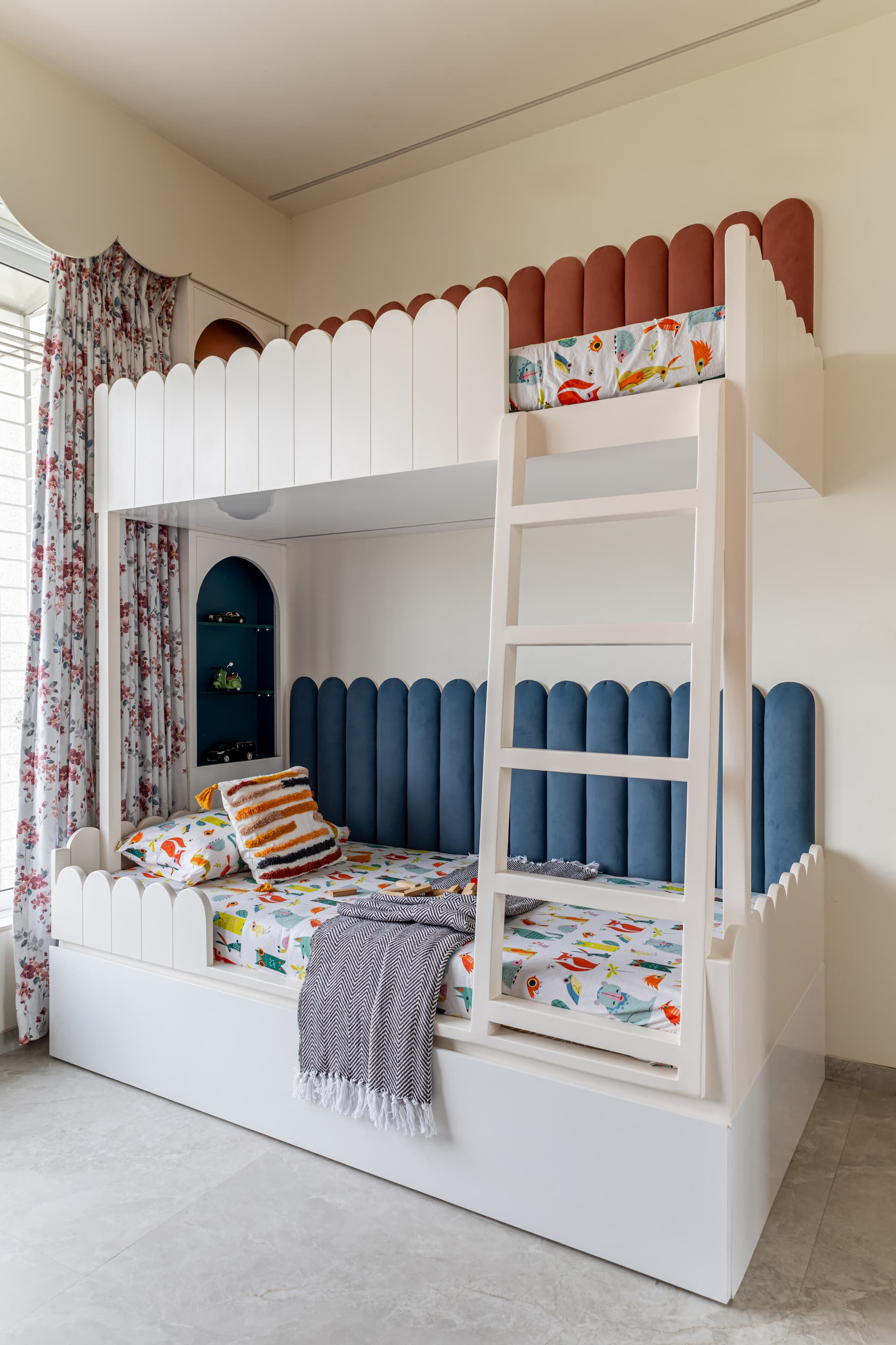 The Kids’ Room is a delightful blend of playful charm and practical design, meticulously crafted to cater to both fun and functionality. At the heart of this vibrant space is a cleverly designed bunk bed, which not only maximises floor space but also incorporates additional storage solutions, ensuring the room remains clutter-free.