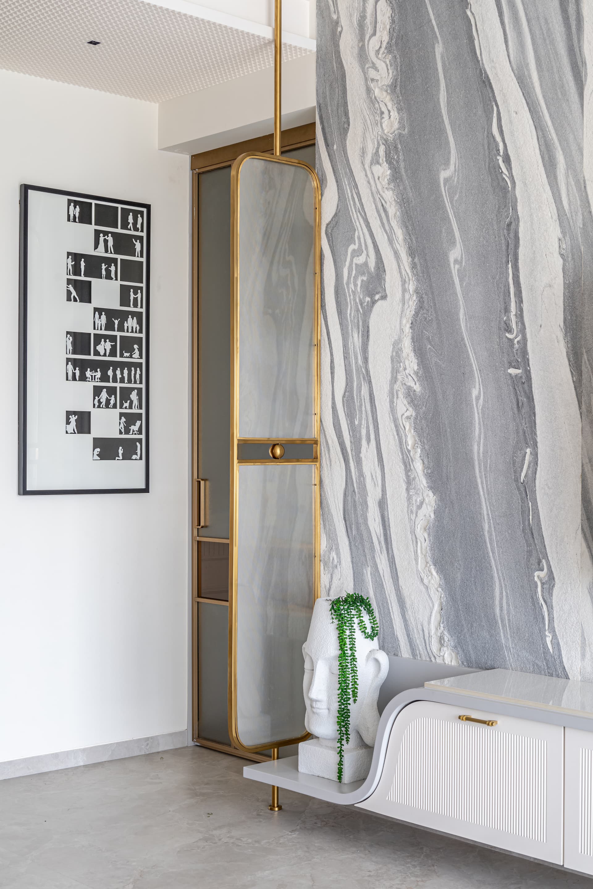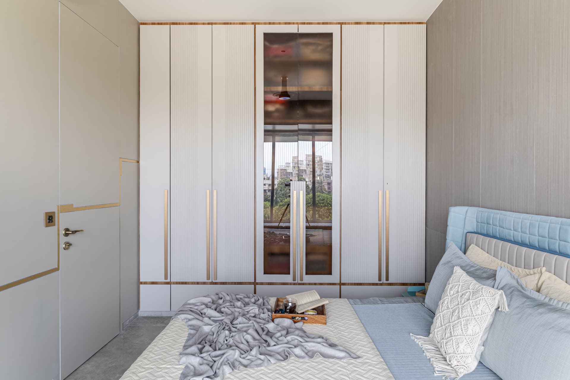 A striking feature of the Bedroom is its hidden doors, which blend seamlessly into the room’s walls to maintain an unbroken visual flow. These concealed doors add a layer of intrigue and sophistication, enhancing the room’s modern, minimalistic appeal. The wardrobes, crafted with precision, feature NR glass centers framed in rich wood and accented with elegant brass handles. These elements, along with the full-height shutters, not only contribute to the room’s verticality but also exude a sense of refined luxury.
