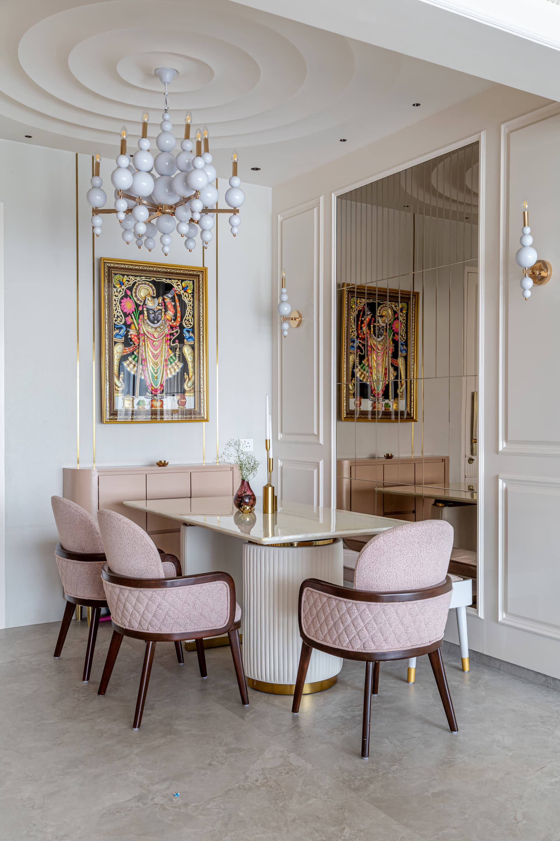 The Mandir Room offers a serene space for spiritual reflection, blending traditional and modern design elements seamlessly. The calming white color scheme and minimalistic approach set a peaceful tone, while traditional jali-style doors with pocket shutters and indirect lighting cast beautiful shadows, enhancing the room’s tranquil ambiance. The backdrop features an OM symbol with backlighting and a mother-of-pearl acrylic finish, adding a touch of spiritual elegance. Drawers adorned with intricate elephant engravings further elevate the room’s regal and serene atmosphere.