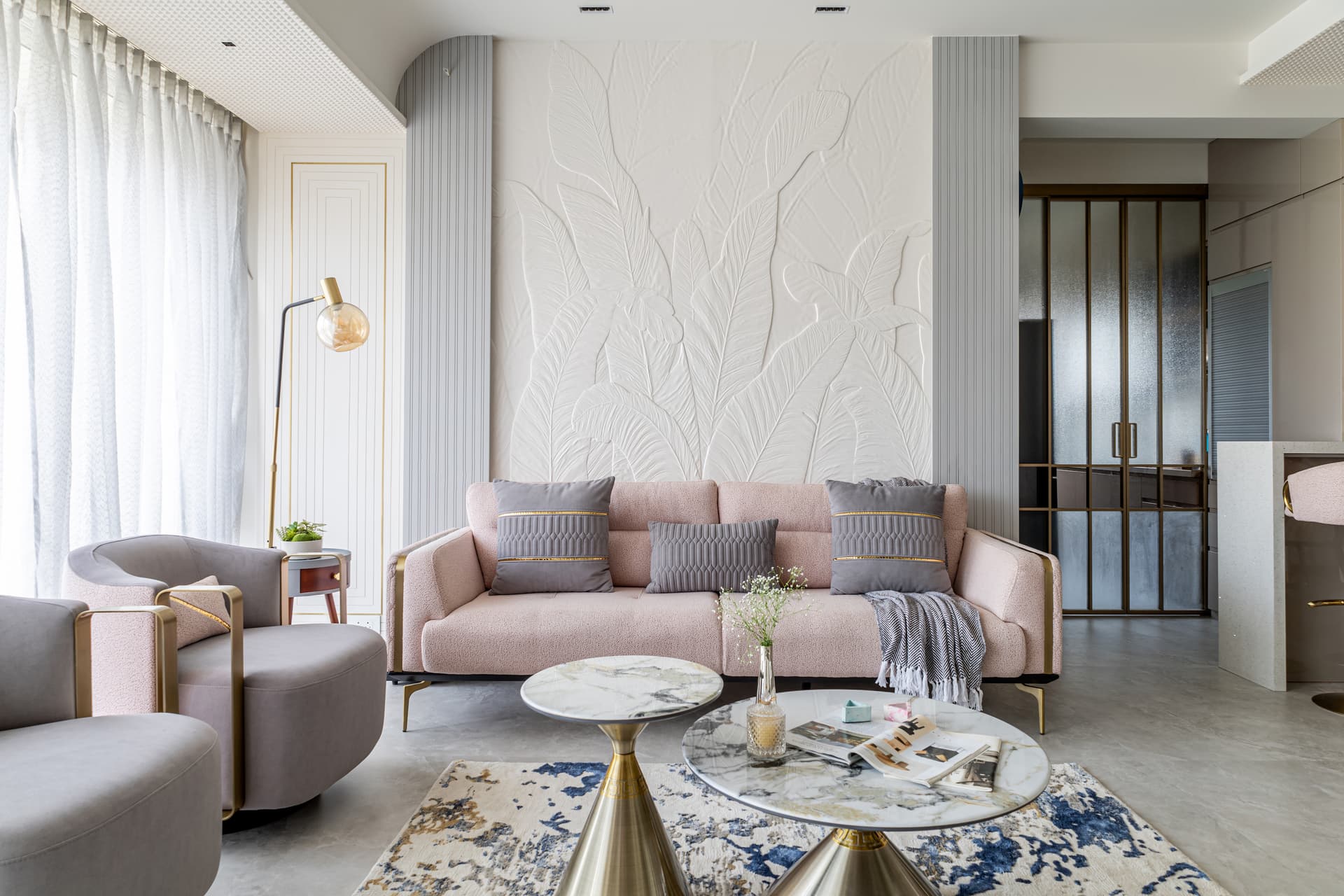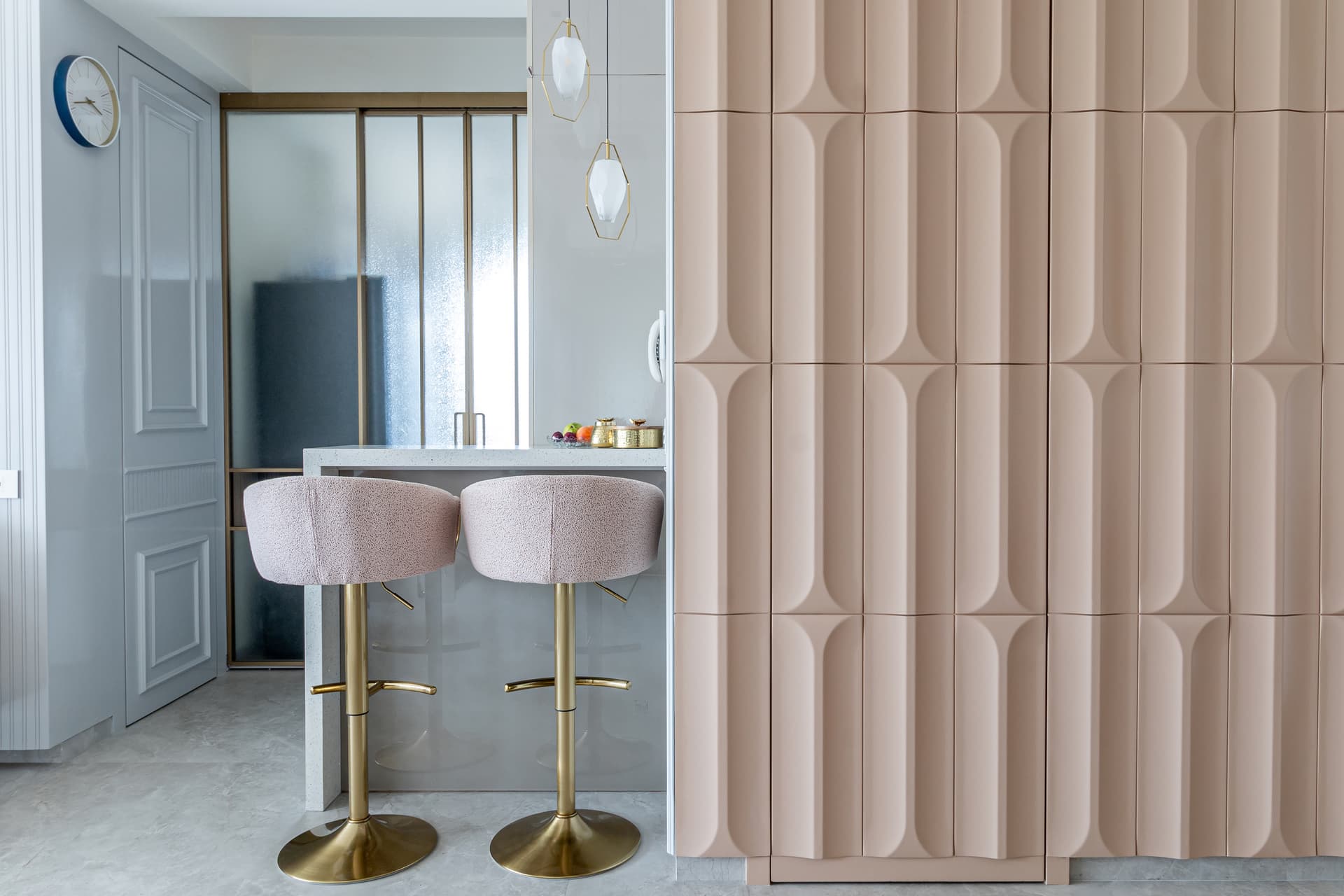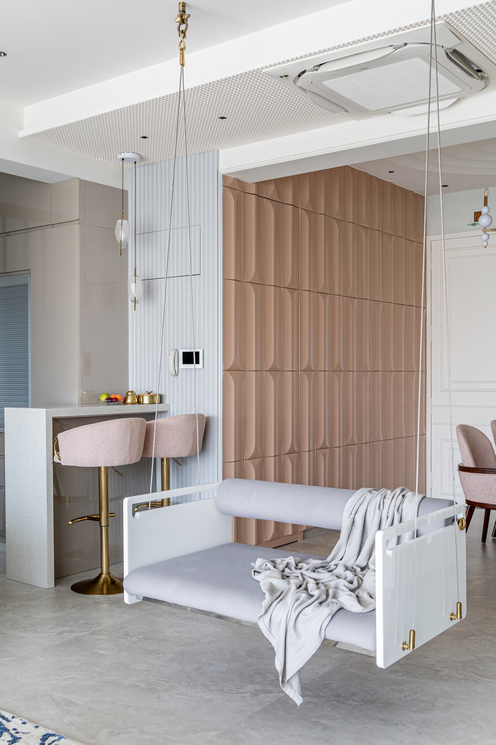 The heart of this home is the living room, strategically positioned at the center of the four bedrooms to foster a sense of connectivity and openness. Natural light pours in through a large full-height window, enhancing the space’s airy and welcoming atmosphere. A striking bespoke swing, a favorite among all who visit, serves as the centerpiece of the living and dining area. The TV wall is elegantly clad in stone veneer, offering a seamless, clean look that complements the room’s modern design. Adorning the sofa back wall is a feature wall with intricate leaf carvings illuminated by indirect lighting, adding a touch of sophistication and warmth.