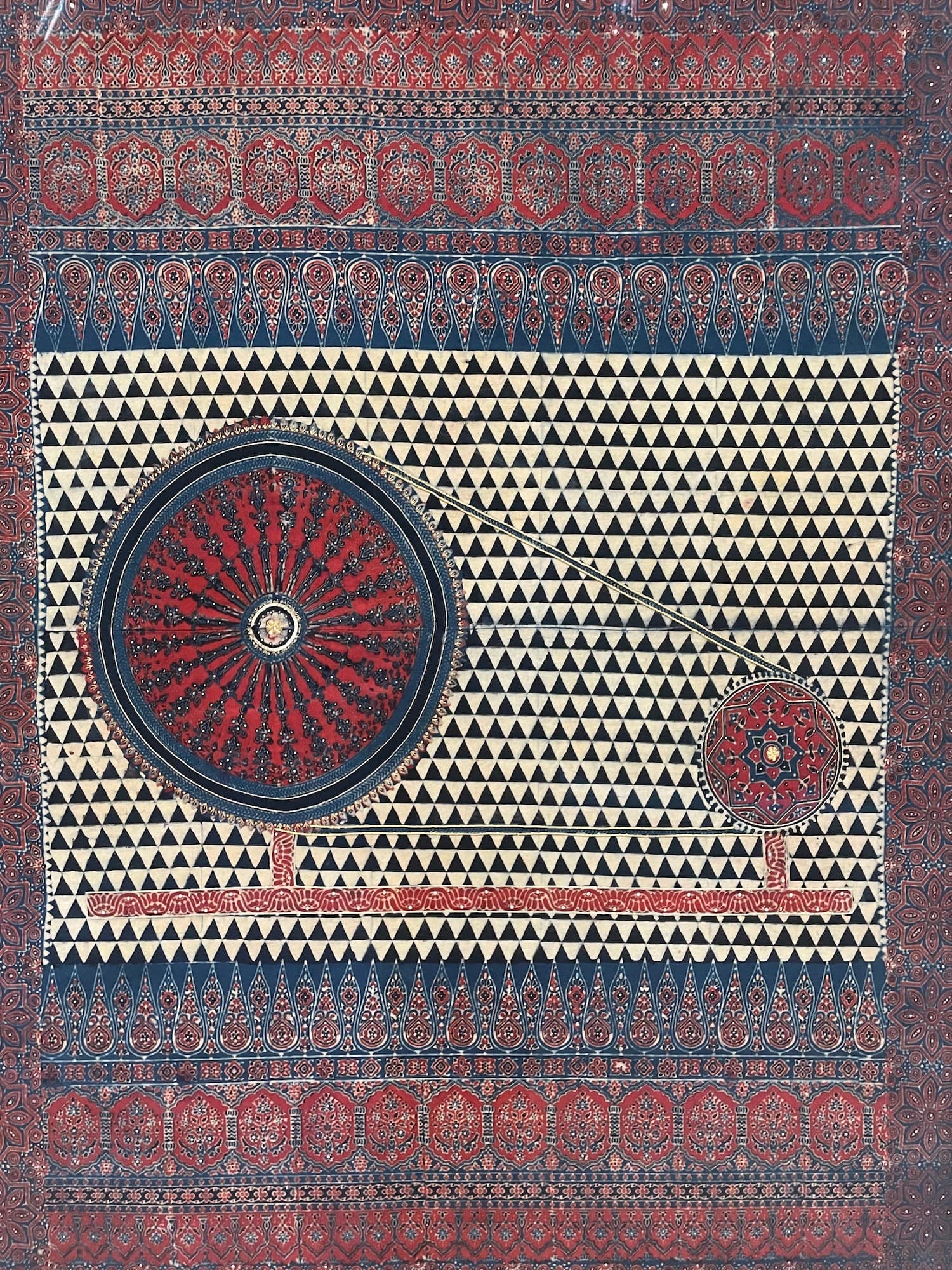 The installation of Prakriti is rooted in the focal idea that we are an integral part of nature. It is She who sustains and nurtures us. Since Sanjhi celebrates nature, with motifs of trees, birds and animals, it was a natural choice for this artwork. The Swavlamban installation is a triptych titled ‘Charkha — the Wheels of Swavlambam’. Created on 100gm of hand-spun, handwoven khadi, they feature different charkhas, printed in traditional Ajrakh style, and embellished with tiny mirrors and zari work. The charkha, or spinning wheel symbolises unity, freedom and self-sufficiency, reminding us of the Swadeshi Movement during India’s freedom struggle.