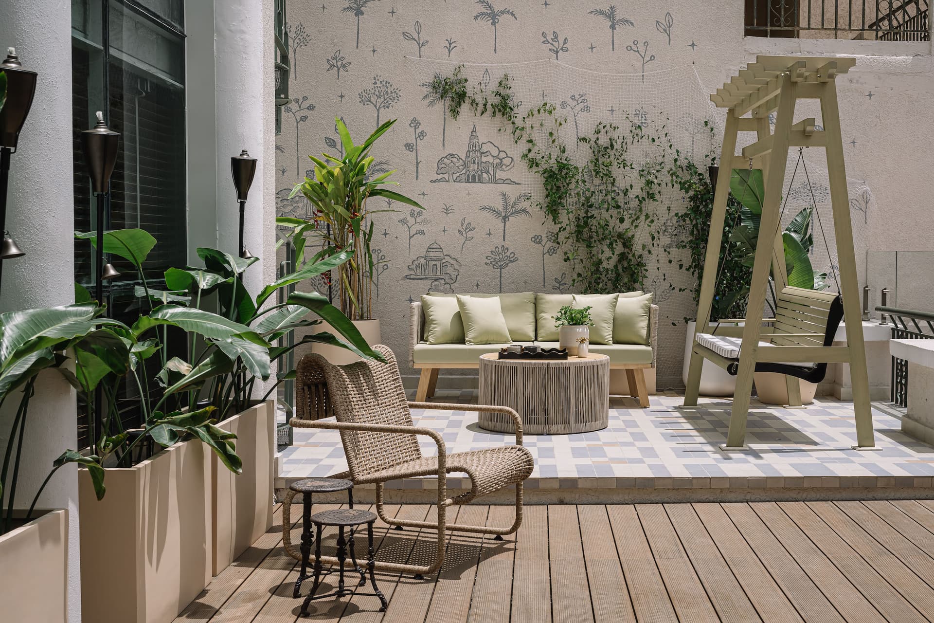 Ascending to the upper floors, a hand-painted mural along the winding staircase captures nostalgic vignettes of Bengaluru, while a bougainvillea-framed seating nook transforms the terrace into a picturesque escape. The stairwell itself is an artwork, featuring a striking light installation named Luna, created in collaboration with MGM. Inspired by the moon’s phases, its meandering design adds celestial drama to an otherwise minimal passageway.