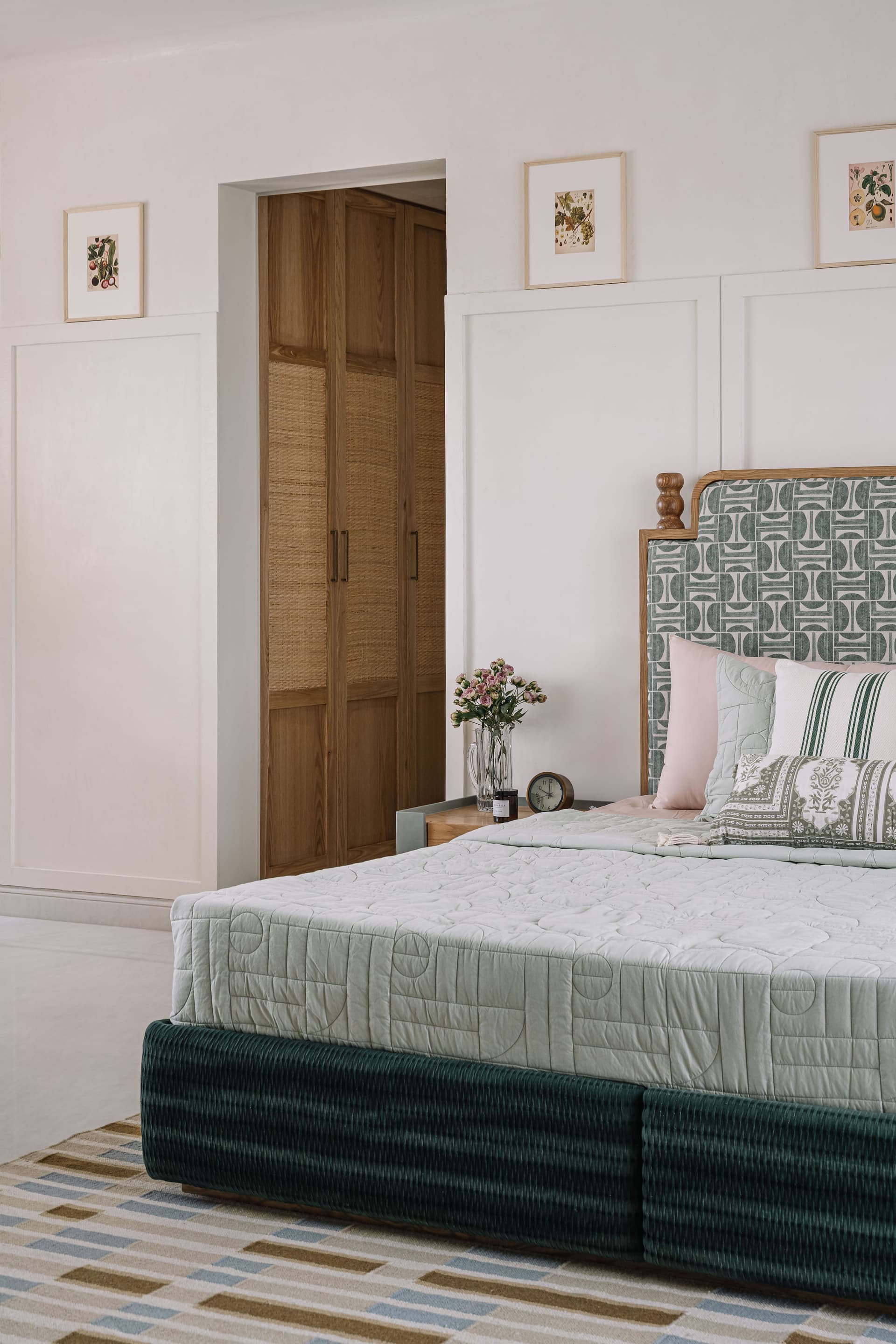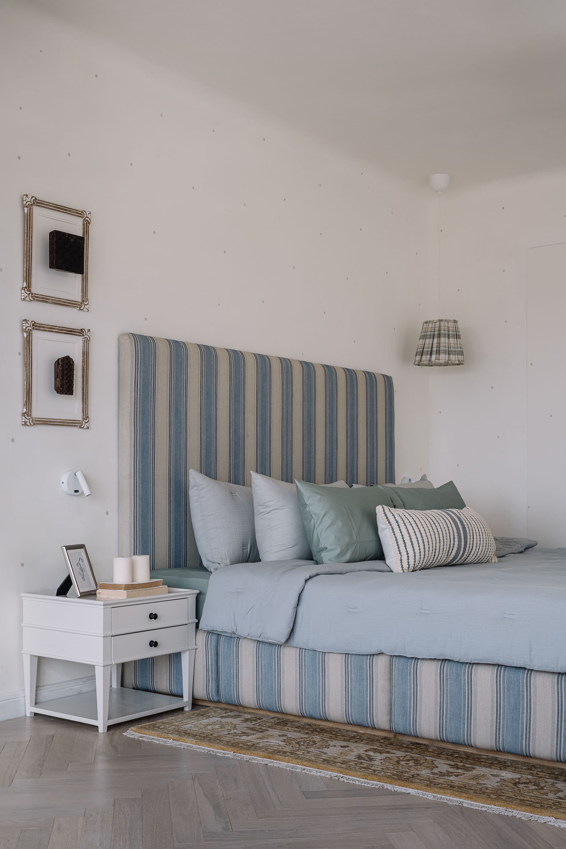 Meanwhile, the son’s bedroom—a joyful ode to childhood—is meticulously designed for adaptability. Powder blue and white beam-patterned ceilings, custom hanging lamps by MGM, and modular elements like a detachable ball pit and slide ensure the space grows with him, effortlessly transforming into a study or lounge in the years to come.