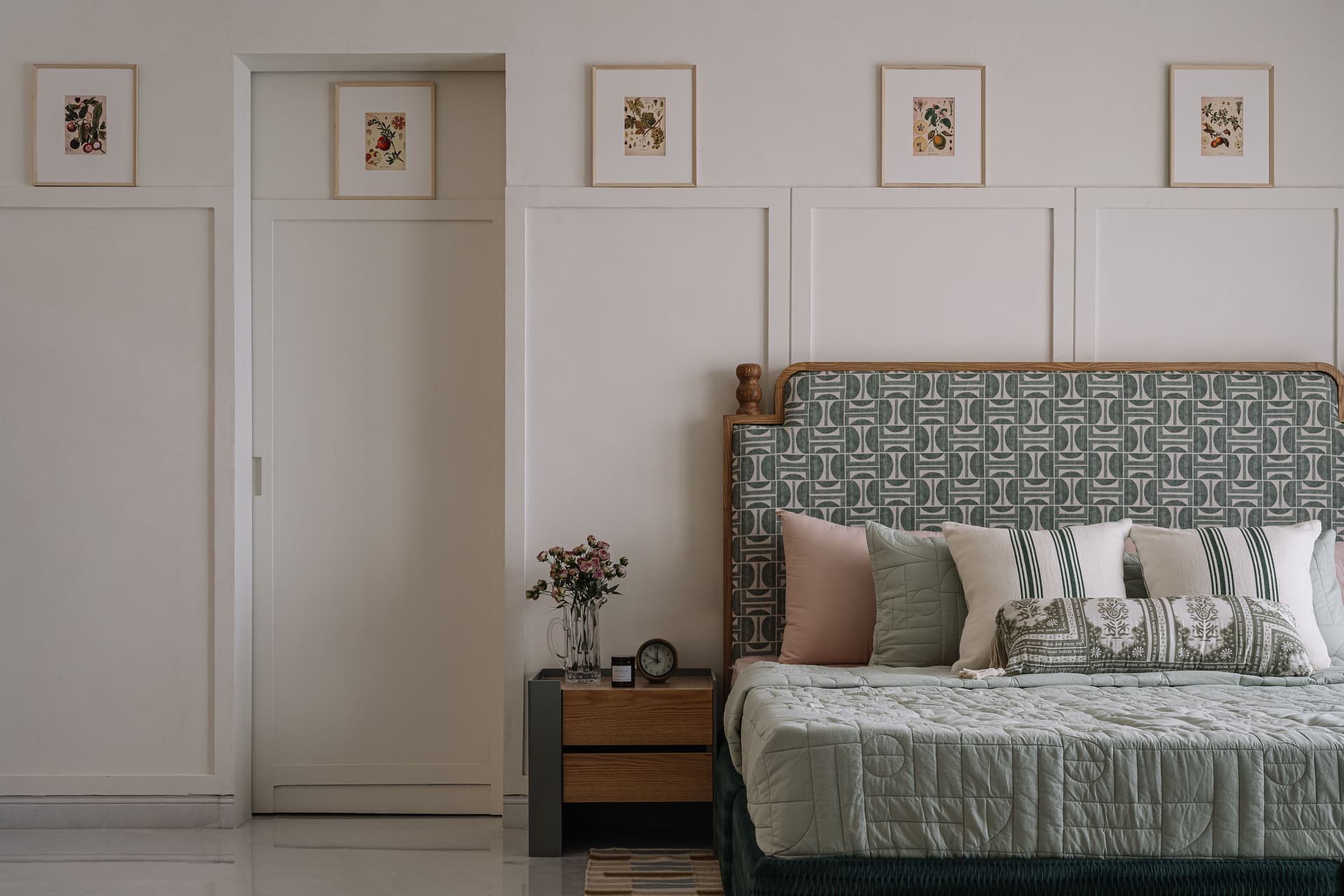 Stepping inside, the Vietnamese white marble flooring immediately captivates with its fluid, carpet-like inlay of green marble—an unstructured, organic pattern reminiscent of nature’s effortless beauty. The entrance vestibule leads to a lounge cocooned behind fluted glass doors, where tropical botanical wallpaper panels cleverly conceal the TV unit. A creamy yellow desk by the window draws the eye outward, creating a seamless indoor-outdoor connection. This space transitions effortlessly from a cozy family retreat to a home office or guest lounge, with adaptable furnishings, a sofa bed, and an en-suite bath ensuring maximum flexibility.