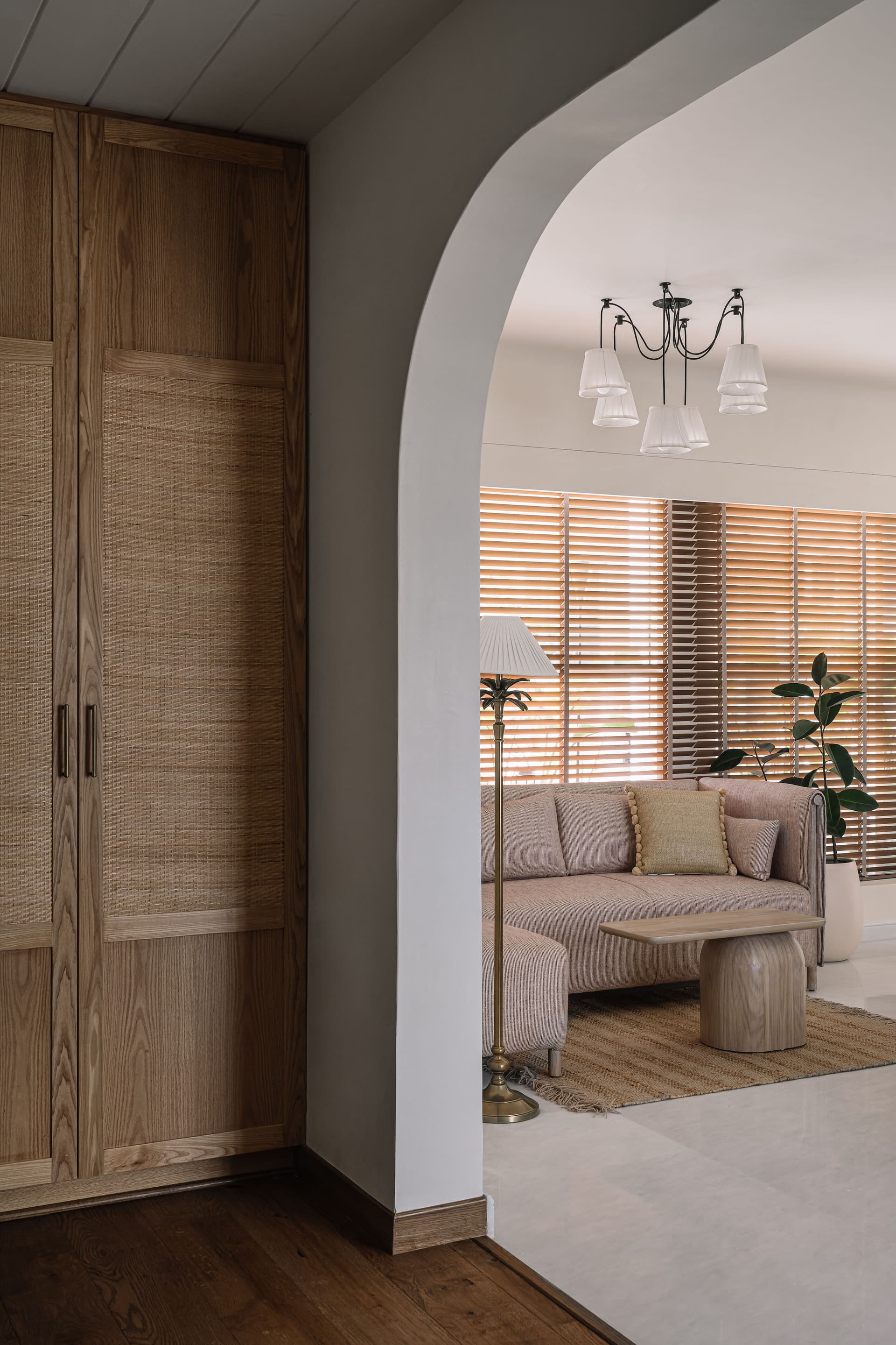 At the heart of the penthouse, the dining area unifies the layout, fostering moments of gathering and celebration. A custom terrazzo-in-situ dining table by Rawsteen, with its organically shaped multitone surface, echoes the home’s fluid design philosophy. Above, an LZF pendant light, inspired by unfurling ferns, reinforces the nature-infused narrative. A series of arches house curated objets d’art while discreetly concealing storage, with one archway leading into a dusty teal modular kitchen—both stylish and functional.