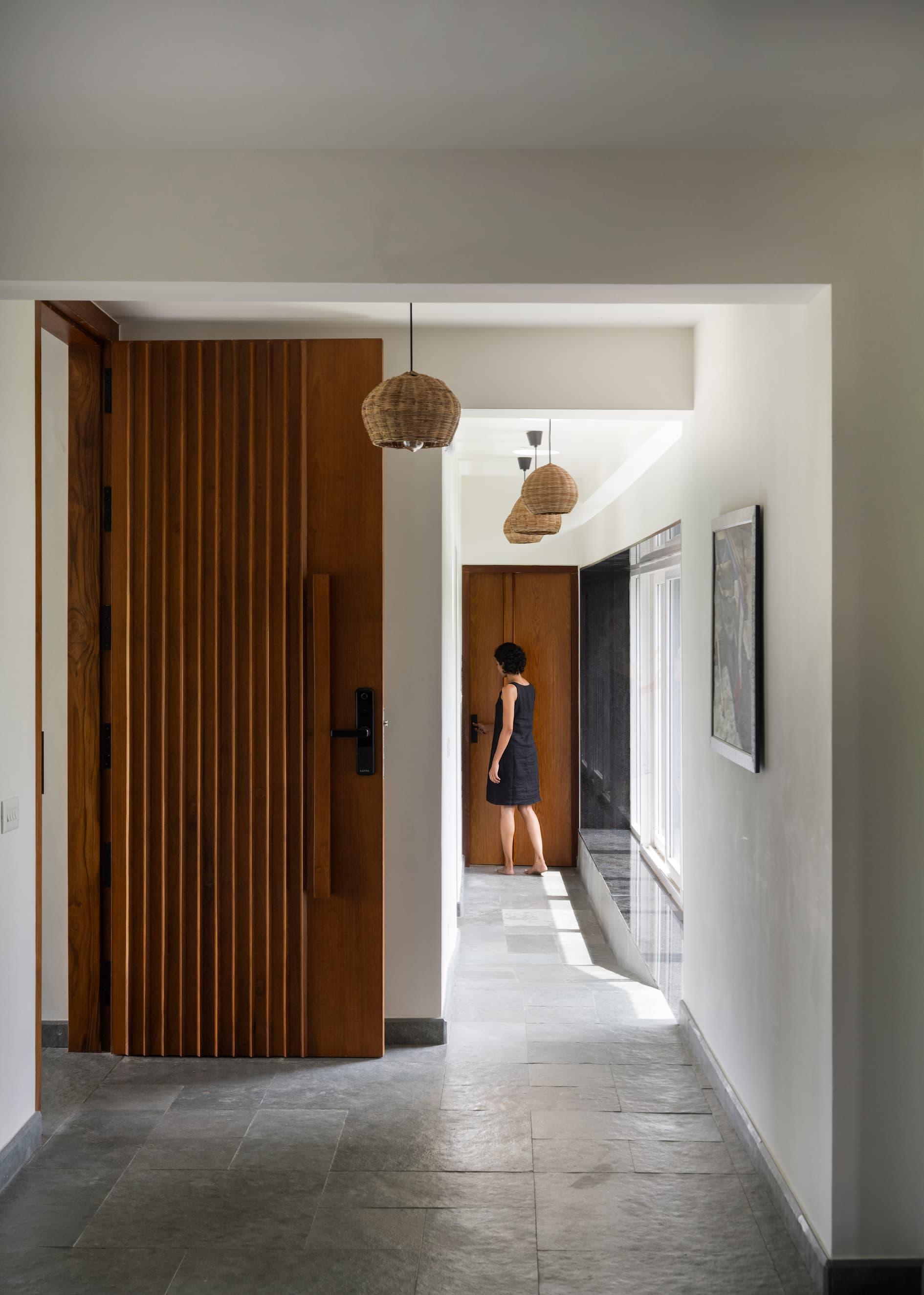 The material palette is a masterclass in subtle sophistication. Exposed concrete plaster on the ground floor is accented by crimson highlights, while leather-finish Kota and Jaisalmer stone flooring bring rich textures to life. Playful patterns in the flooring mark key transitions and level changes, adding a layer of visual intrigue. Polished teak wood doors, adorned with vertical beadings and grooves, enhance the sense of height and elegance, while jet-black granite window jambs frame each view as a living painting, inviting nature into the home.
