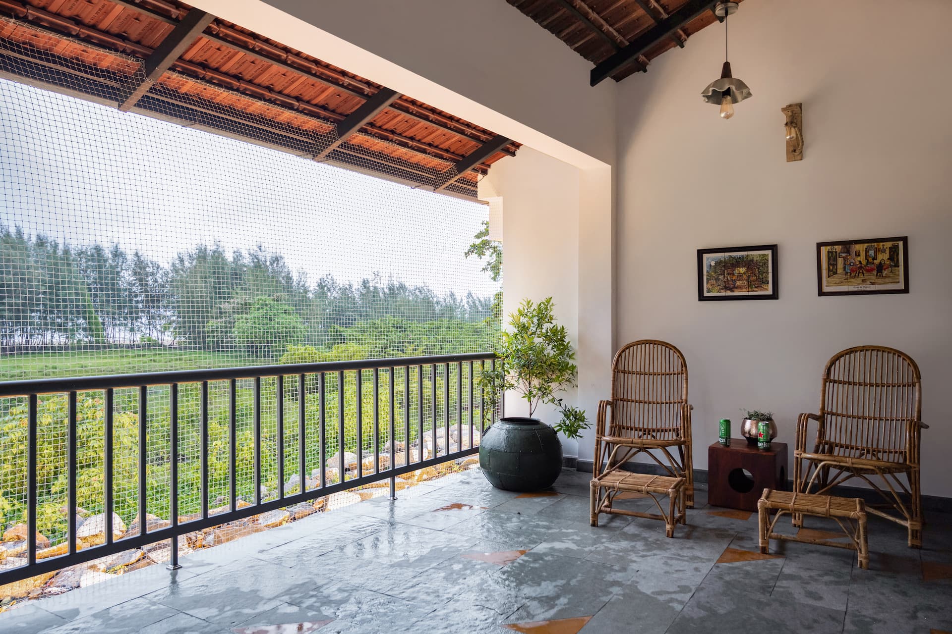 The heart of the home is the public zone, featuring an open kitchen that flows effortlessly into a double-height living room. This dramatic space is crowned by a Mangalore-tiled roof, with a mezzanine level that not only enhances spatial interplay but also serves as an intimate retreat or additional sleeping area. Adjacent to this, a covered balcony offers an idyllic setting for dining, complete with provisions for a barbecue grill and breathtaking sunset views.