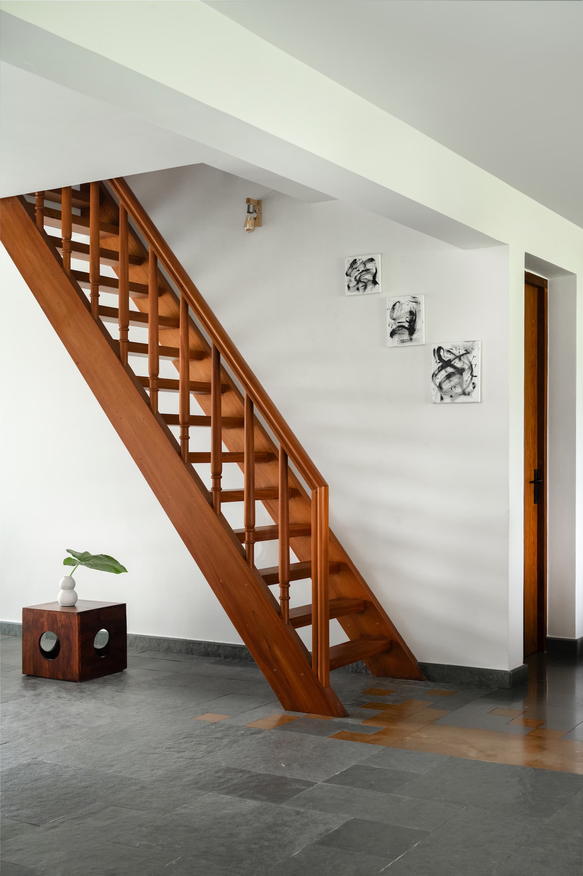 Adding a touch of nostalgia and craftsmanship, the ladder-style staircase showcases traditional teak wood joints and lathe-turned balusters, paying homage to Keralan artistry. The kitchen continues this narrative with teak wood shutters, a warm orange-streaked white countertop, and a copper-toned backsplash, blending elegance with functionality.