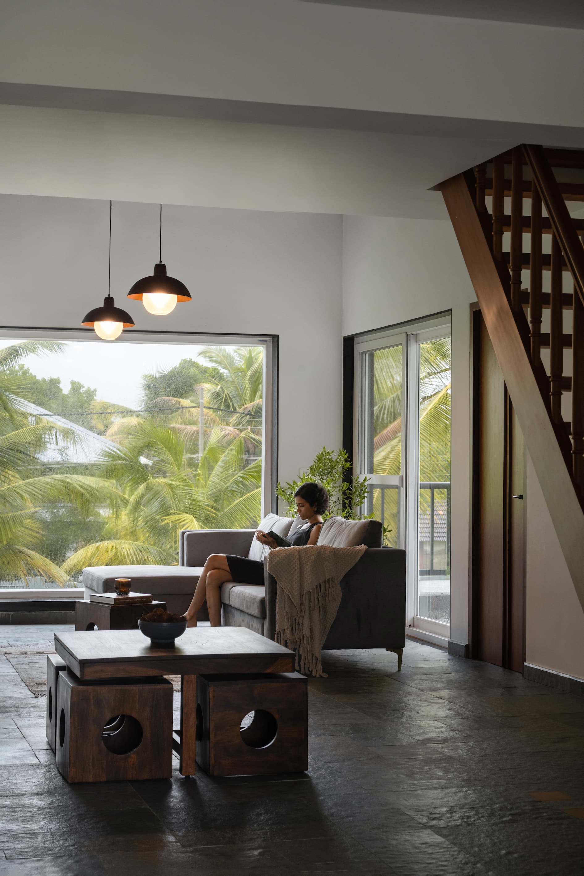 The ground floor sets the tone with its sleek, flat roof supported by circular columns adorned with narrow nibs, creating a floating aesthetic. This clever design not only adds to the home’s modern character but also allows for a private study and a sprawling garden, perfect for quiet reflection or lively gatherings. A standout feature here is the open-to-sky washroom, inspired by a seashell, where blue oxide walls and a pebble-inlaid floor evoke the essence of the ocean. This thoughtful addition provides a seamless transition from the sandy beach to the comfort of home.