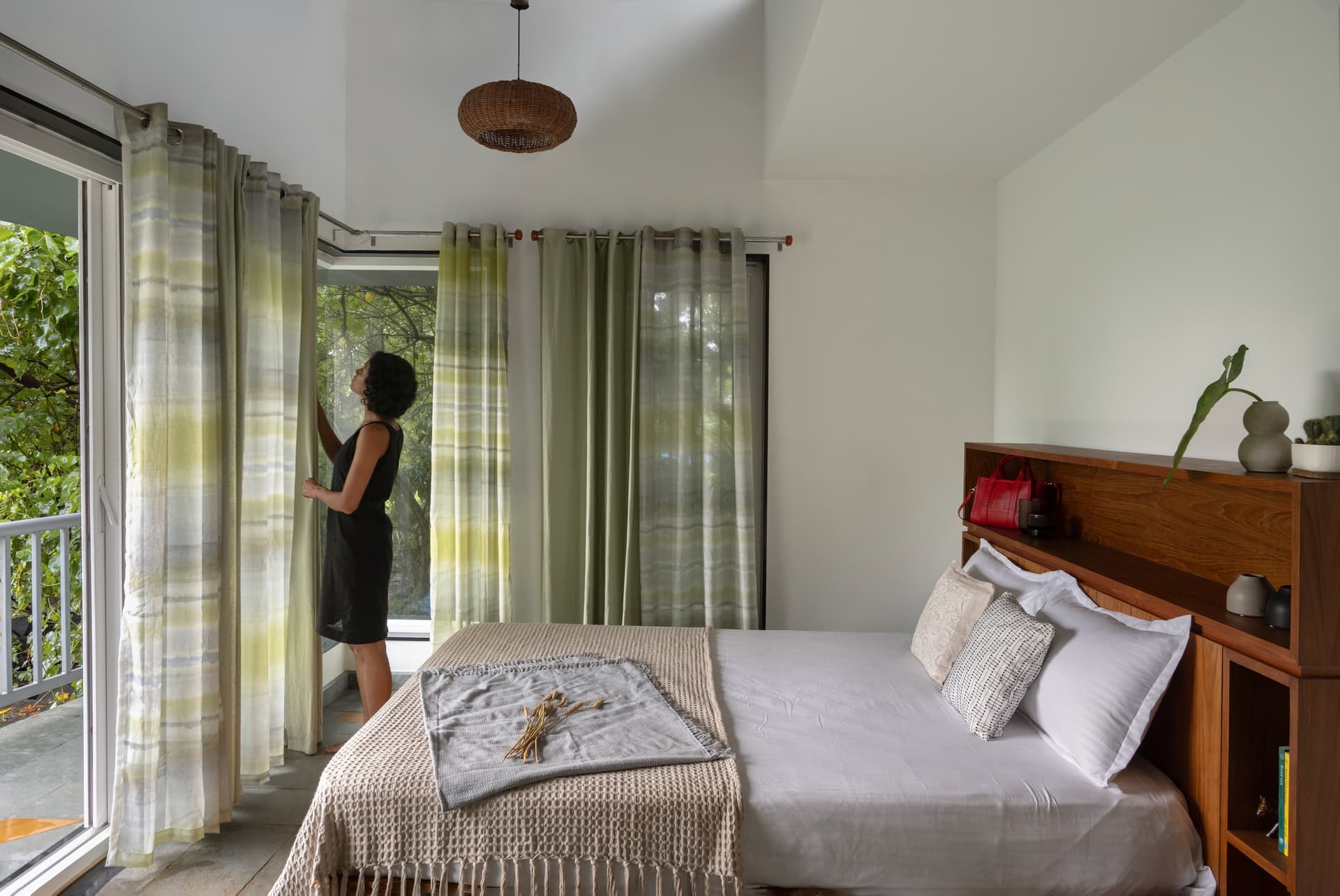 A well-lit corridor, lined with a bay window and illuminated by circular skylights, leads to two bedrooms. Each room is a sanctuary of tranquility, featuring asymmetrical sloped roofs, clerestory windows, and deep balconies that frame the surrounding landscape. The master bedroom, positioned at the end of the building, boasts a corner balcony with panoramic views of the ocean and lush greenery, offering an unmatched sense of peace and seclusion. The bathrooms, with frosted glass walls and scenic step-out areas, continue the theme of blending utility with aesthetic grace.