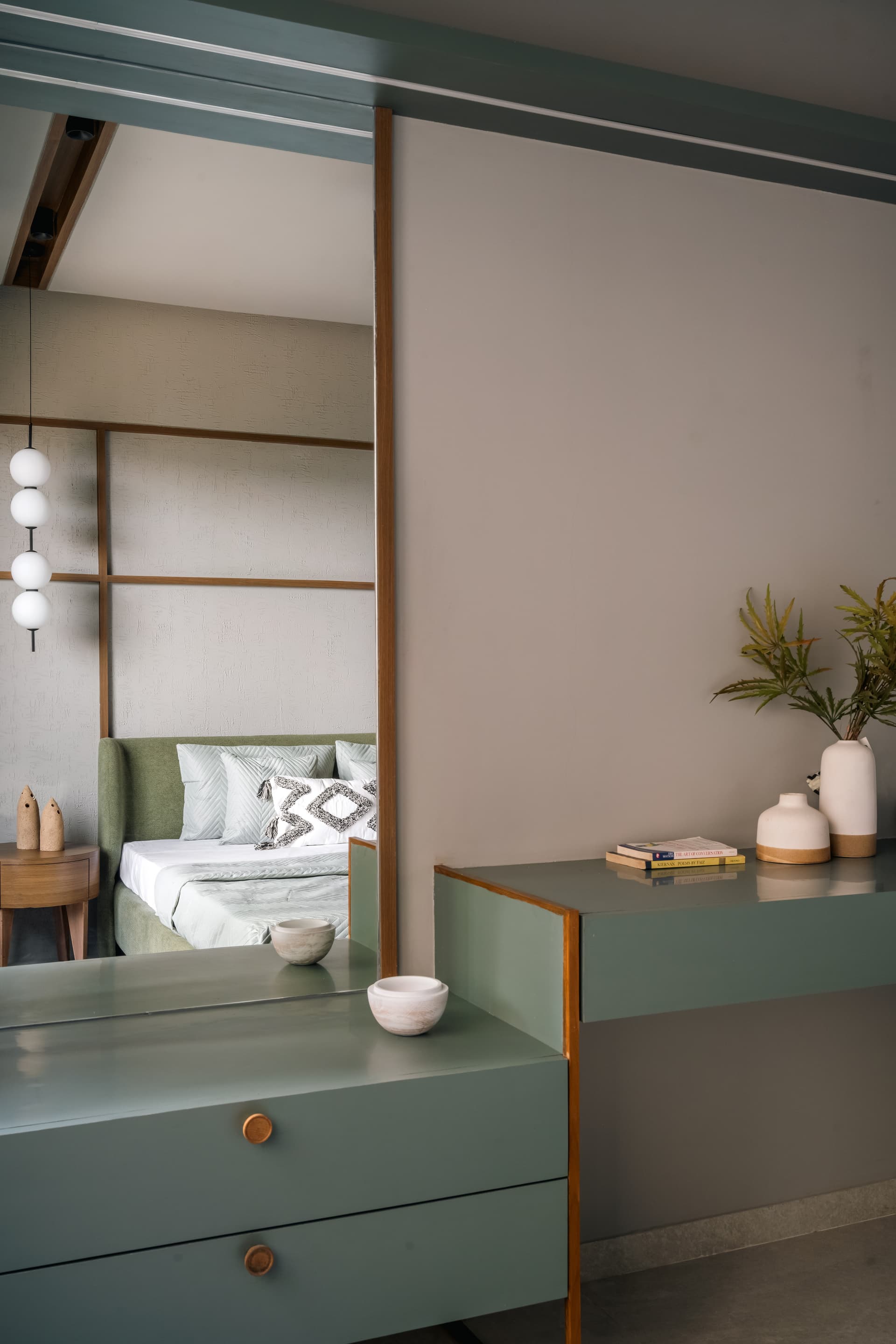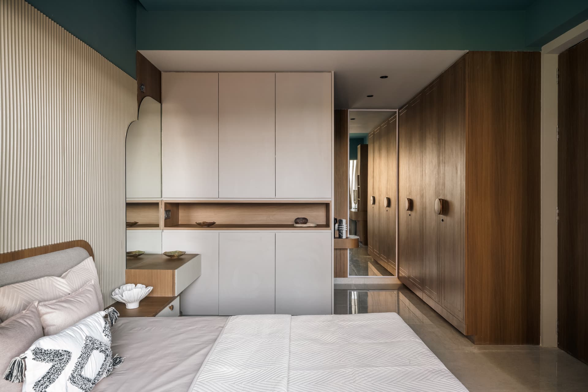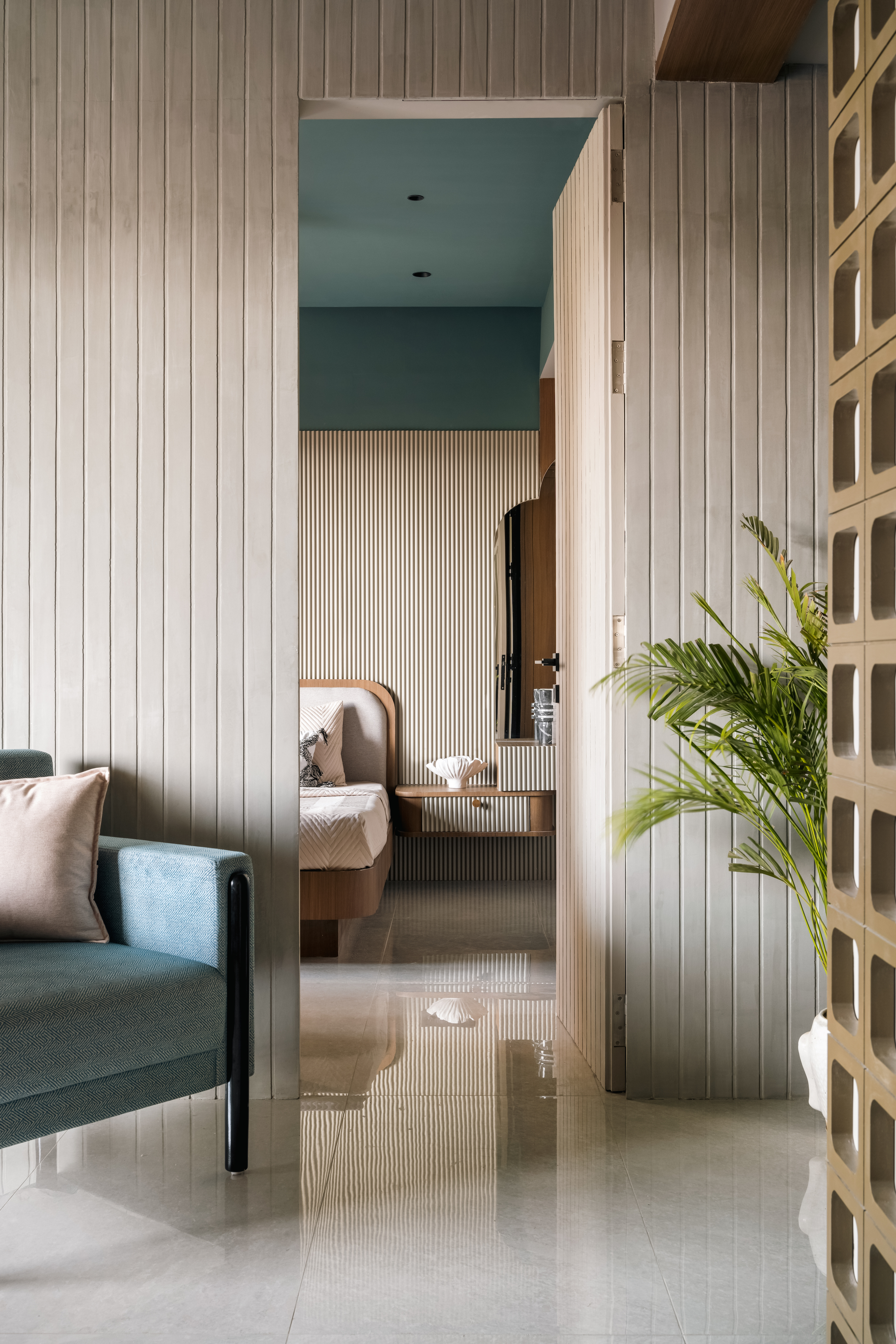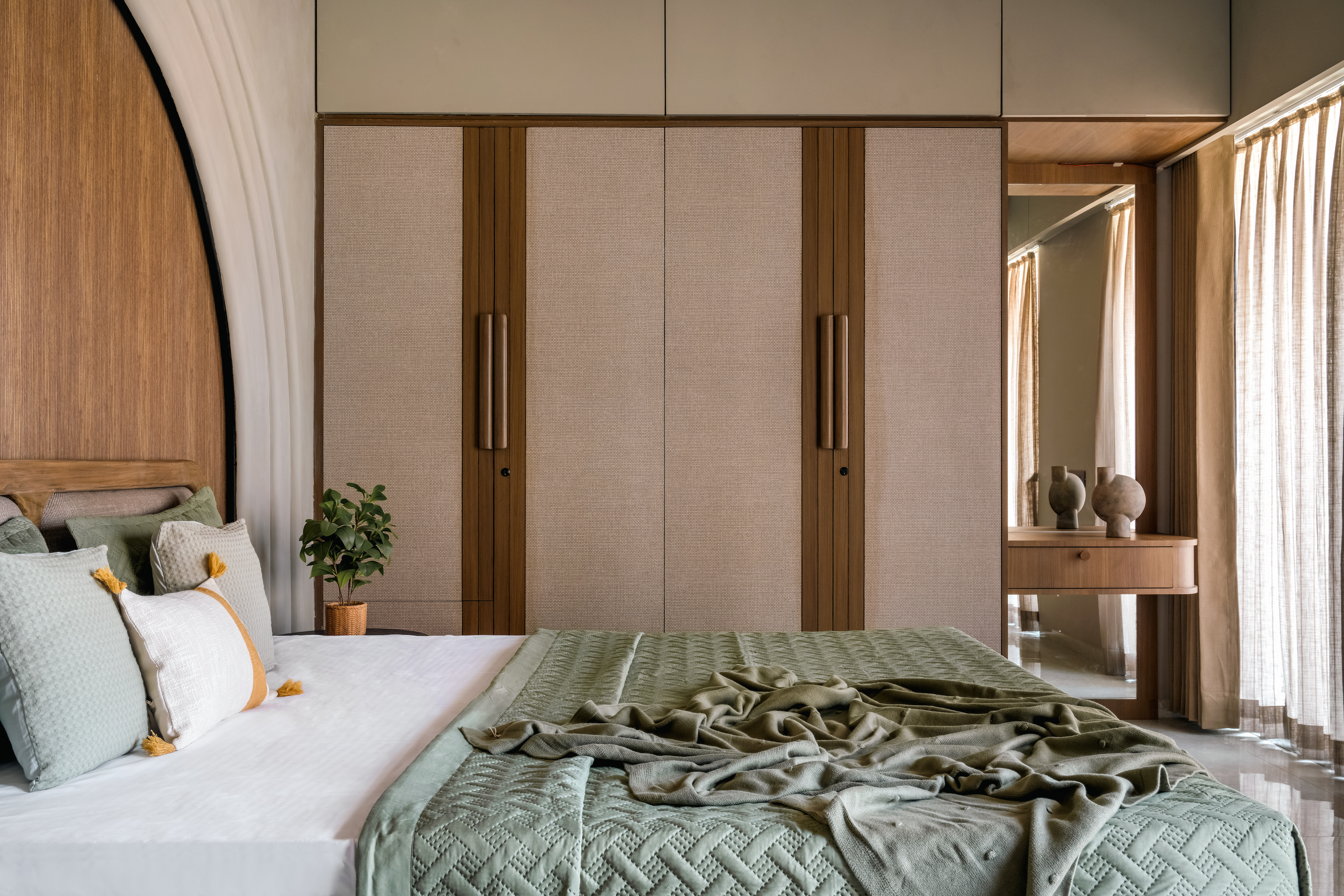Each of the four bedrooms narrates its own story while adhering to the home’s unified design language. The master bedroom embodies tranquility, with earthy tones, layered lighting, and tactile textiles that evoke calm and contemplation. The children’s room introduces gentle playfulness, balancing joy and serenity through soft colours and smart storage that evolves with growing needs. Meanwhile, the guest bedroom remains elegantly simple, designed with neutral palettes, cozy furnishings, and minimal accents, creating a welcoming refuge.