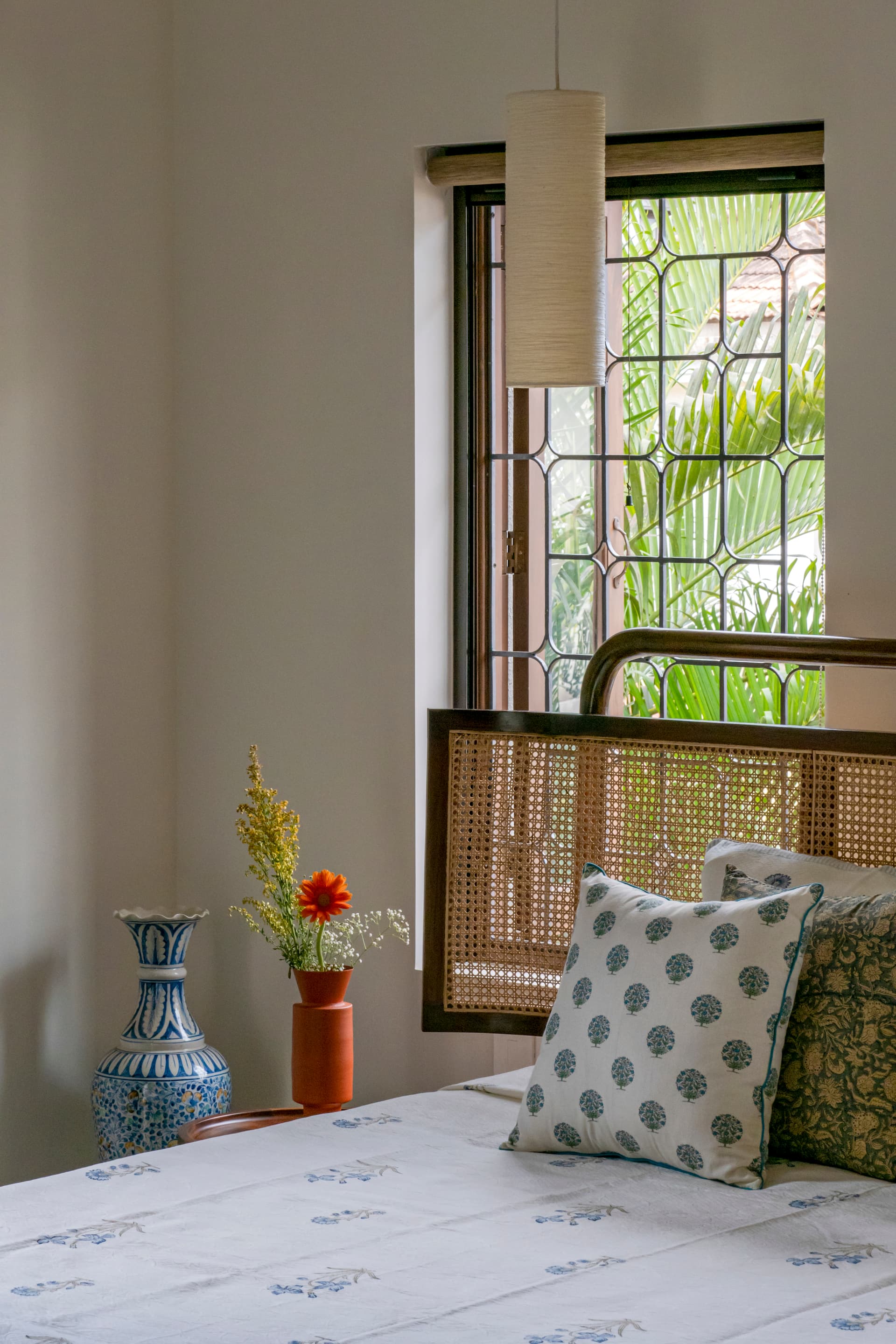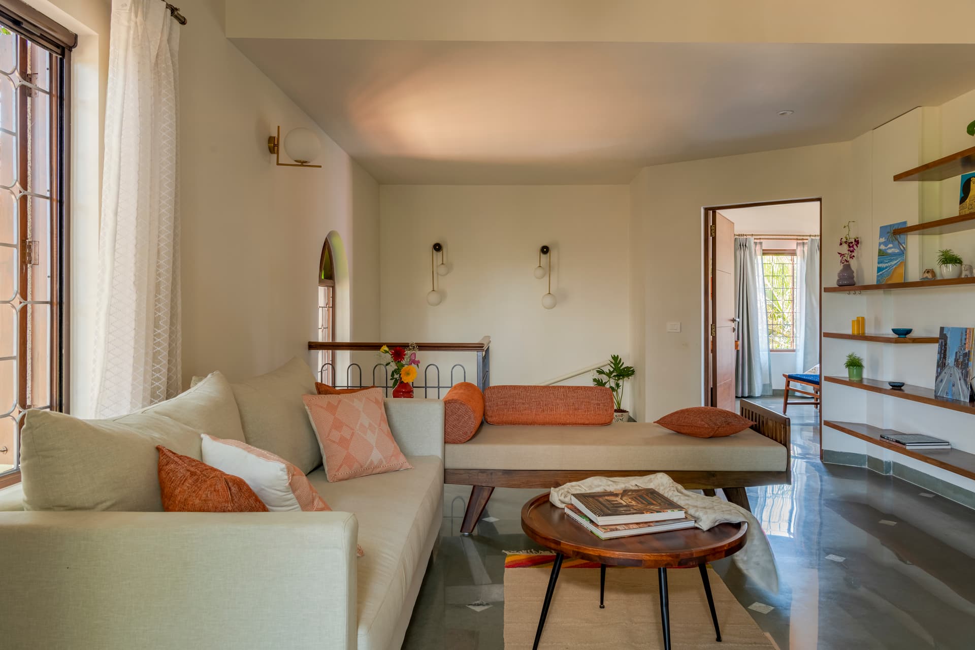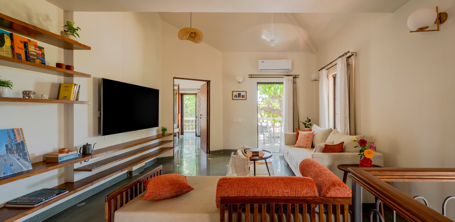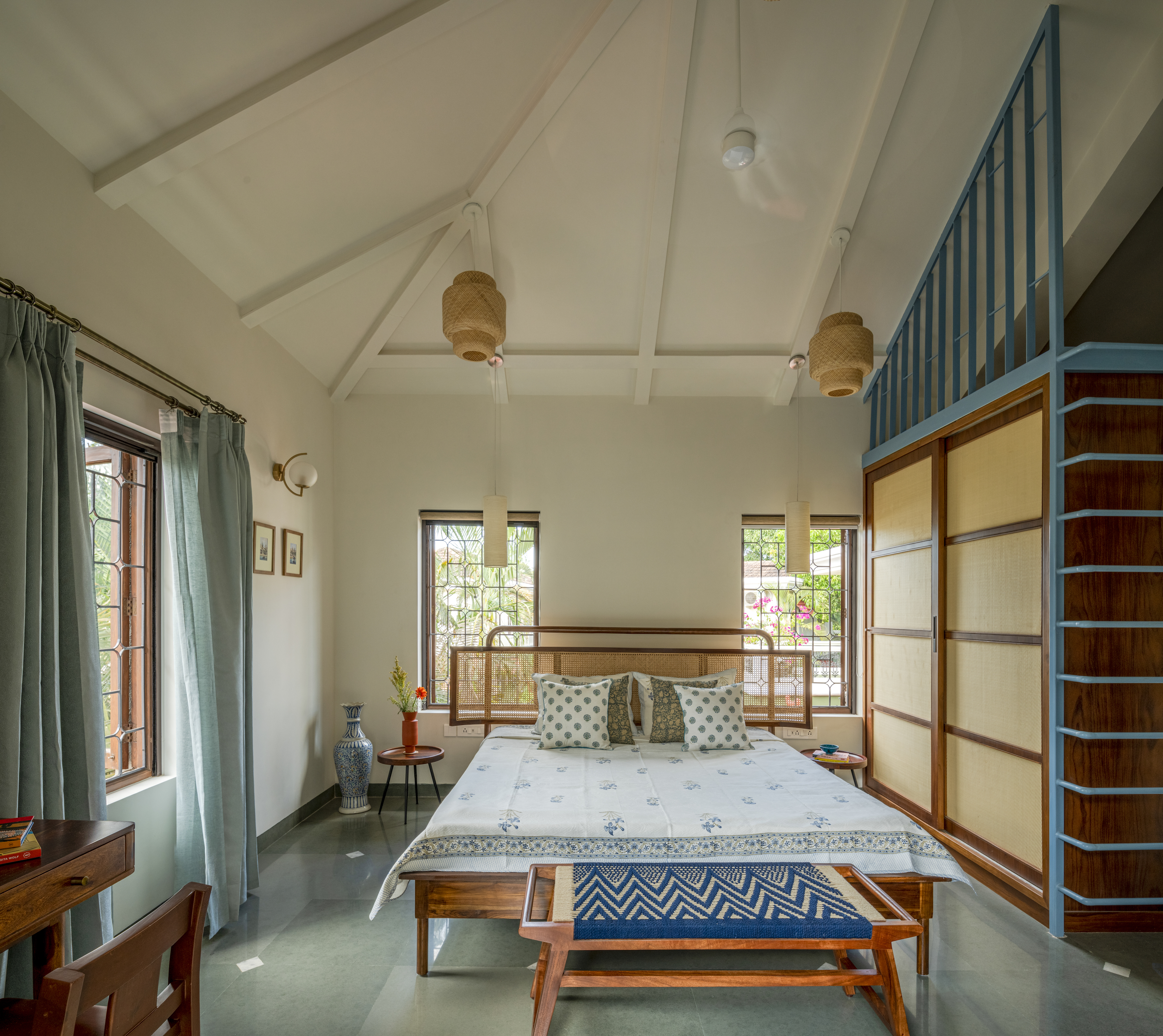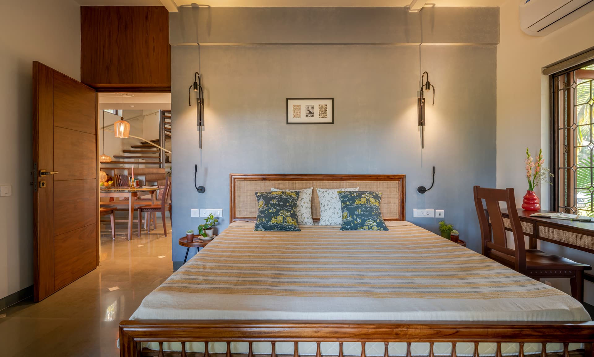 In line with the conscious living concept, textiles were sourced directly from artisans, ensuring each piece was unique and crafted with care. Hand-woven cushion covers from Punjab and Nagaland, as well as bedcovers with Bagru block-printed textiles from Jaipur, adorned the living spaces. Upholstery and curtains were sourced from dead-stock suppliers and upcycled, emphasizing sustainability and uniqueness.