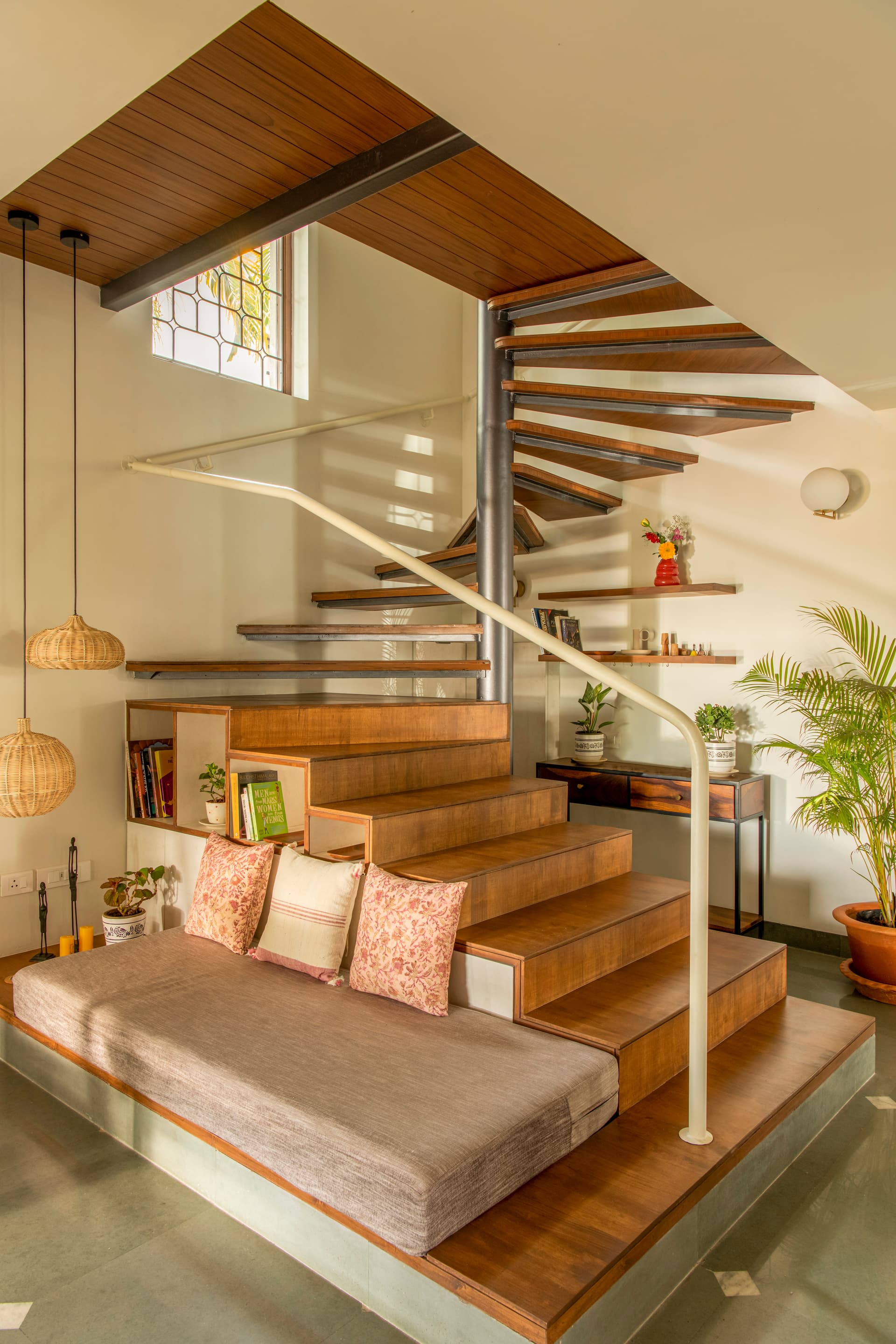 The central design element of this transformation was the new staircase, a striking blend of steel and wood. A work of art in form, materiality, and function, it breathed new life into the villa. The spiral design not only maximized the use of space but also extended the upper floor lounge area, creating a seamless connection between the levels. The straight first flight brought stability and direction, opening up new possibilities. It also formed a plinth, expanding the dining space and creating an intimate “baithak.” On the opposite side, a utility space emerged, ingeniously housing distribution boards, an inverter, and a host of storage drawers. The first flight featured plywood treads, while the spiral, with its steel skeleton and wooden-clad treads, merged modernity with natural aesthetics.