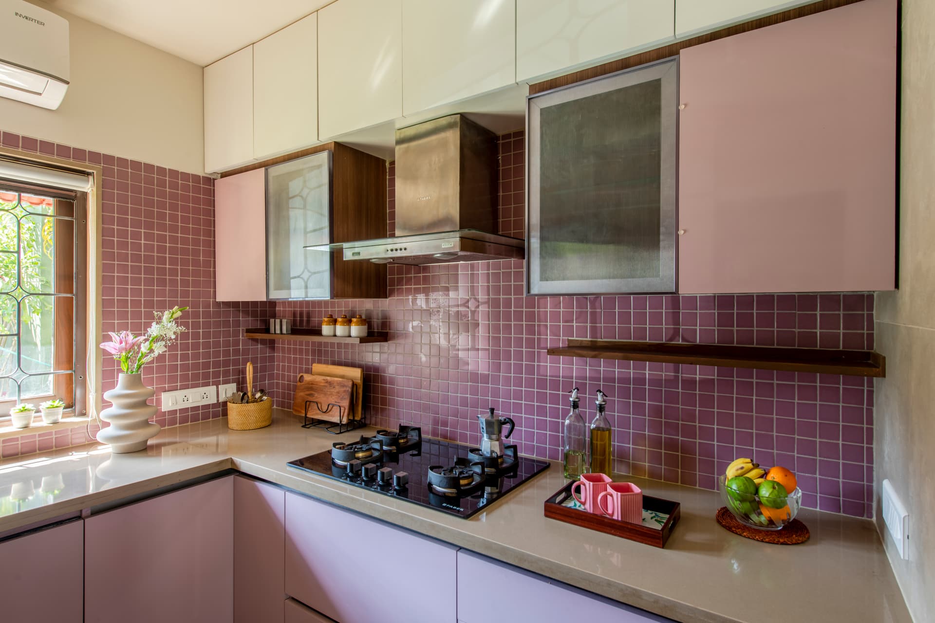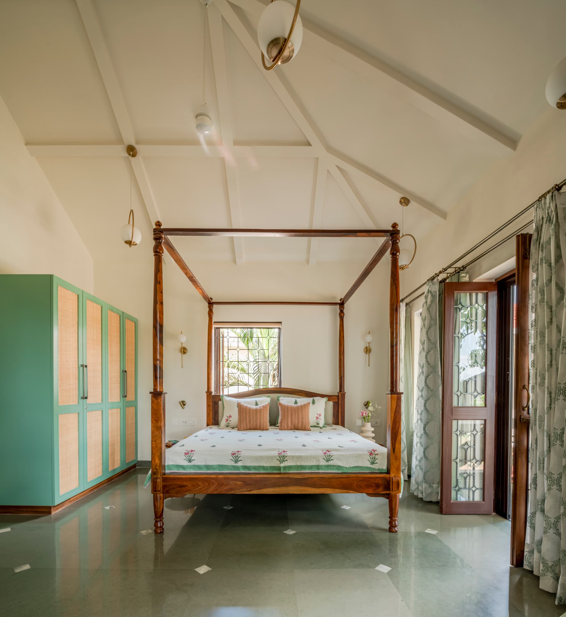 The material palette resonated with the clients’ commitment to conscious living. The polished kotah stone floor, adorned with white marble diamonds, offered cool respite from Goa’s tropical heat. Off-white walls provided a serene backdrop, while the warmth of wooden furniture, staircase, and veneer finish doors introduced a rich contrast. Bedrooms and the kitchen were enlivened with pastel shades of sage, blue, and mauve, infusing a sense of cheerfulness.