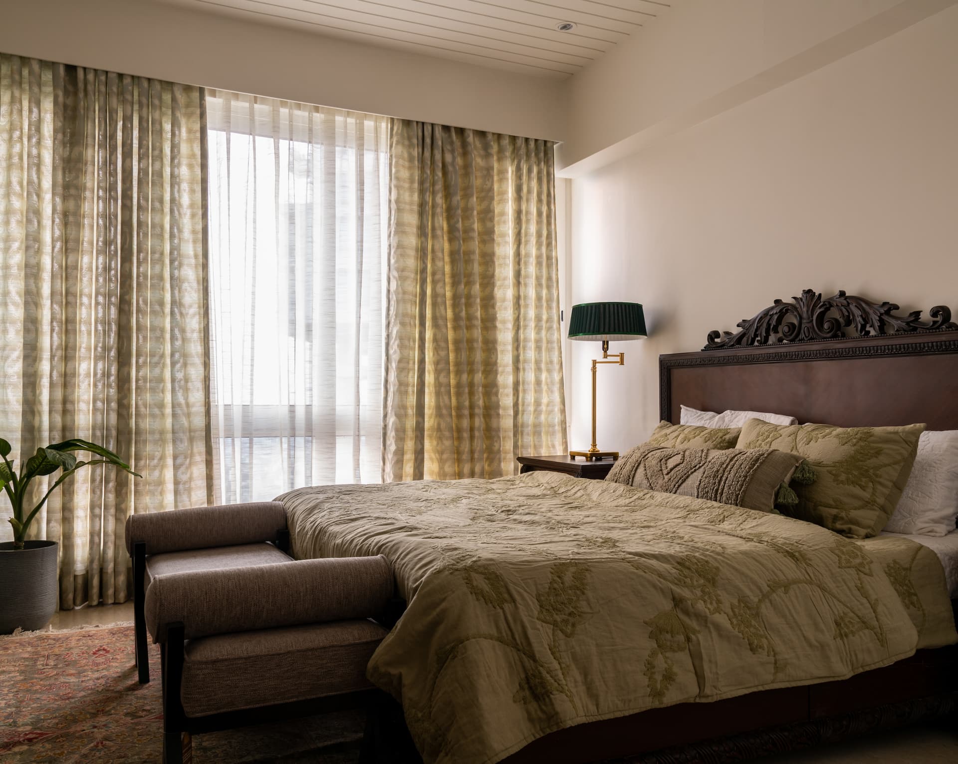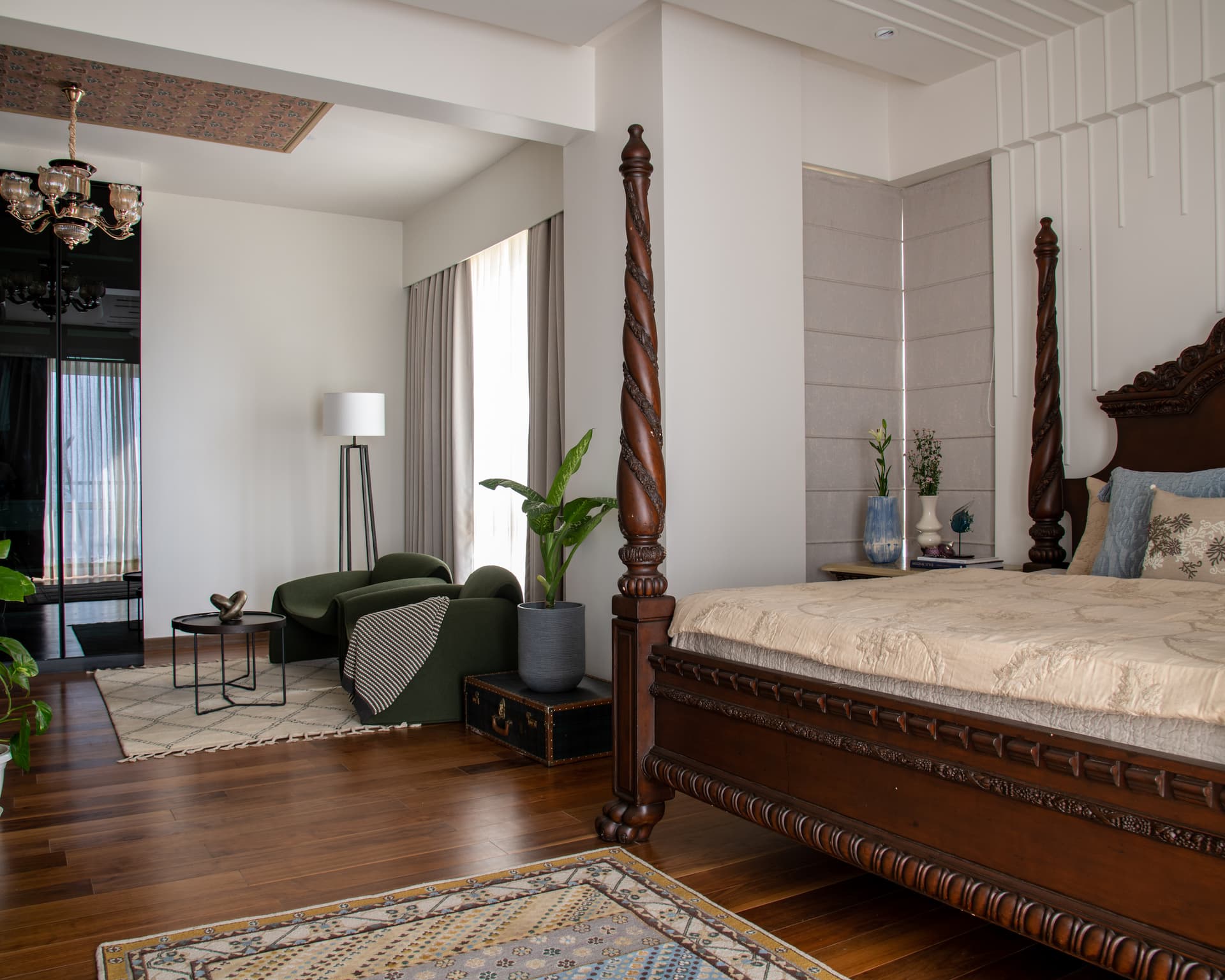 The master bedroom features a wooden four-poster bed reminiscent of a boutique hotel, accentuated by a color palette saturated in tones with a slightly sun-bleached character. Abundant windows infuse the room with simplicity and balance, while a fusion of vintage carved bed and modern glass wardrobe, complemented by a wallpapered ceiling, lends an air of contemporary charm to the space. The result is a home that embodies a breath of fresh air, showcasing a modern sensibility without feeling stark.