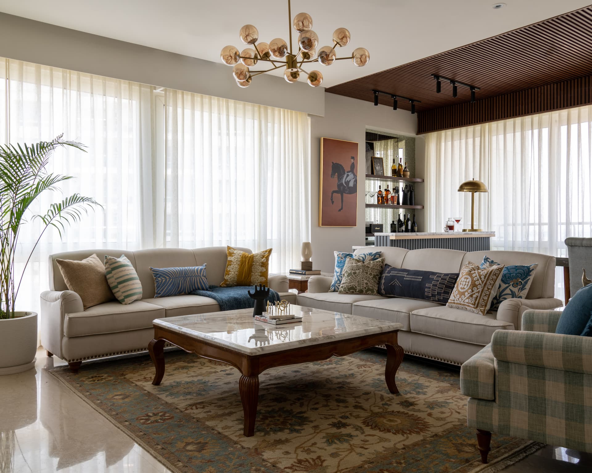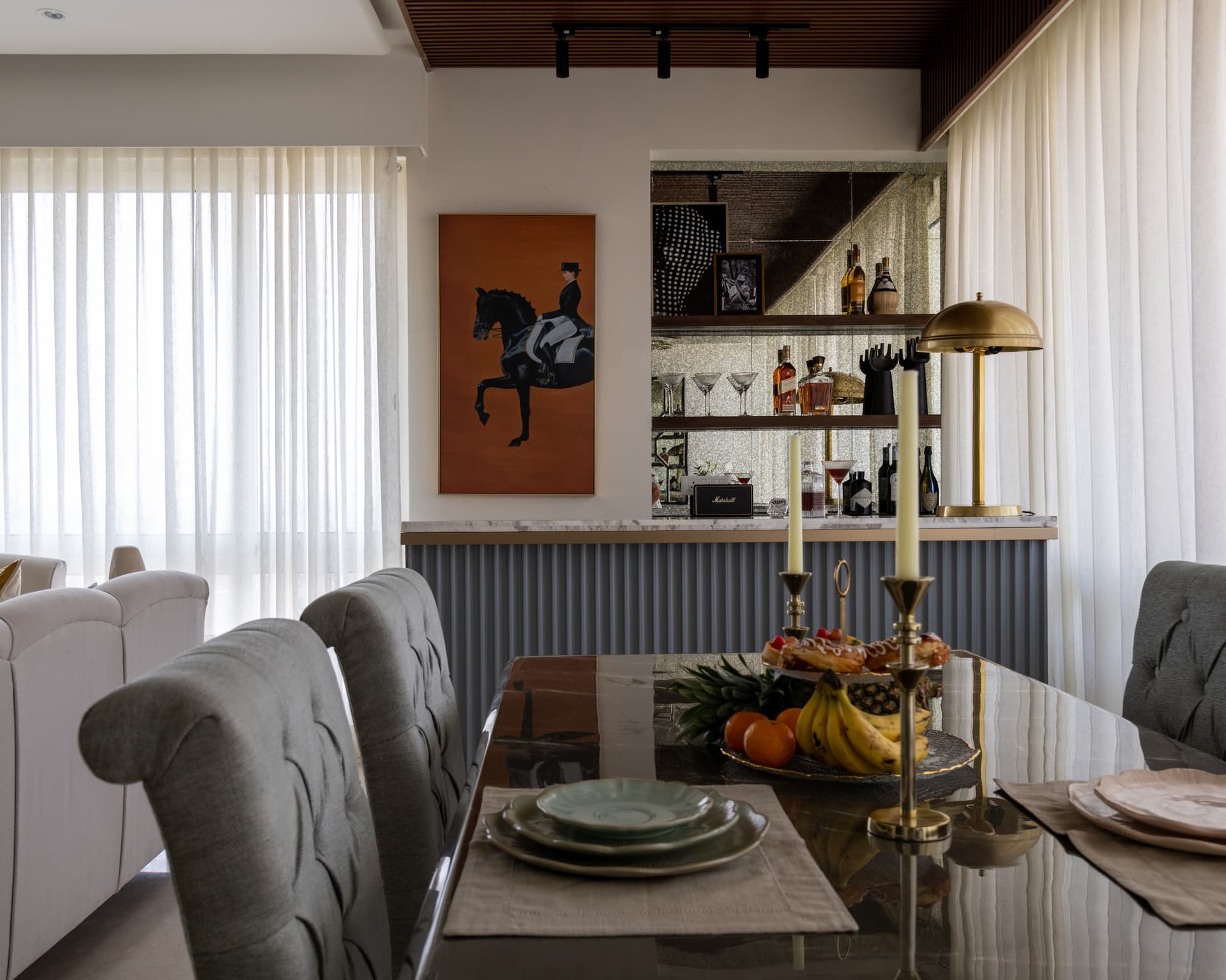 The open-concept layout presented an opportunity to establish distinct zones, expertly curated by Kissa Zehra. The formal living room boasts a combination of beige and checker sofa chairs, elegantly accompanied by a vintage centre table and side tables with polished marble tops. The space is anchored by a raw wooden log TV ledge, harmoniously transitioning into the bar area and dining table, which were seamlessly integrated into the overall design.