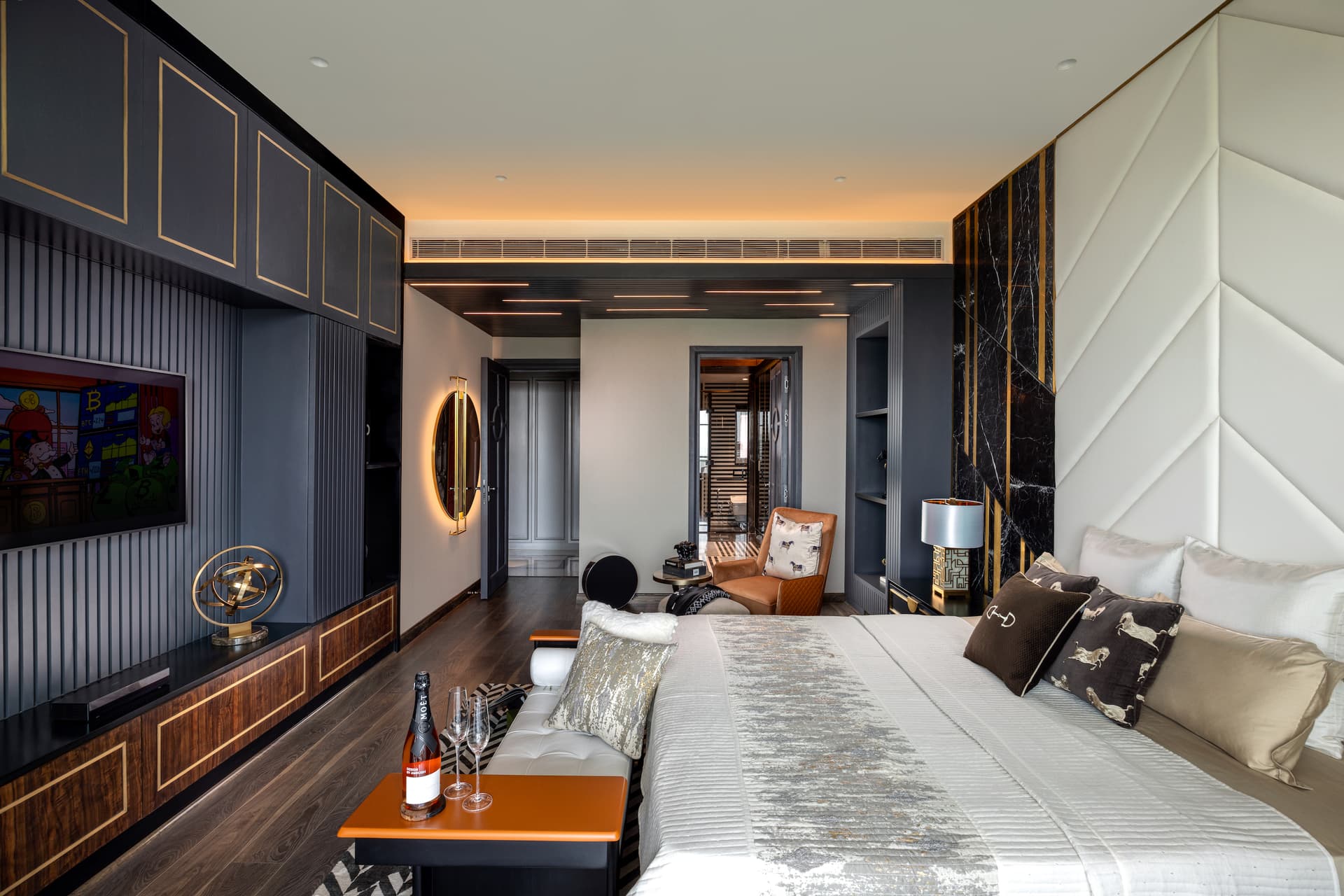 Overlooking the expansive city skyline and greens of a golf lawn, the living room is crafted with distinct hues, the finesse of wood, the radiance of metallic notes, quintessential artwork and a regal chandelier. While tinted mirrors evince dimension and depth to the space, wall mouldings with metallic edges reinforce the French Neoclassical appeal. A colour associated with royalty, blue became the backbone colour in an overall neutral palette. Ensconced between an onyx accent wall on one end and a traditional miniature style painting on the other, the dual social spaces are clad in hushed tones. In this interplay of textures and patterns, while the wicker work couch in brass strips offers a distinct touch of textures, the showstoppers are the notable motifs on the ceiling, replicated on wallpaper.