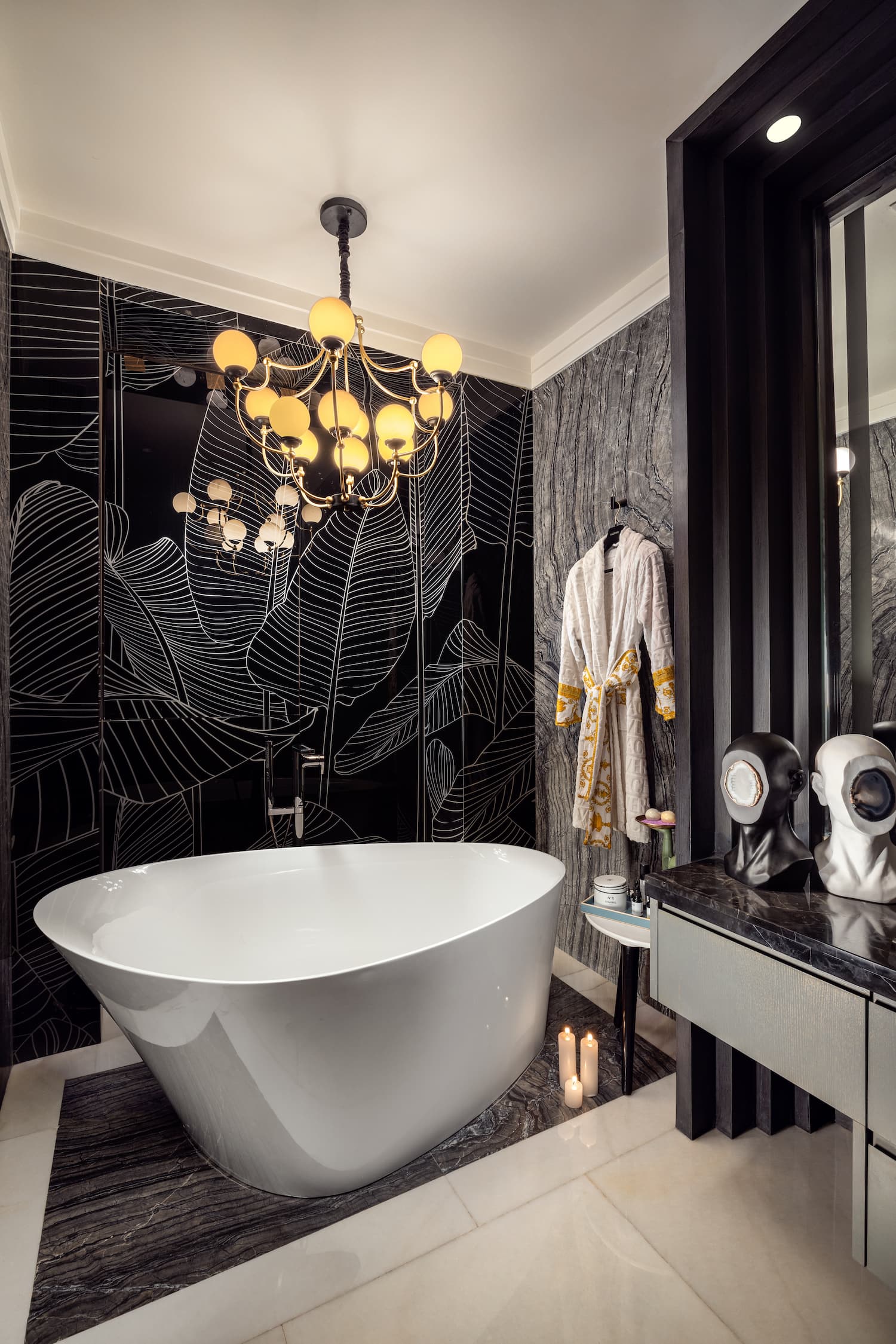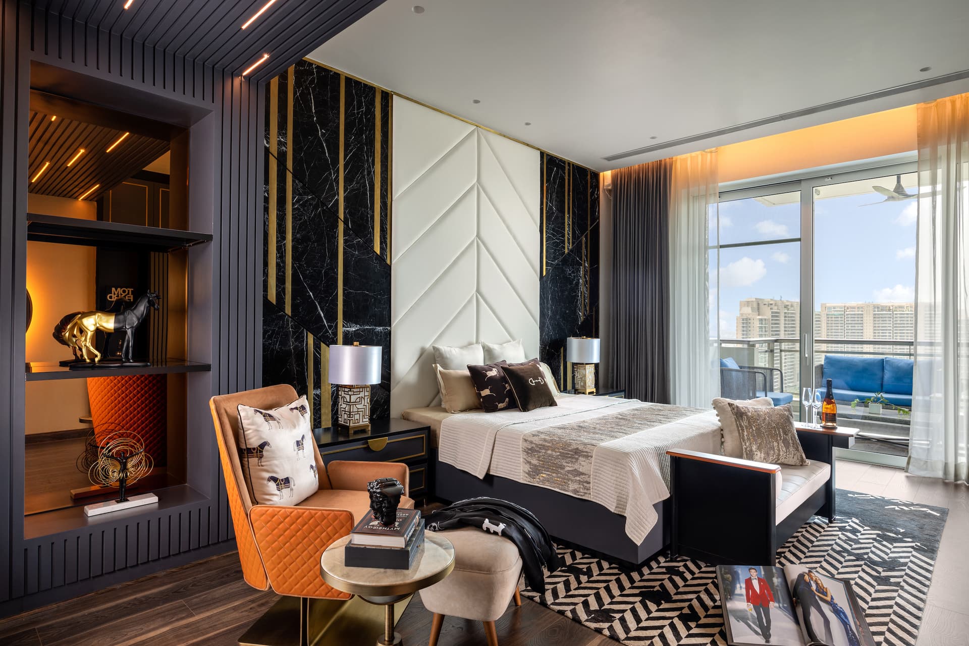 The use of orange continues in the third room through the bed along with prevailing patterns and hues. Cage chair offers a vantage viewpoint over the golf course. When it comes to luxury, the bathroom interior designs are a step ahead. Black and white geometric patterns transform into a base for two of them, while the third has a floor to ceiling glass wall etched with a digitally printed leaf design that fashions for a distinctive feature wall. The luster of loft chandeliers commands attention.