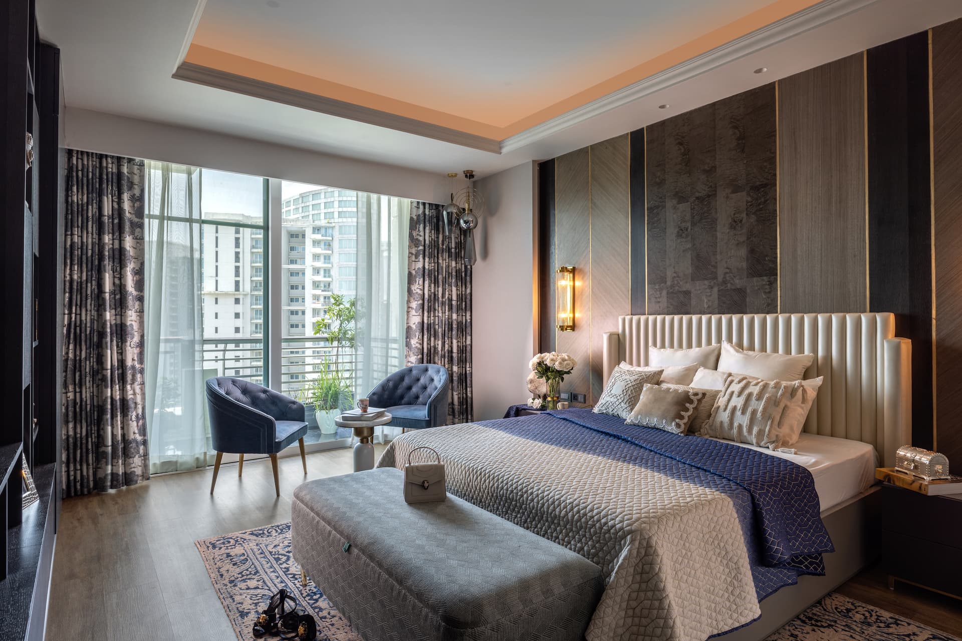 The master bedroom brings the trajectory of the blue back with its furnishings. The inspiration from Madhubani paintings veils the curtains. Plush leather tufted beige headboard set against monochrome veneer panelling with metal profiles is another constant that runs through the home.