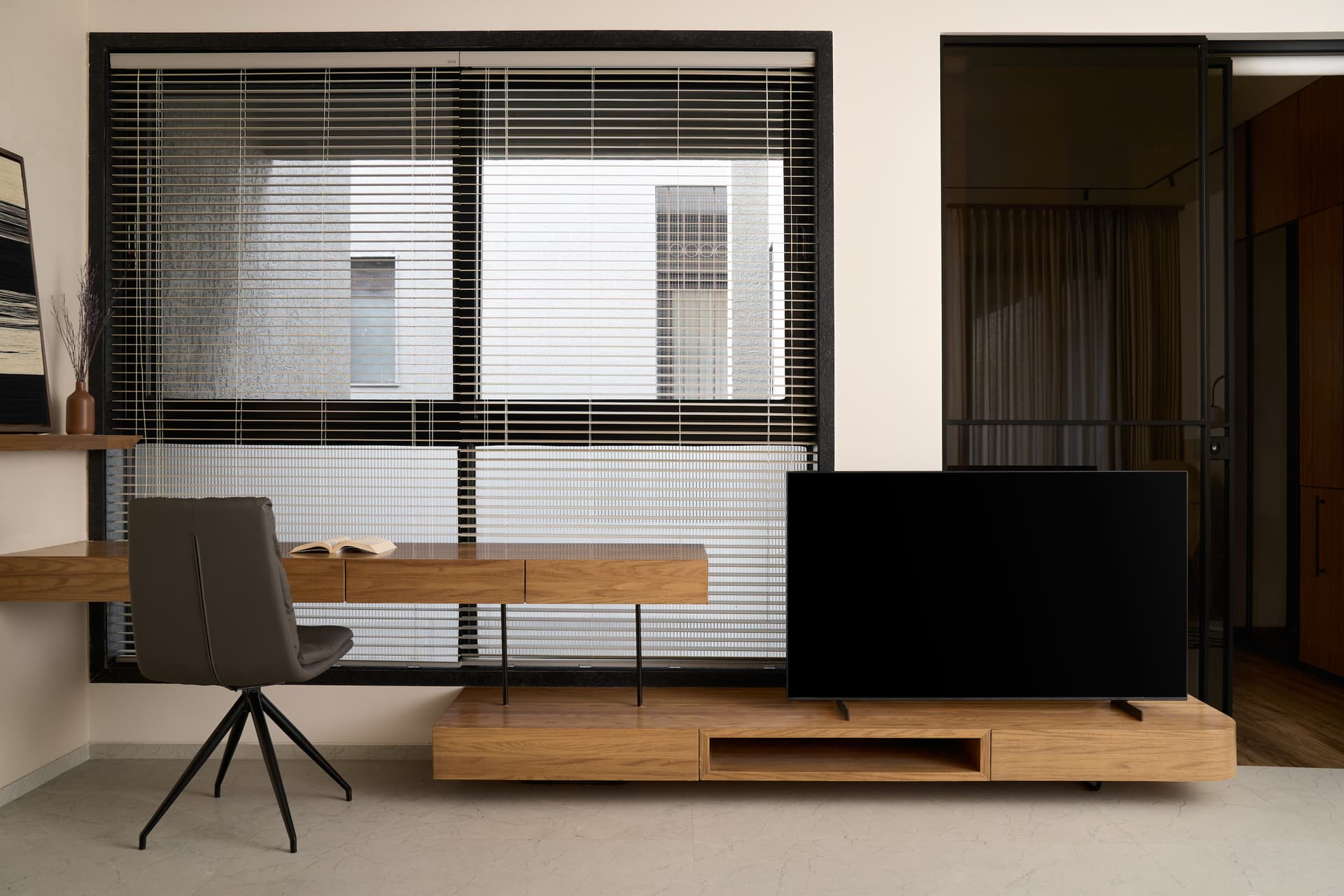 Geometry in this space is not just a static design element; it acts as a dynamic force shaping the flow of the home. The use of shapes and patterns is rhythmic, guiding one from space to space with a natural ease. This is most evident in the home’s lounging areas, each imbued with its unique mood and energy. The Lounge is a monochromatic marvel in black and white, accented by bursts of yellow—a perfect evening retreat where one can unwind in style. From here, the journey continues to the Terrace Lounge, where rustic wood and natural elements invite a seamless connection to the outdoors. Here, geometry softens, allowing nature’s organic forms to take the lead, turning this space into a sanctuary of peace.