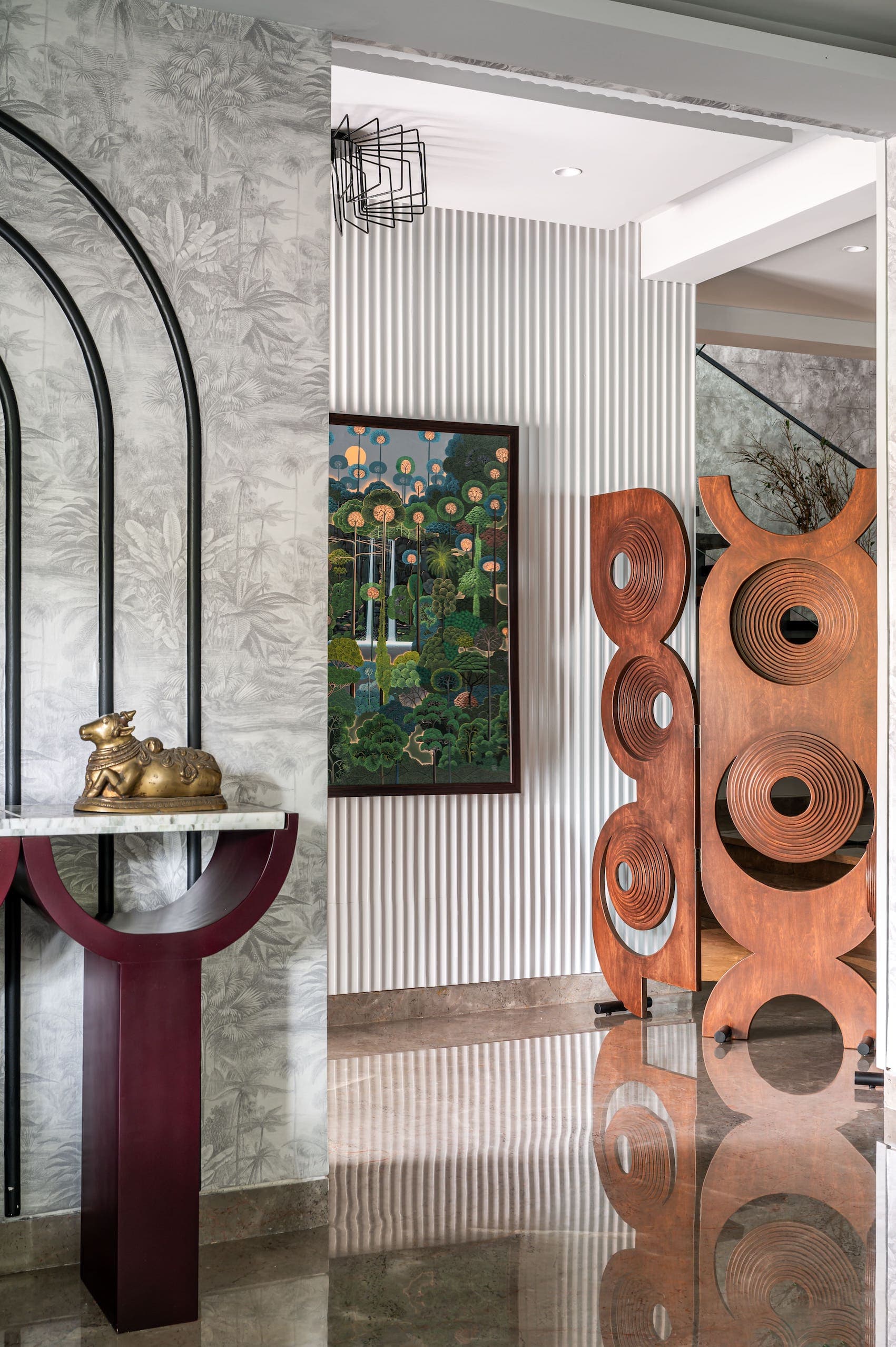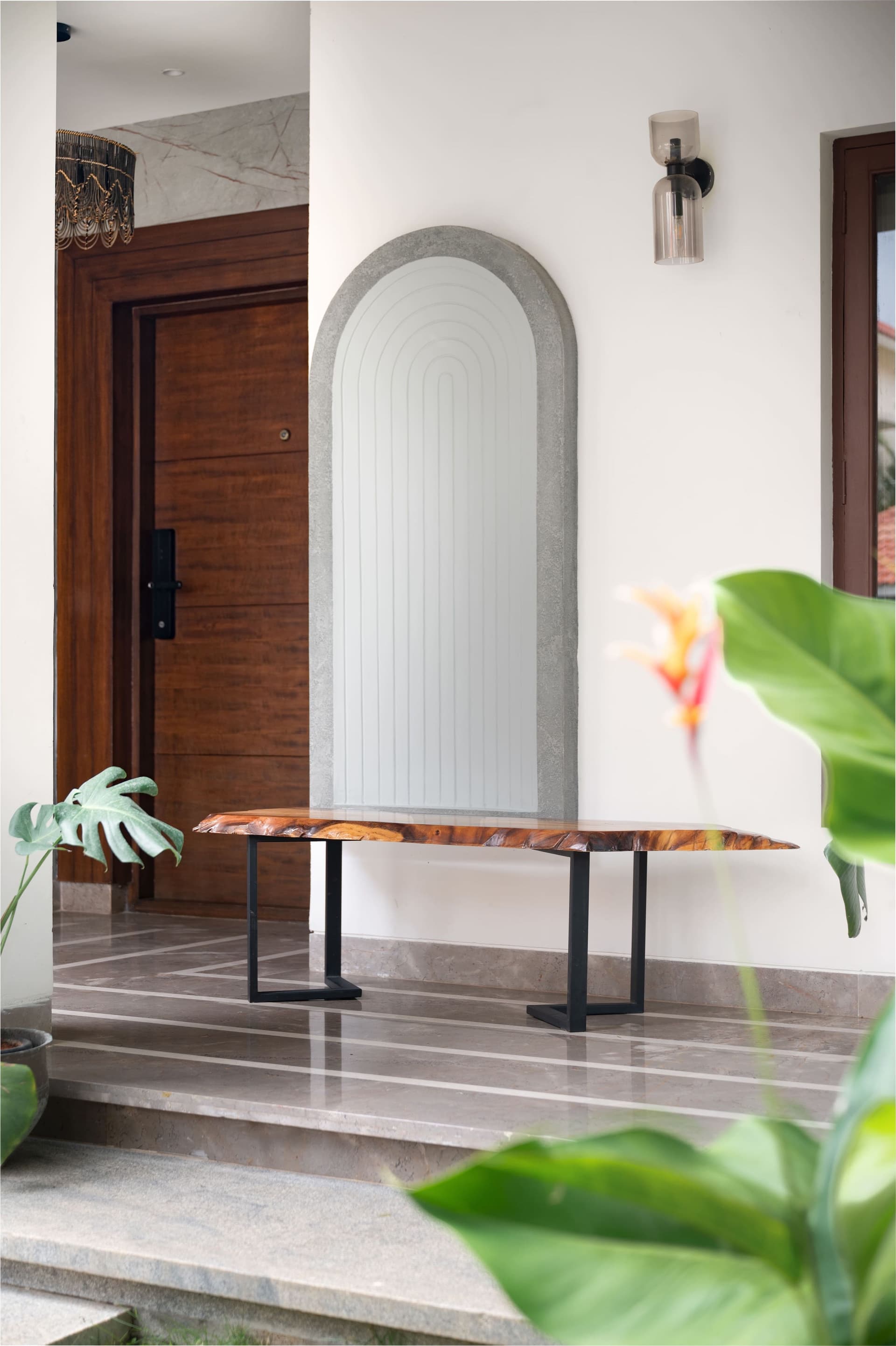 From the moment one steps through the grand entrance, Masego sets the tone with an understated opulence that quietly commands attention. The cool interplay of cement, marble, and lush greenery juxtaposed with the warmth of Mangalore tiles creates an inviting prelude to the rich narrative within. A wooden bench and bird’s nest-inspired seating accentuate the entryway, offering moments of tranquility before entering the layered design story that unfolds beyond the doors.