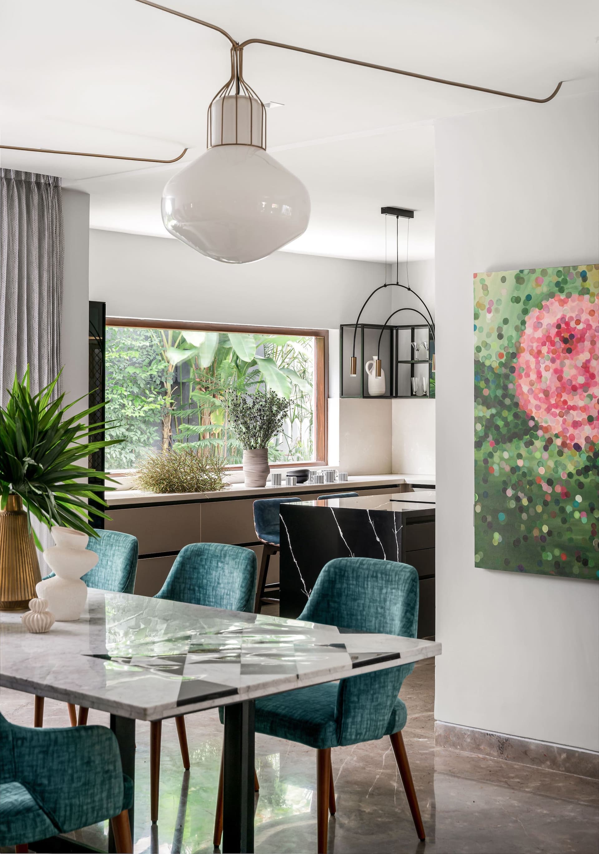 The dining area further enriches the narrative with a striking marble table surrounded by jewel-toned chairs, illuminated by a modern pendant light. A stenciled credenza adds an artistic flourish, effortlessly combining utility with elegance. Adjacent, the open kitchen exudes contemporary charm, with a sleek black island flanked by floral high chairs, making it an inviting hub for casual meals.