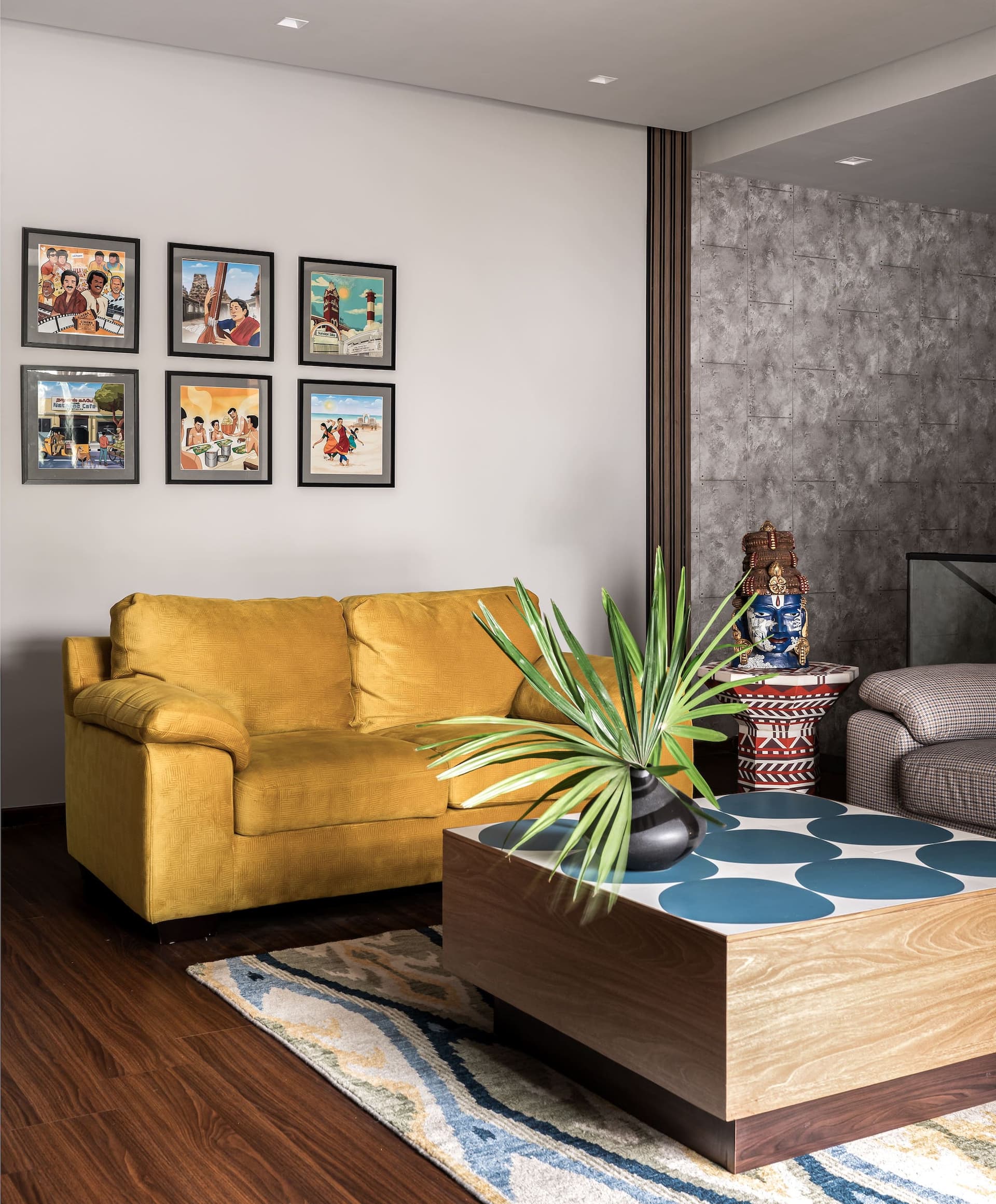 Layered with Personality and Purpose As the narrative flows upward, each space reveals a story deeply tied to its purpose and occupant. The family lounge is an explosion of energy and color, with a bold yellow sofa and teal accents that speak to the homeowner’s exuberant spirit. Tamil-inspired artwork and a Vishnu bust infuse cultural depth, while large windows frame views of verdant foliage, blurring the lines between indoors and outdoors.