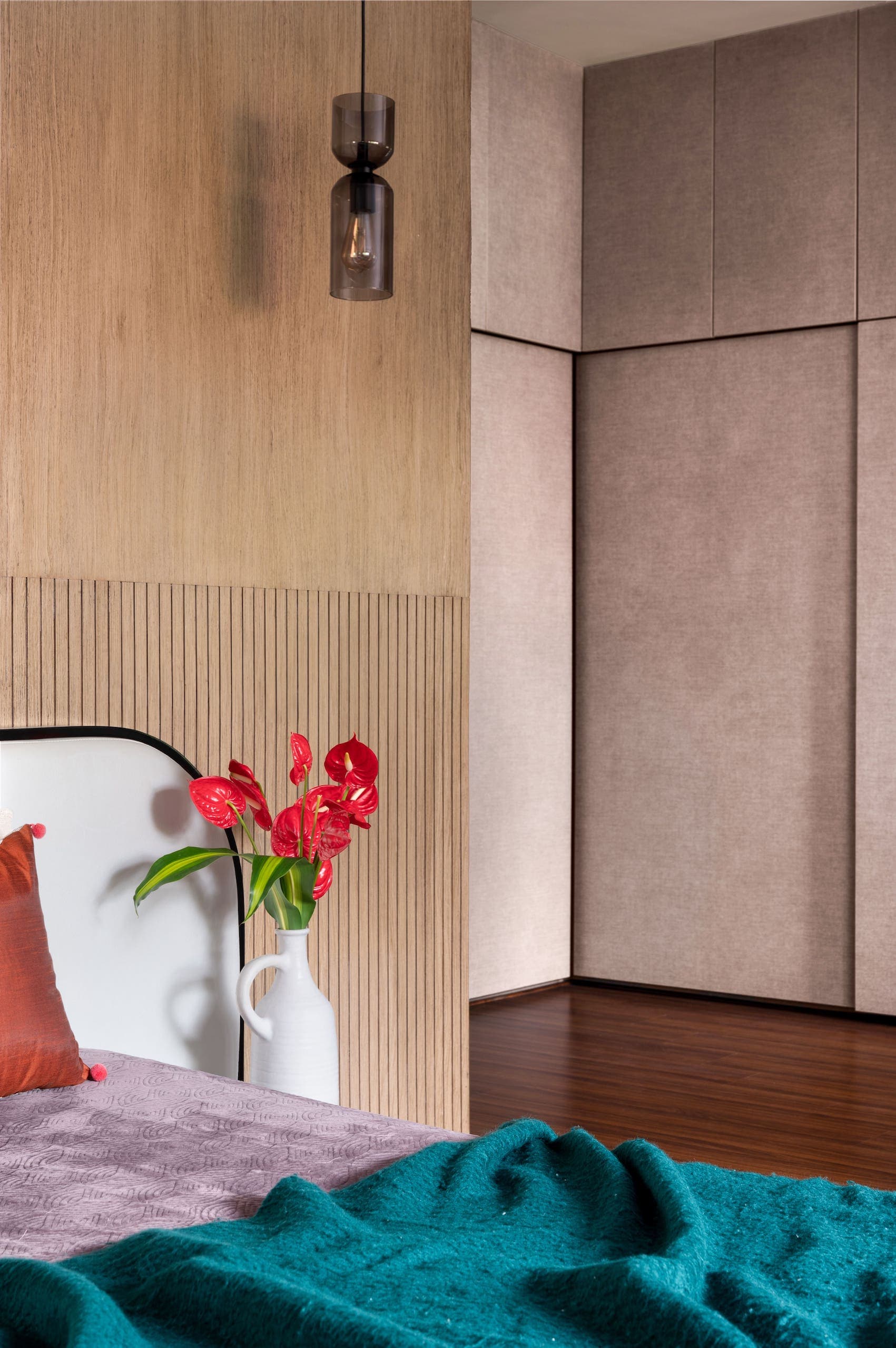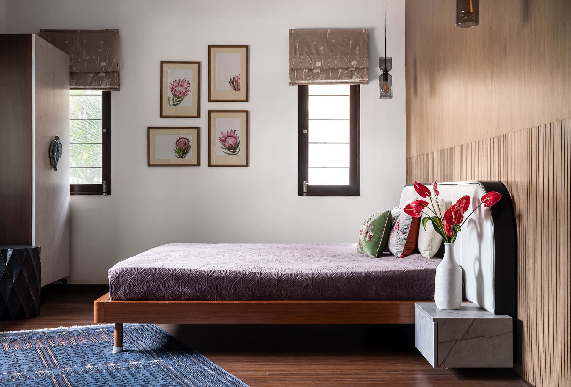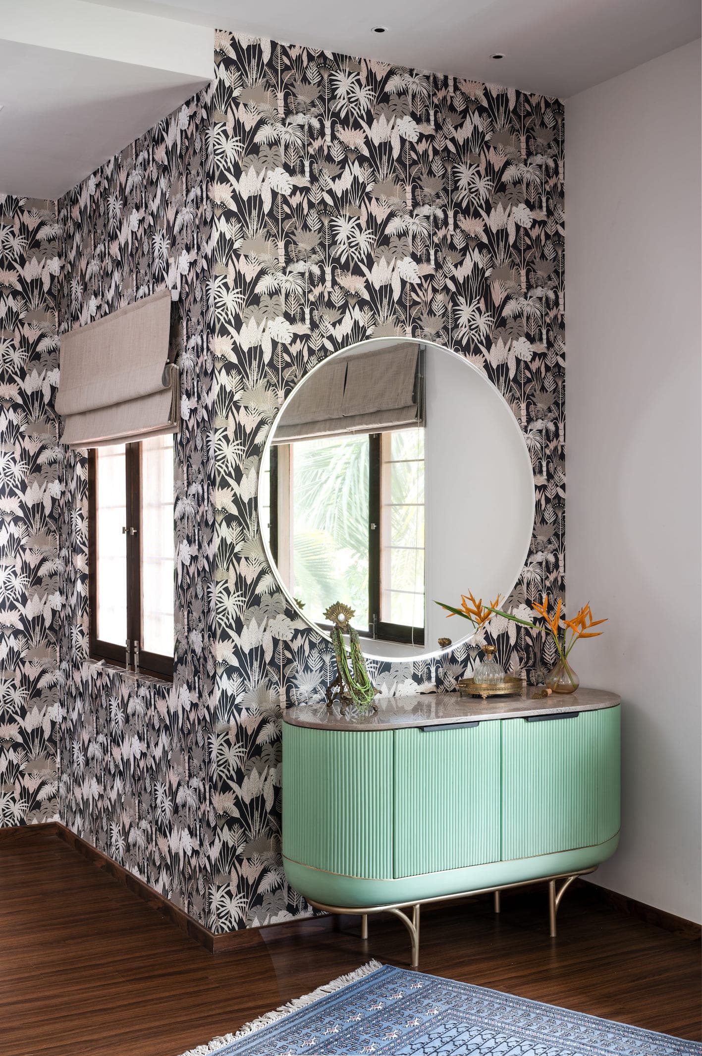 The bedrooms continue this intentional storytelling. The master bedroom is a haven of serenity, where muted tones, botanical wallpaper, and wooden paneling coalesce to create an atmosphere of understated luxury.