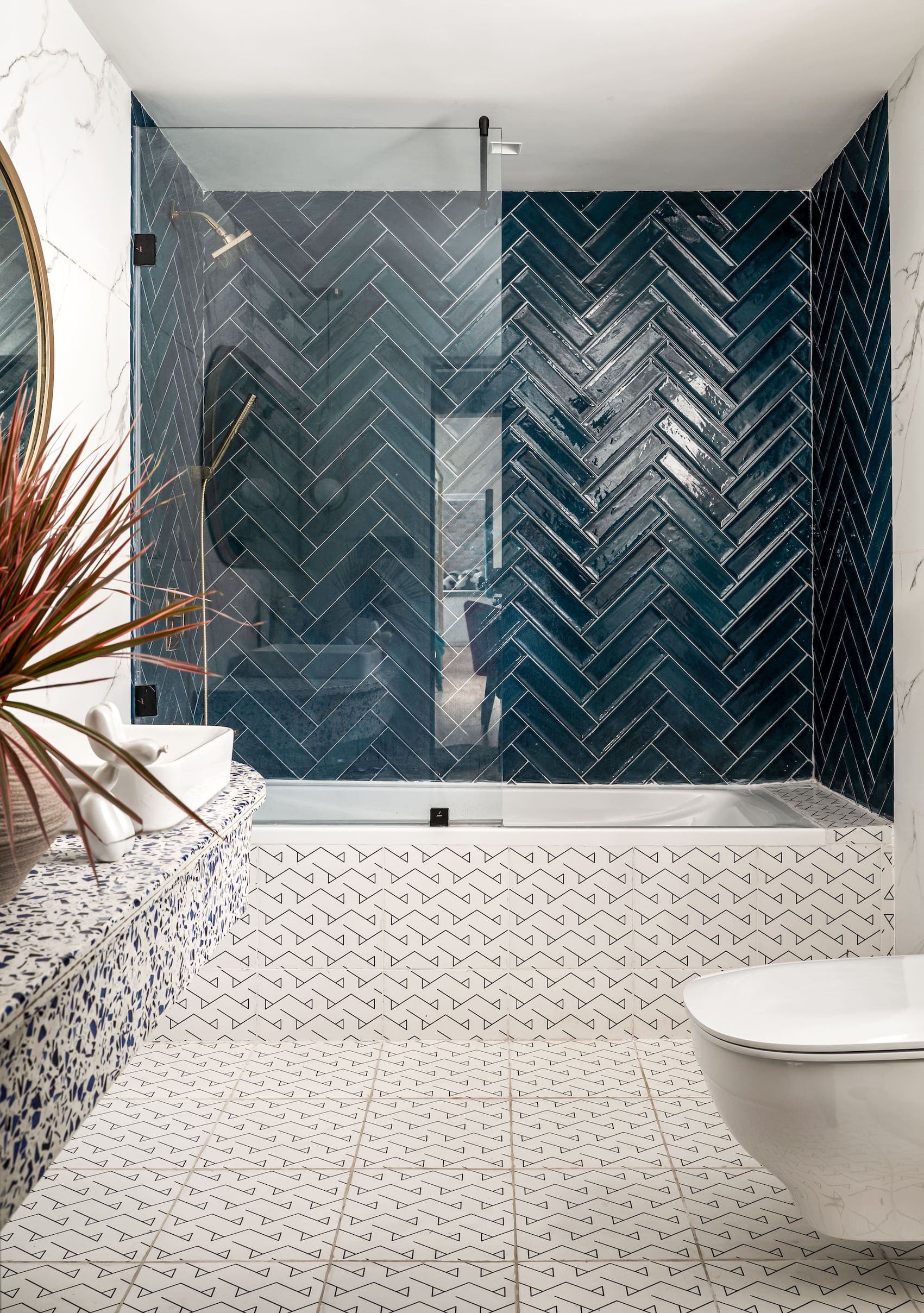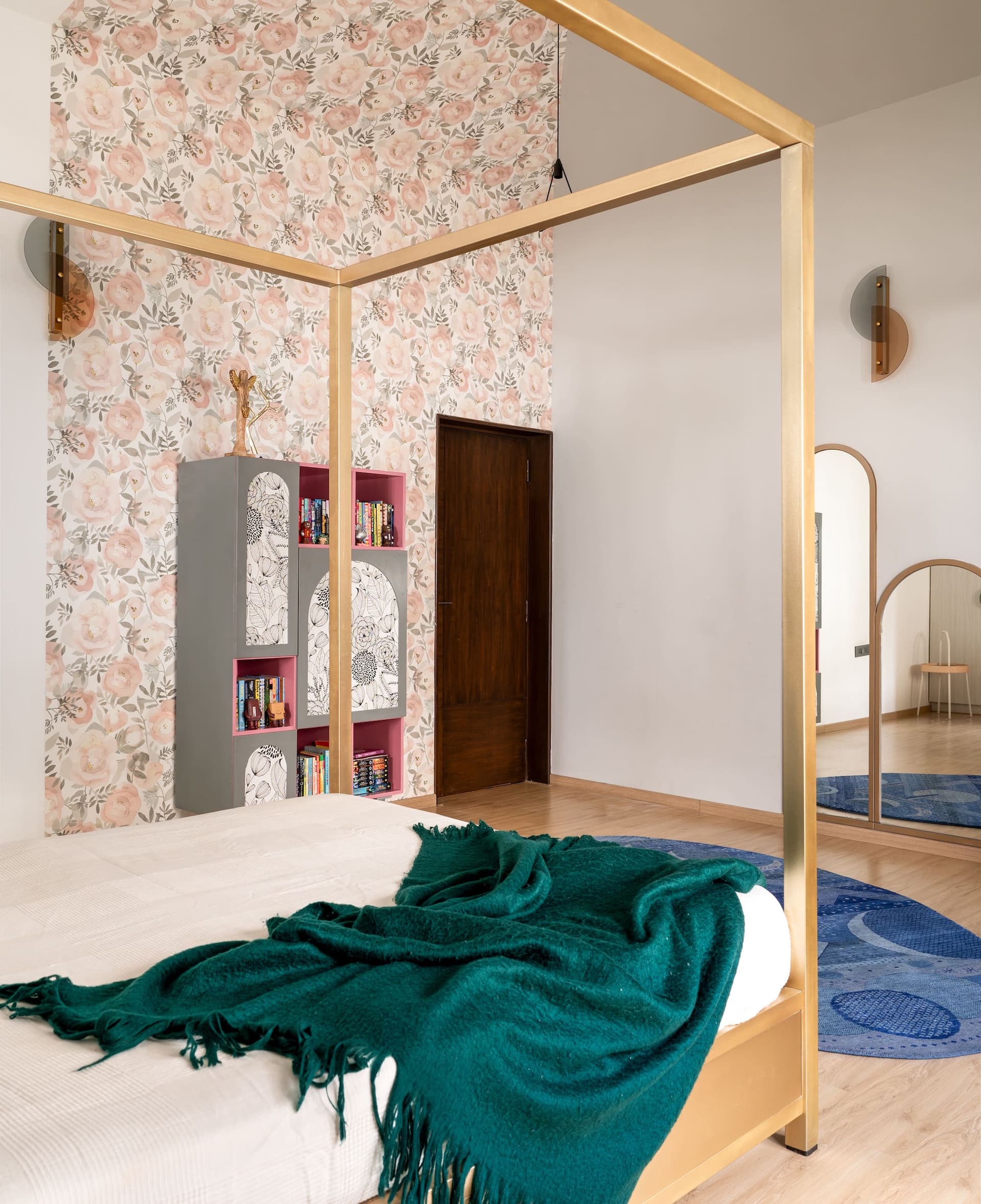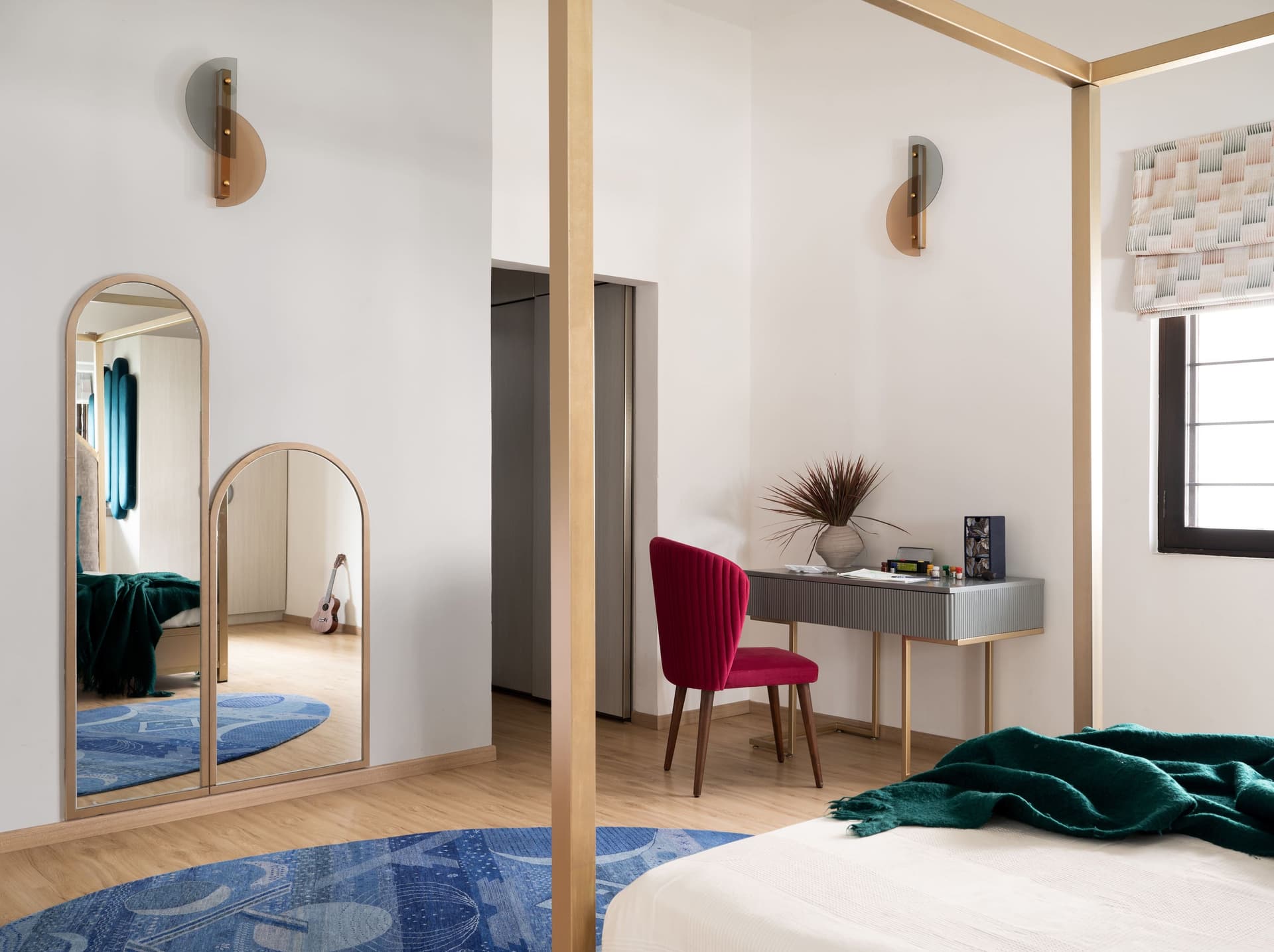 Meanwhile, the children’s rooms embrace their individuality: the son’s room leans toward Nordic minimalism with calming neutrals and deep blue accents, while the daughter’s room is a whimsical escape adorned with floral wallpaper, a jewel-toned four-poster bed, and playful patterns.
