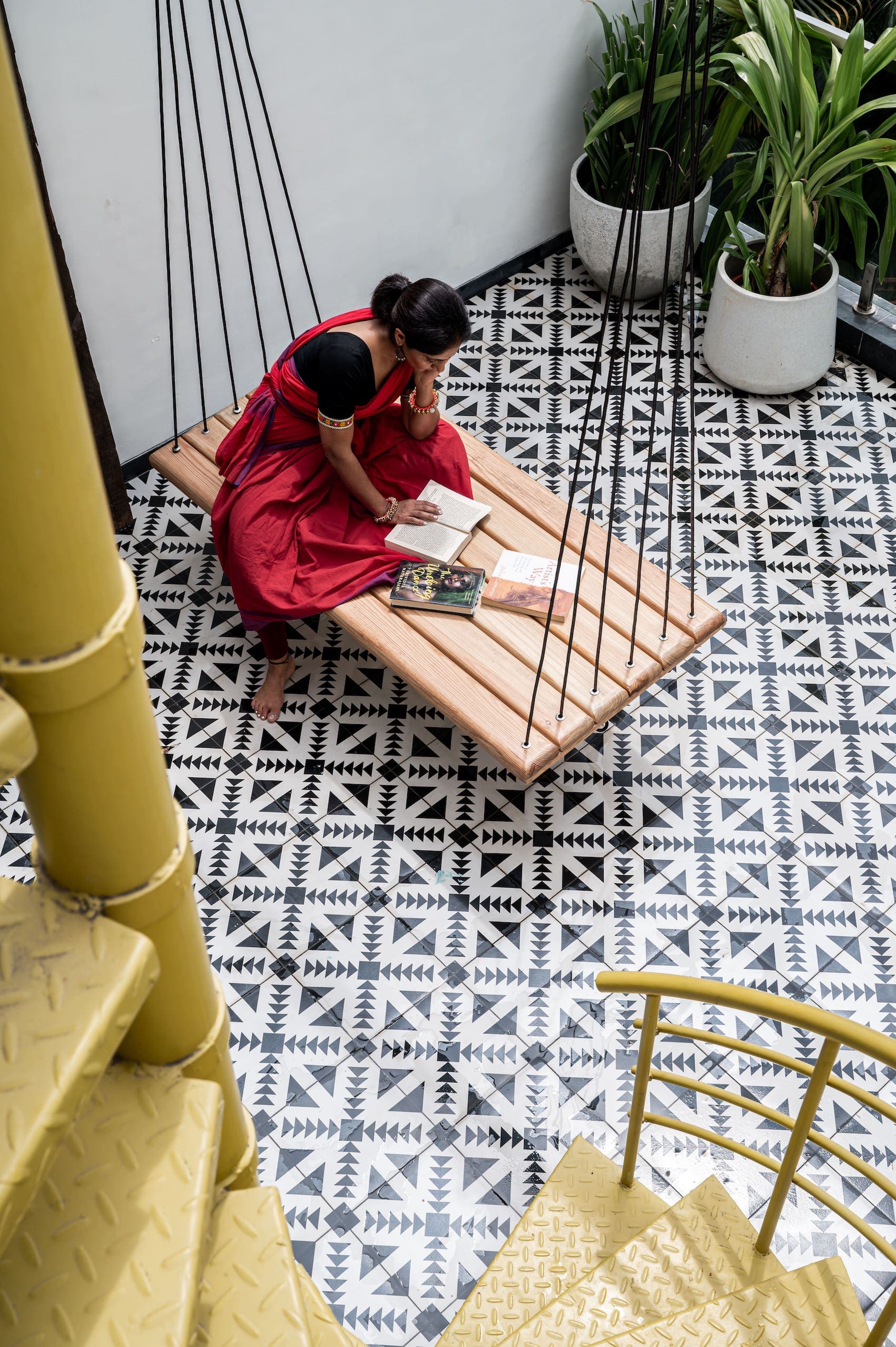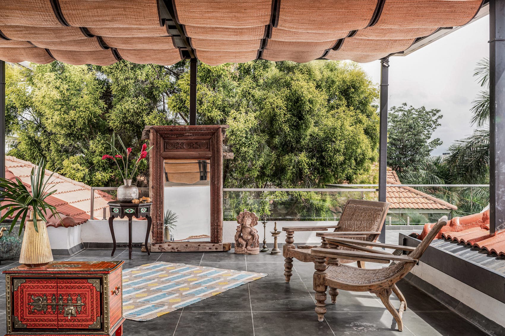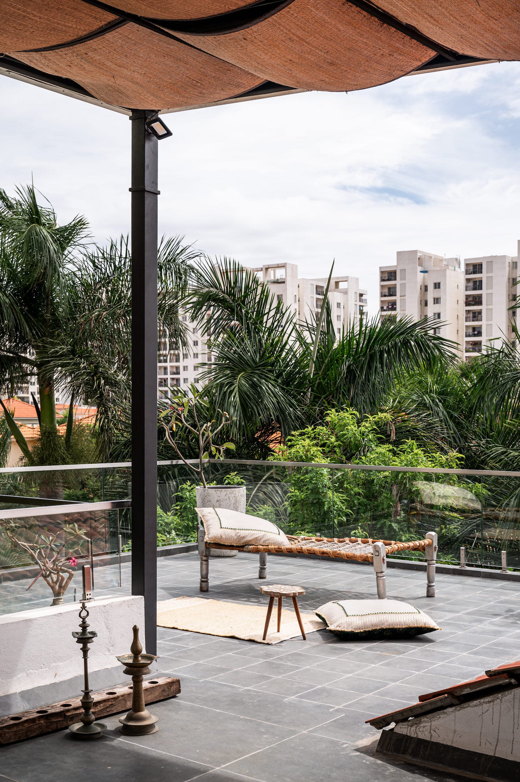 An Ode to Artistic Expression Outside, the first-floor balcony deck offers a tranquil interlude. A suspended swing surrounded by lush greenery invites quiet reflection, while a spiral yellow staircase ascends to the terrace. Here, the design reaches its crescendo in the dance studio, a space alive with the homeowner’s artistic essence. Antique wooden furnishings, intricately carved decor, and an open expanse of light converge to create an environment that celebrates the timeless beauty of Bharatnatyam.