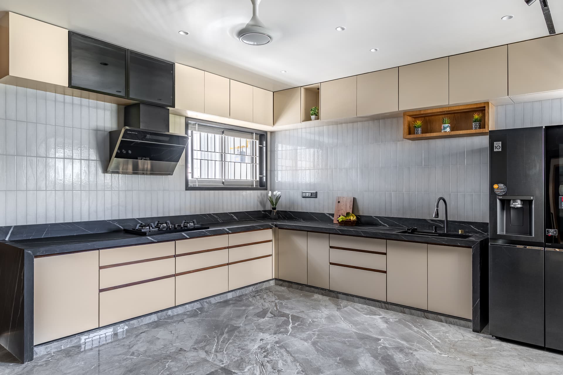 The kitchen, a dream space for any homemaker, balances ample space with inherent aesthetic beauty. Designed as a modular kitchen, it features reflective grey backsplash tiles for a sophisticated look and easy maintenance. Overhead cabinets and bottom modular drawers provide perfect storage solutions, while a black granite bracketed platform offers ample prep and cooking space.