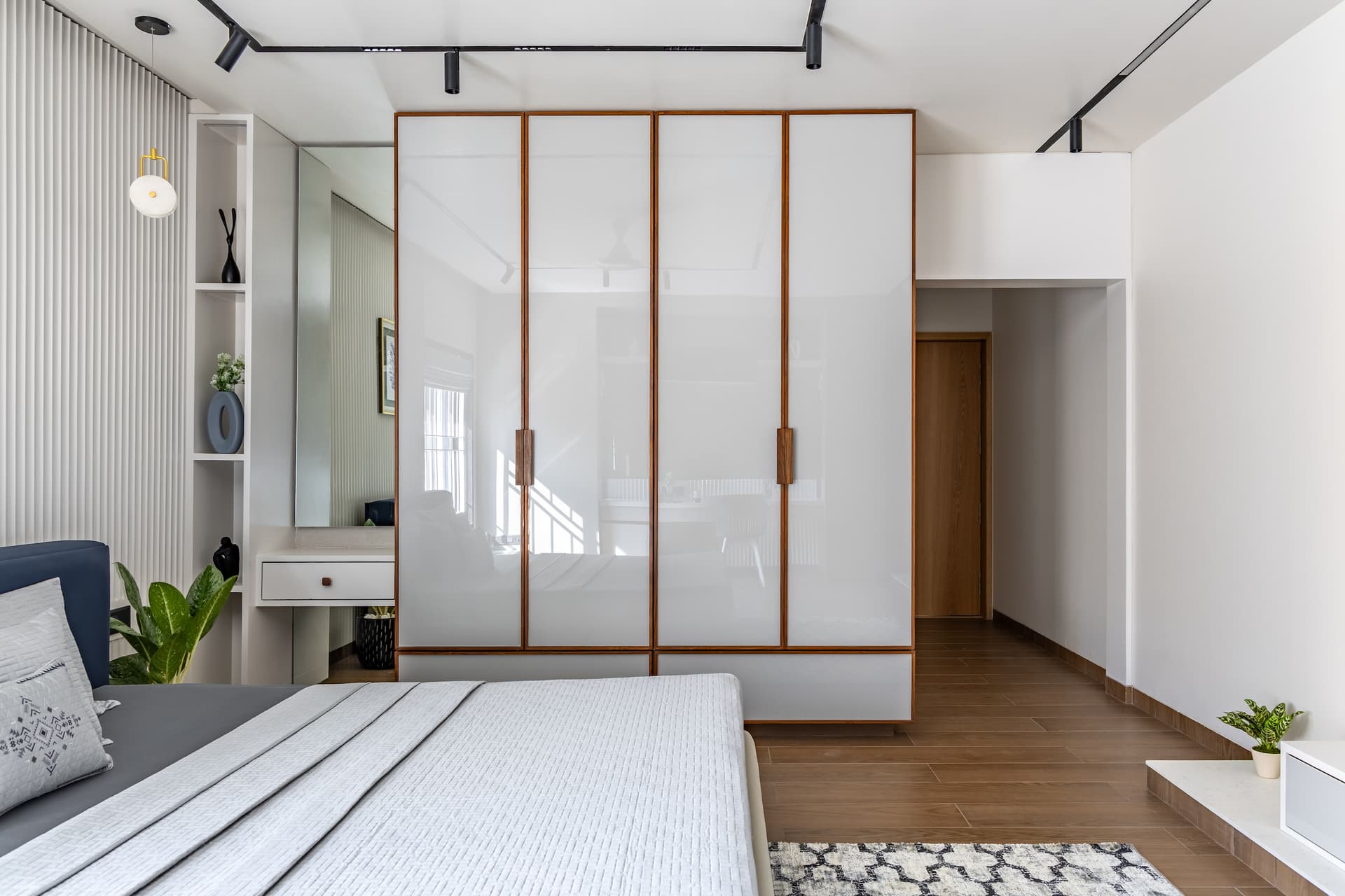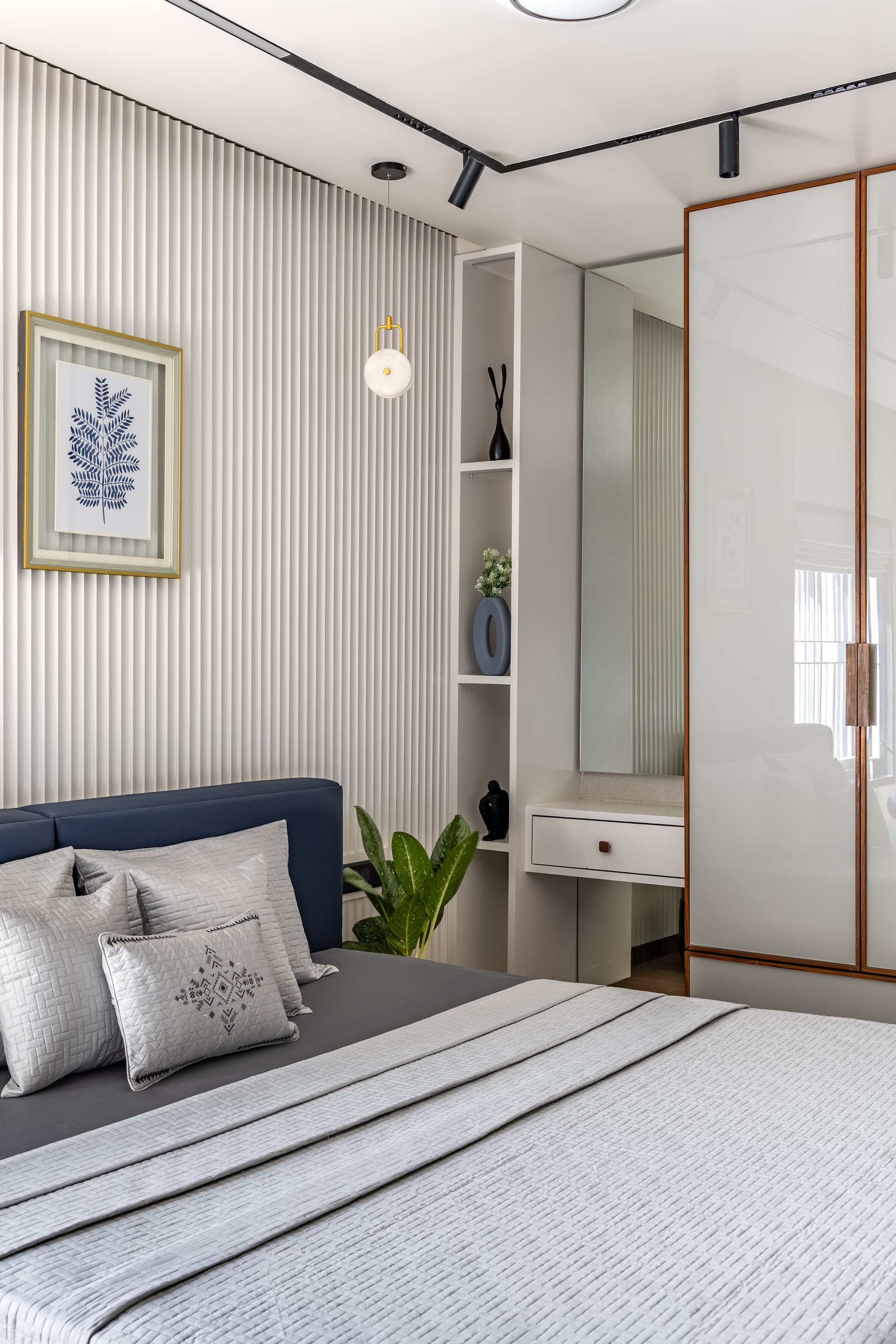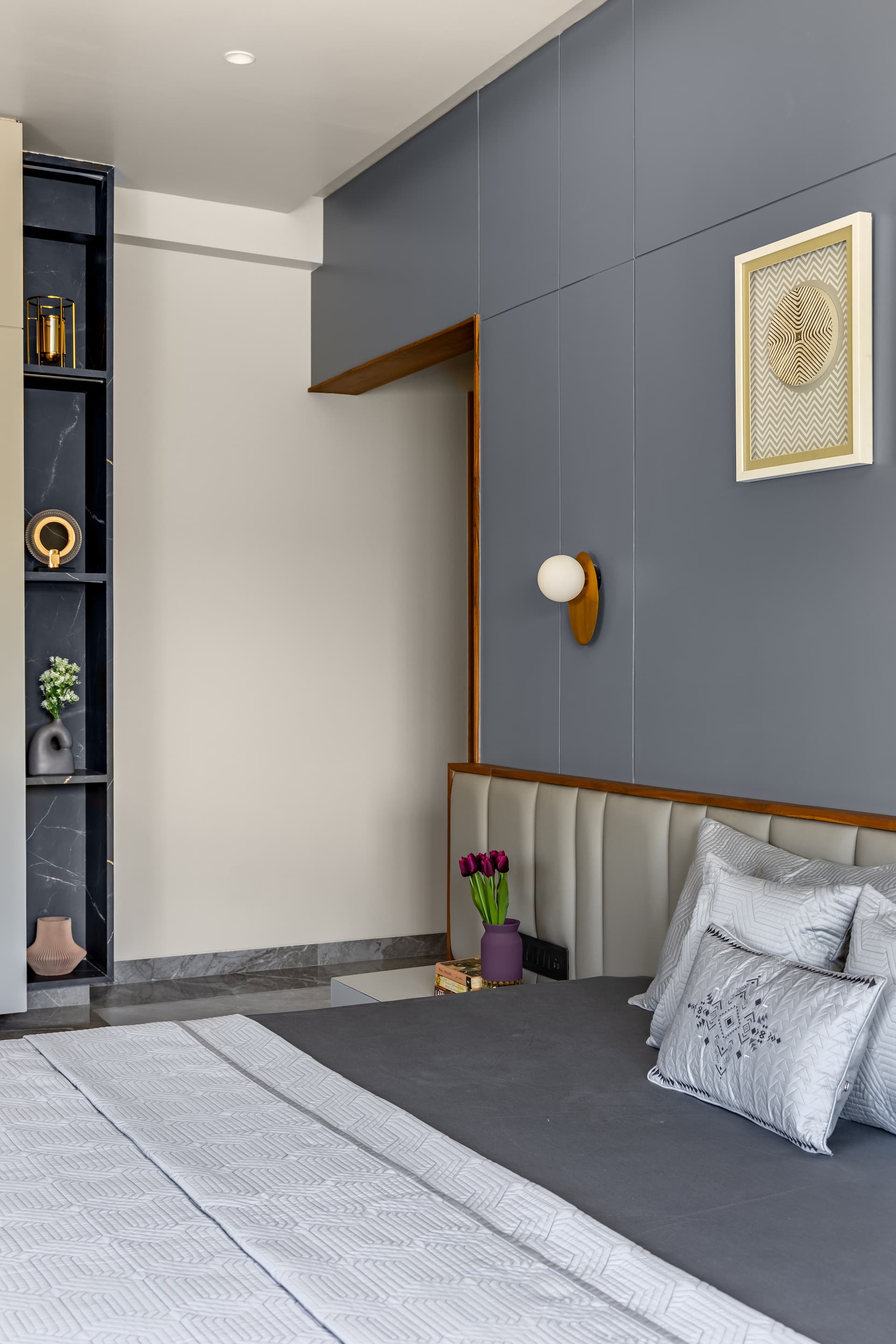 The parents’ bedroom mirrors the children’s room’s colour theme, with white as the primary colour and steel-blue as the secondary. A beautifully panelled wall behind the bed complements the half-panelled study area, which features a floating desk supported by a cabinet and topped with floating shelves. A tiny window in the study promises natural light for reading or writing. Full-sized closets provide a base for the dressing area and an adjoining cubby-hole display.
