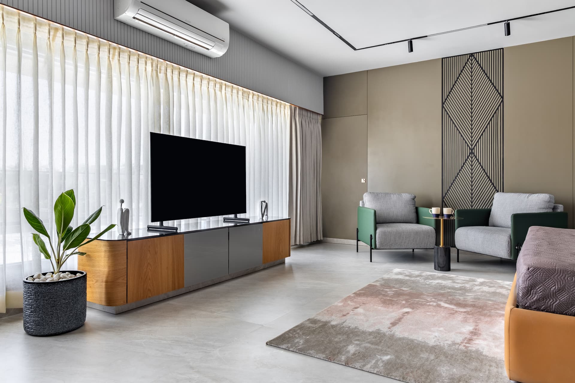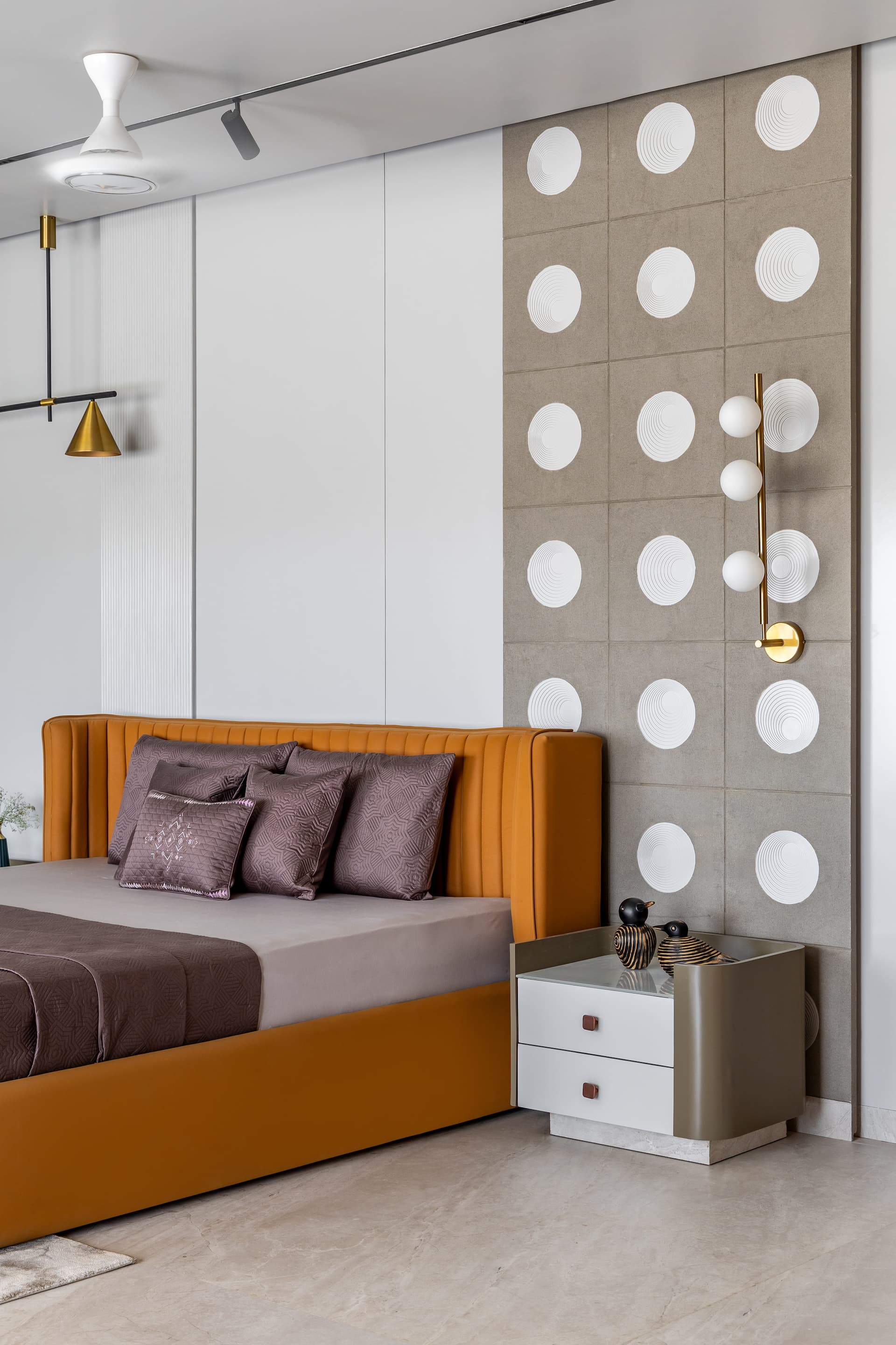 The master bedroom exudes earthy tones, with a lustrous chocolate-colored wall set against a white adjacent wall showcasing intricate MDF designs. A sandstone brown upholstered box bed and headboard match the wooden laminates on the TV unit. Chequered chairs and a petite coffee table in the lounging area offer a perfect spot for relaxation, while task lighting atop the bedside table adds a chic touch.