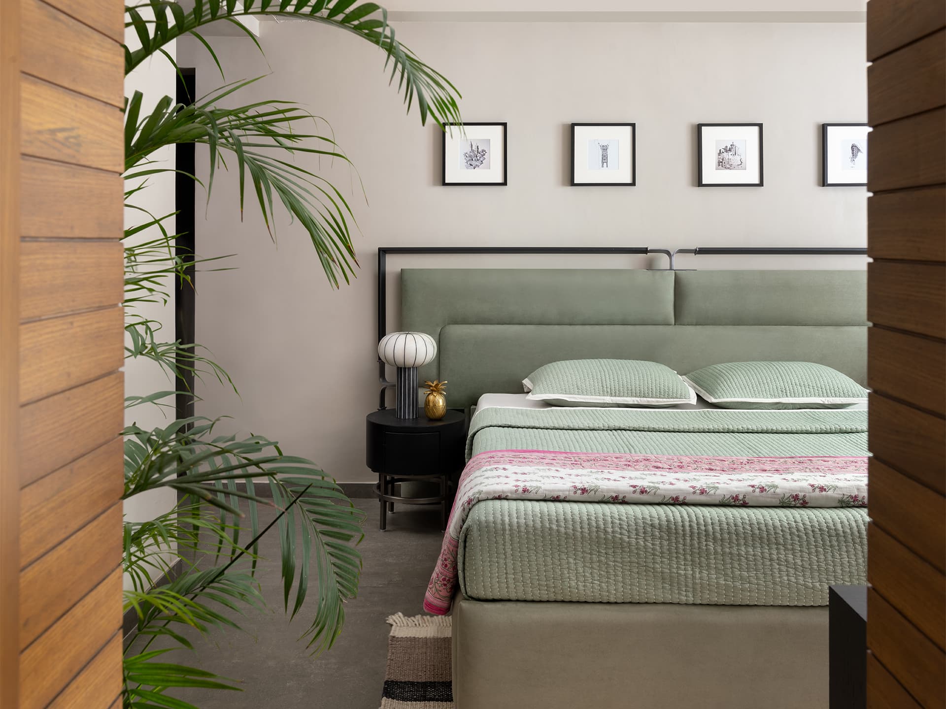 The master bedroom follows suit, embracing modern minimalism with a monochromatic palette and geometric accents that lend depth to the decor. Clean lines and muted tones establish a serene retreat, while plants interspersed throughout the home soften the stark edges, subtly bridging the outdoors with the interiors. The result is a living space that is as inviting as it is sophisticated.